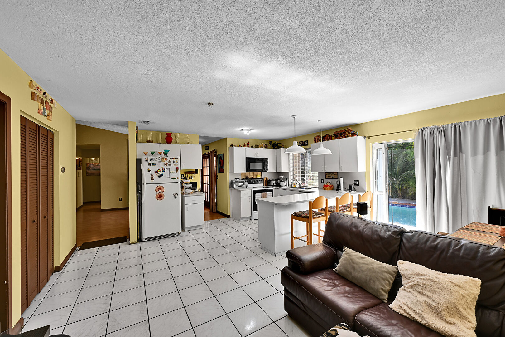 Baseboards Wall, Drywall, G Shaped Kitchen, Kitchen Bar, Kitchen Peninsula, Natural Light, Opens To Living Area, Pendant Lighting, Textured Ceiling, Tile Floor, Toaster, U Shaped Kitchen, Vent, Baseboards Wall, Drywall, Tile Floor