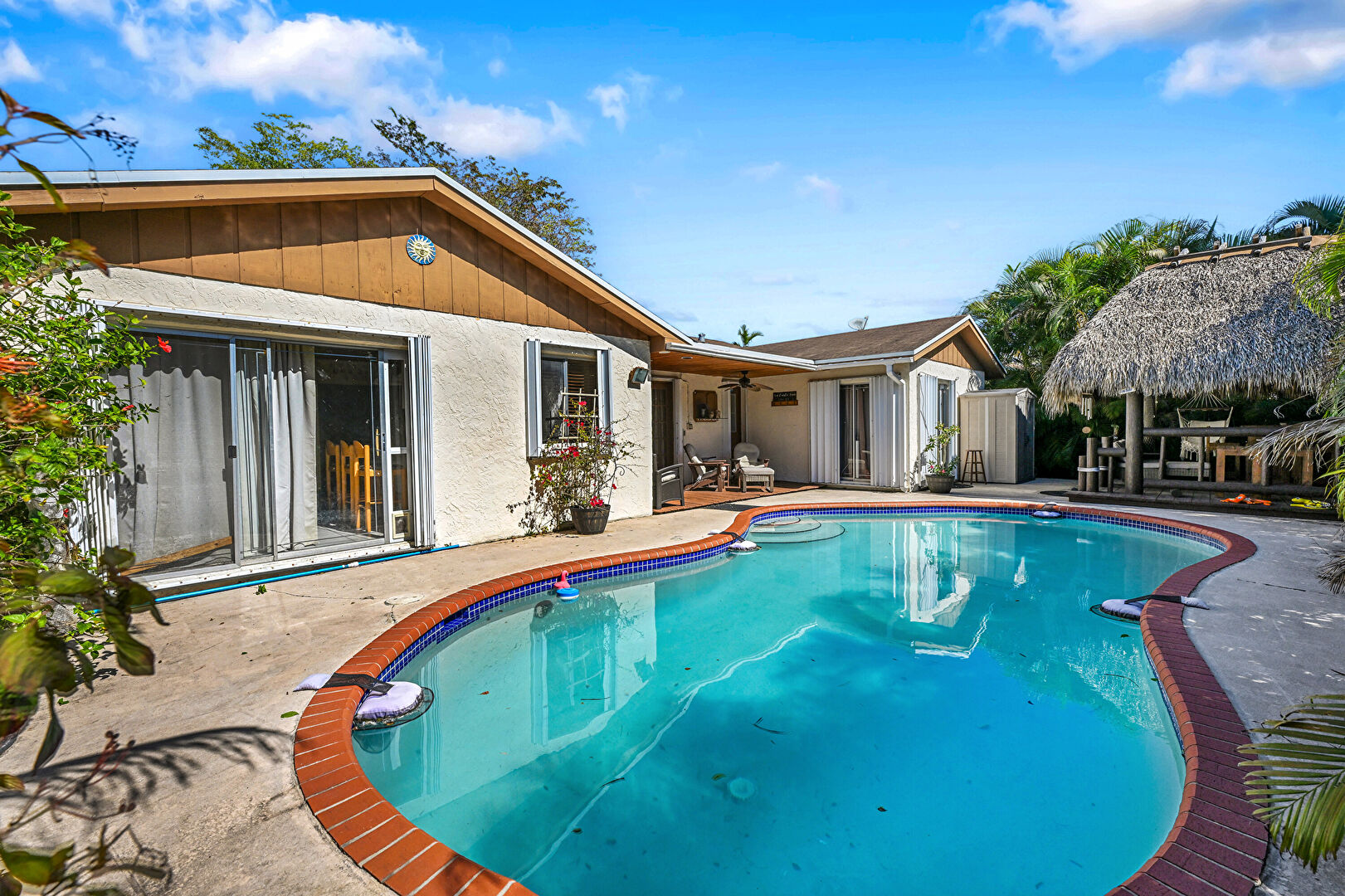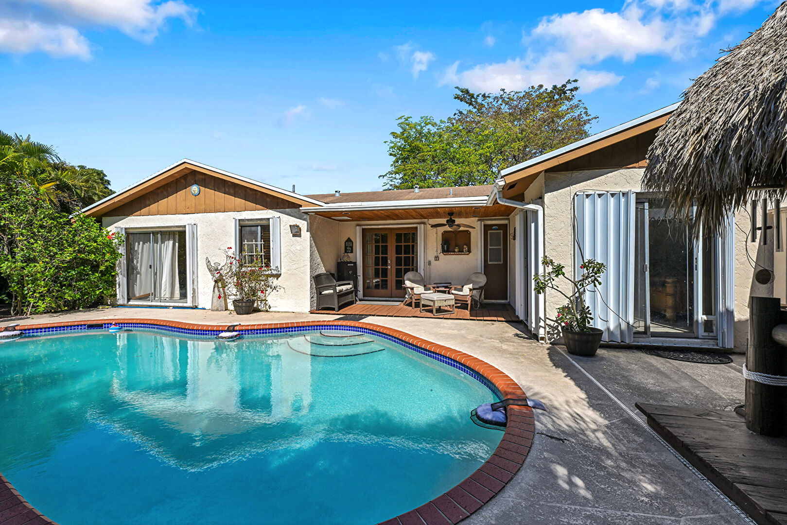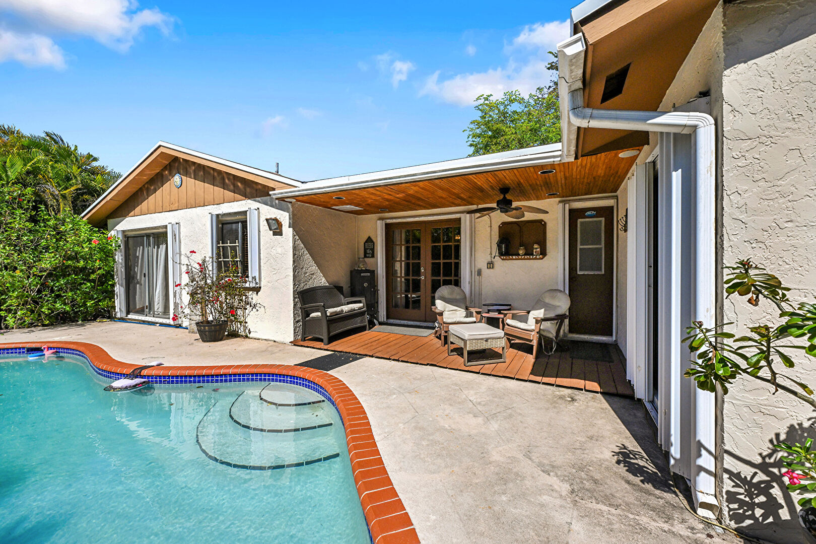 Ceiling Fan, Downspout, French Doors, Gutters, Outdoor Living Space, Pool, Stucco Siding, Patio