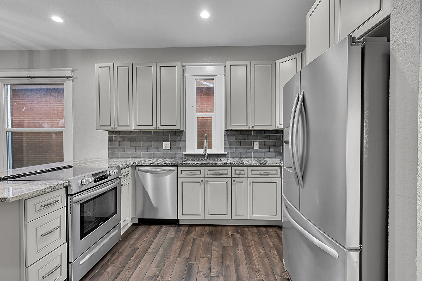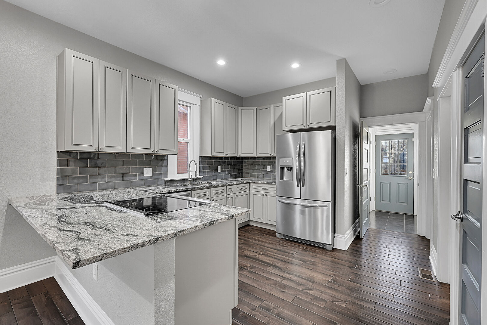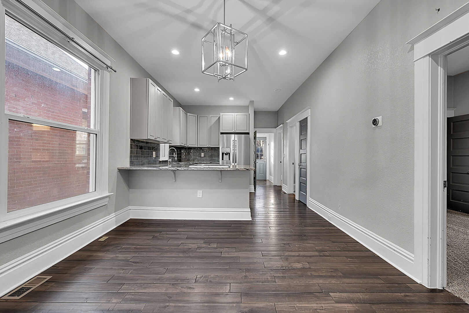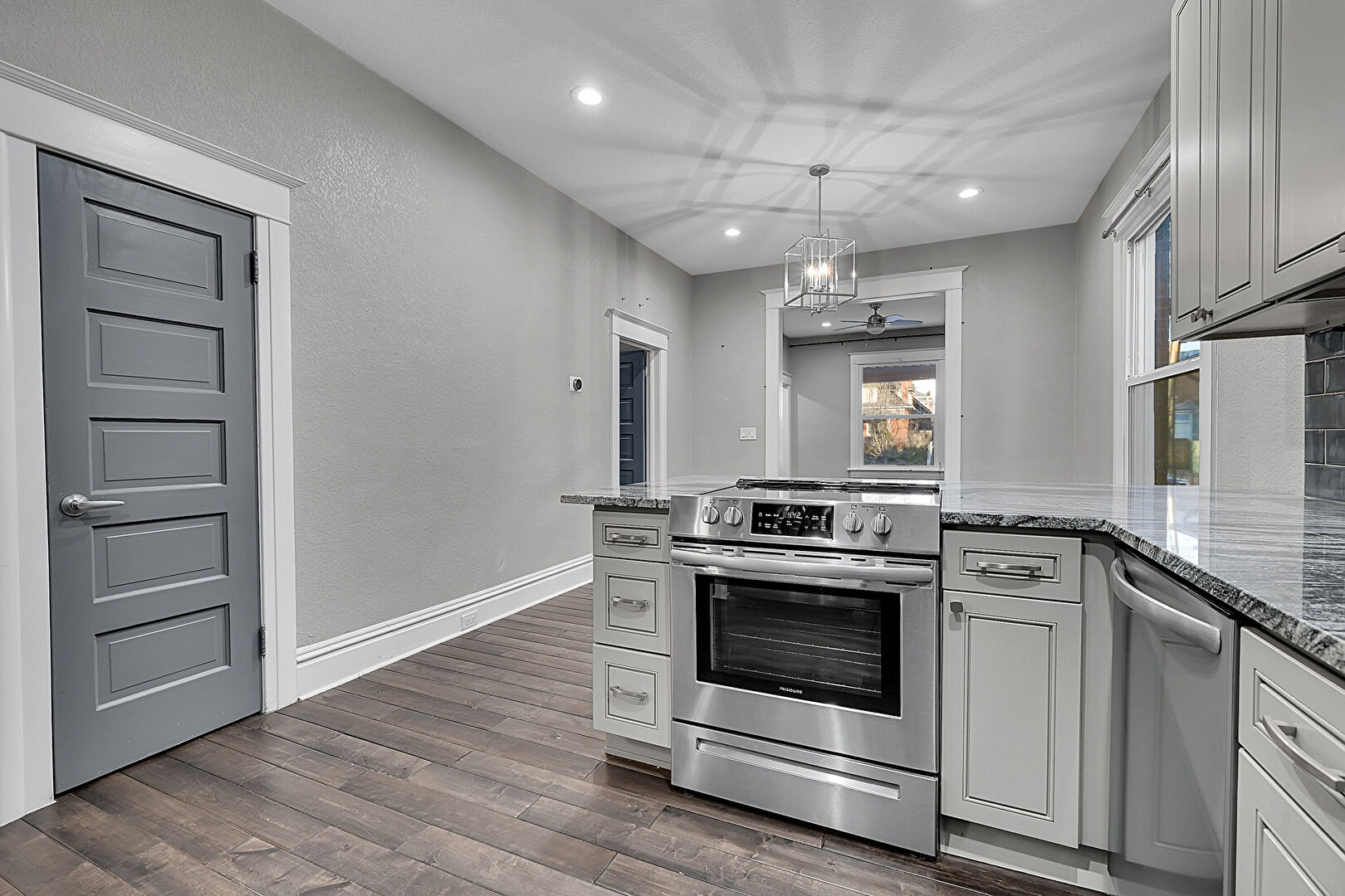 Baseboards Wall, G Shaped Kitchen, Gray Cabinets, Kitchen Bar, Kitchen Peninsula, Natural Light, Notable Chandelier, Pass Through Window, Pendant Lighting, Raised Cabinets, Recessed Lighting, Shaker Cabinets, Stone Countertops, Textured Wall, U Shaped Kitchen, Vent, Wood Finish Floor, Baseboards Wall, Kitchen Peninsula, Natural Light, Stone Countertops