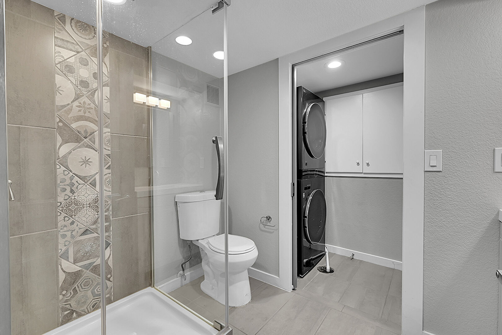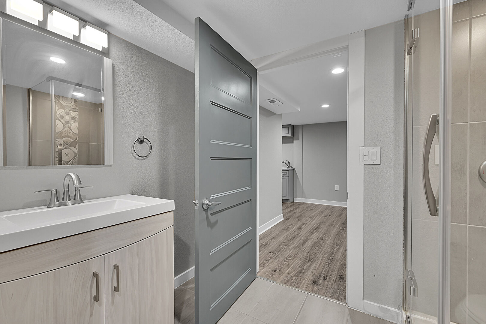 Baseboards Wall, Full Bathroom, Laundry, Recessed Lighting, Textured Wall, Tile Floor, Vanity, Vent, Recessed Lighting, Wood Finish Floor
