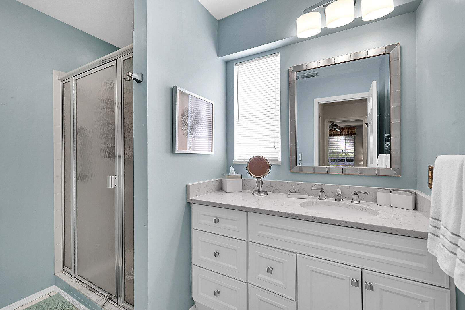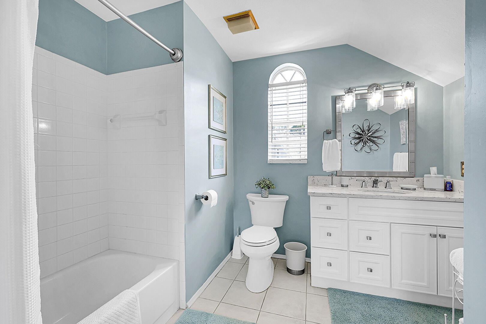 Baseboards Wall, Combined Bath Shower, Drywall, Full Bathroom, Half Bathroom, Natural Light, Tile Floor, Vanity, Vaulted Ceiling, Vanity, Vent