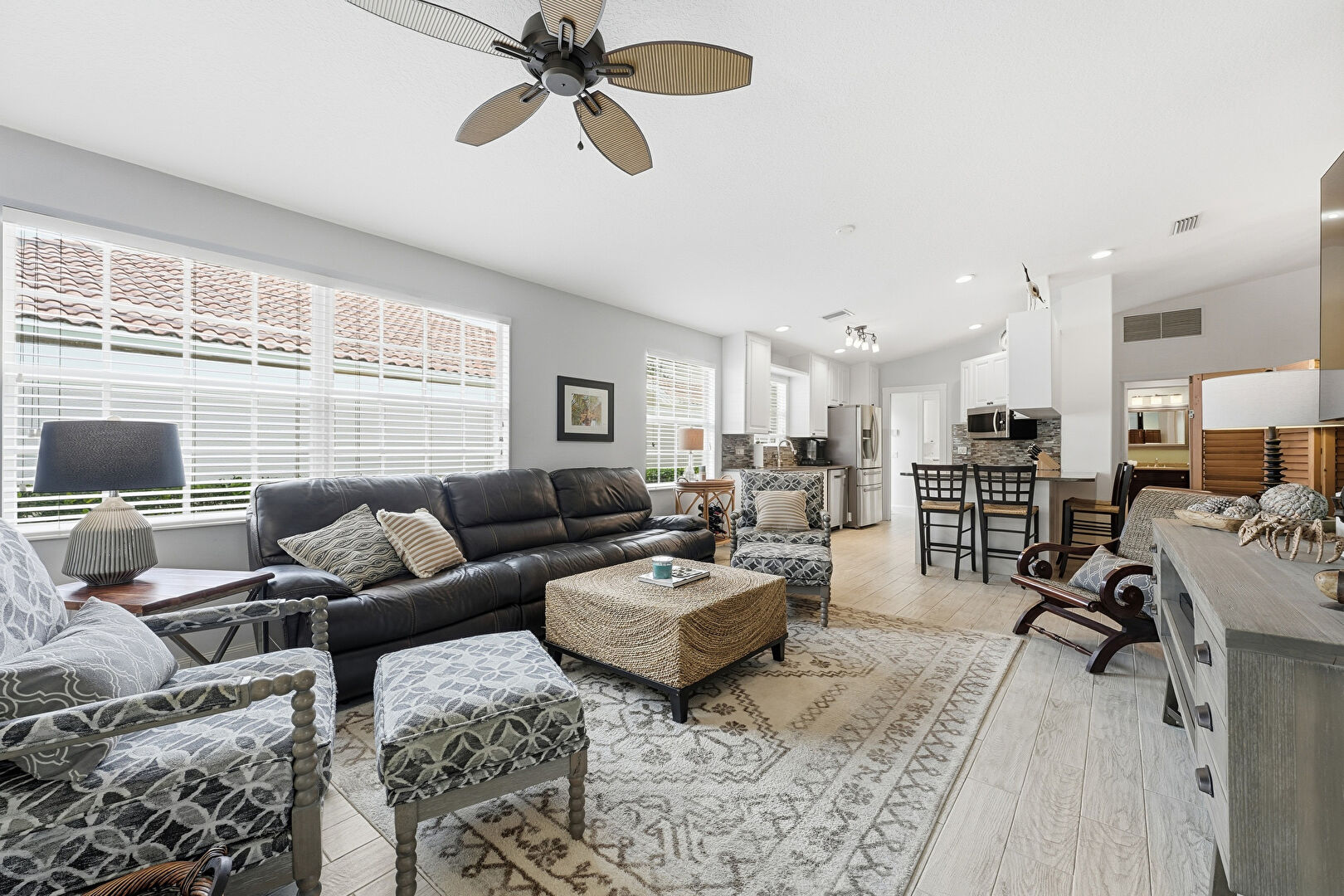 Baseboards Wall, Ceiling Fan, Drywall, High Ceiling, L Shaped Kitchen, Natural Light, Recessed Lighting, Vaulted Ceiling, Vent, Wood Finish Floor, Natural Light, Vaulted Ceiling, Vent