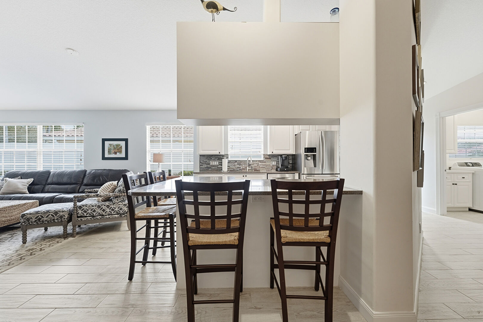 Baseboards Wall, Ceiling Fan, Drywall, G Shaped Kitchen, High Ceiling, Kitchen Bar, Kitchen Peninsula, Laundry, Natural Light, Opens To Living Area, Raised Cabinets, Recessed Lighting, Stone Countertops, Vaulted Ceiling, Vent, Washer Dryer, Wood Finish Floor, Drywall, Raised Cabinets, Stone Countertops
