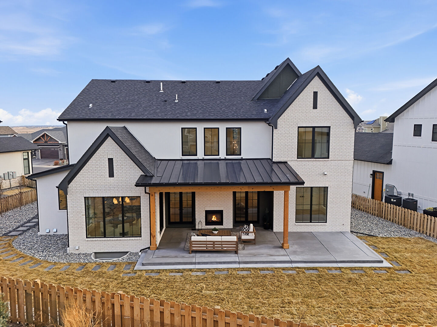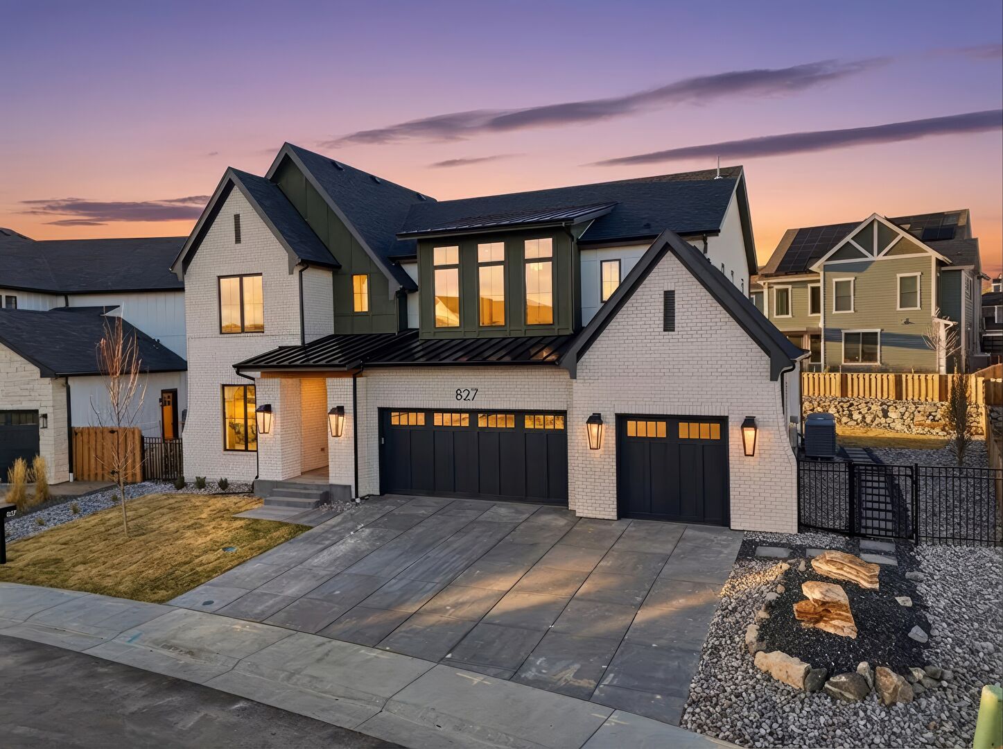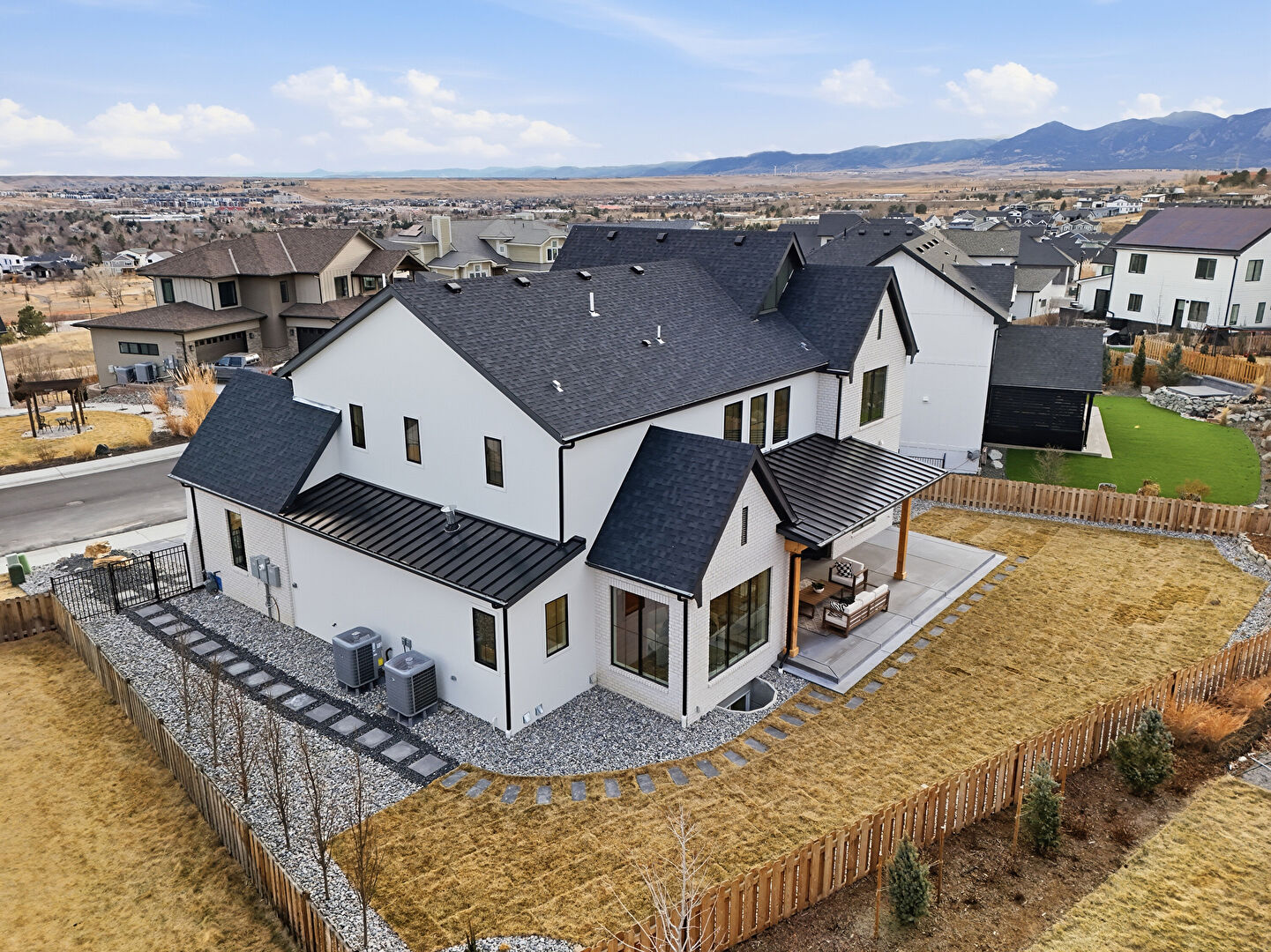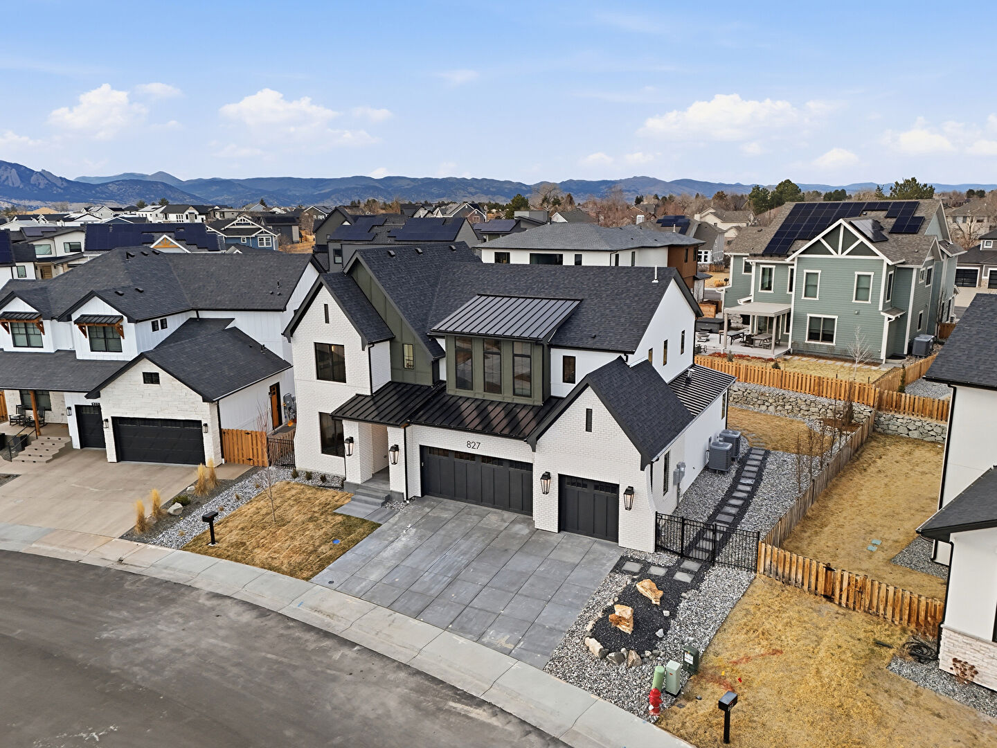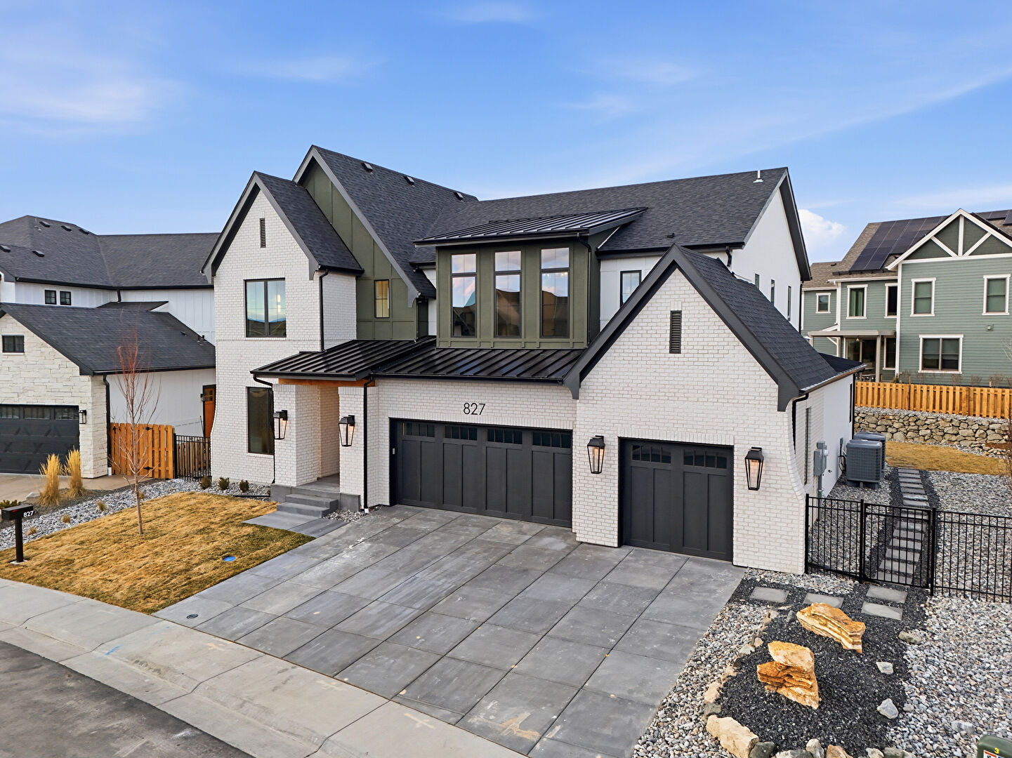 Board Batten Siding, Brick Siding, Built In Garage, Central Ac, Concrete Foundation, Downspout, Driveway, Fence, Gate, Gutters, Lawn, Metal Roof, Mountain View, Porch, Residential View, Shingle Roof, Solar Panels, Standing Seam Roof, Stoop, Vertical Siding, Central Ac, Concrete Foundation, Driveway, Fence, Lawn, Metal Roof, Stoop, Vertical Siding