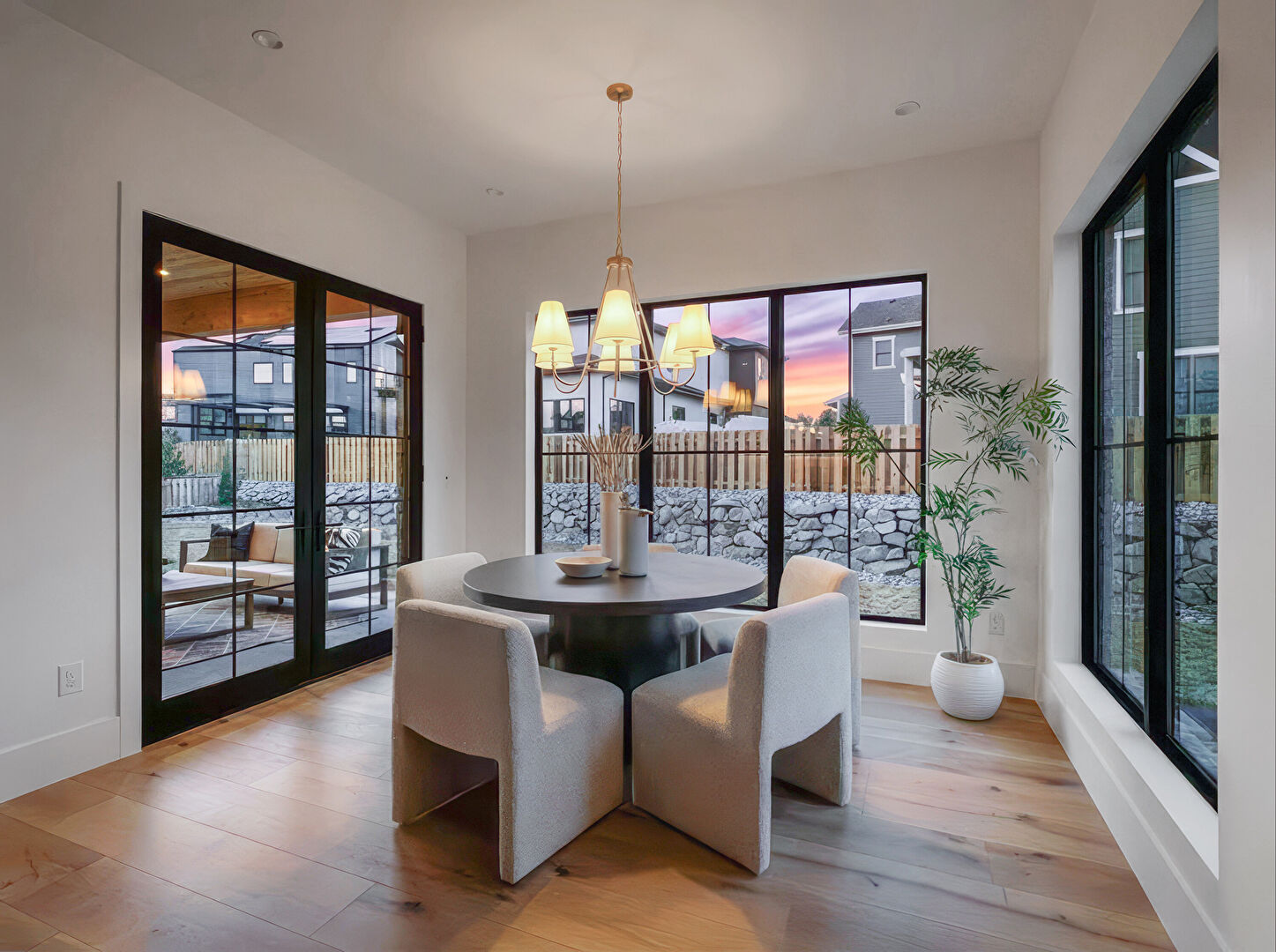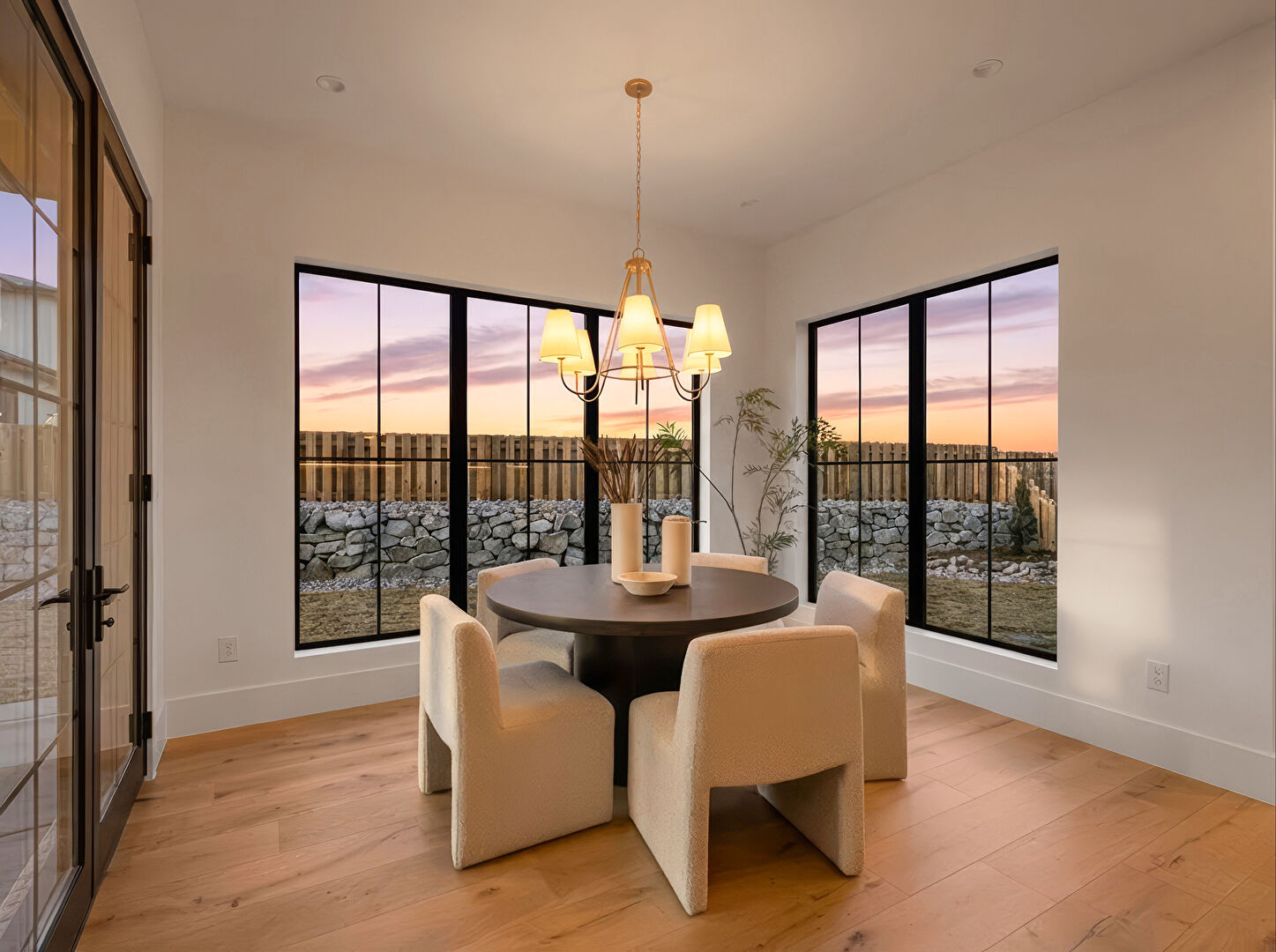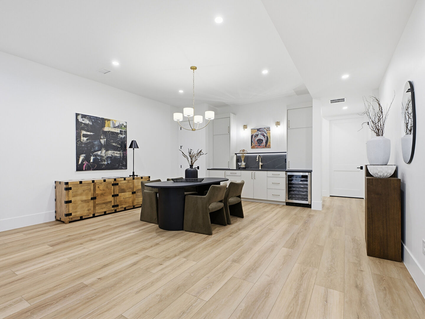 Baseboards Wall, Drywall, Natural Light, Notable Chandelier, Wood Finish Floor, Recessed Lighting