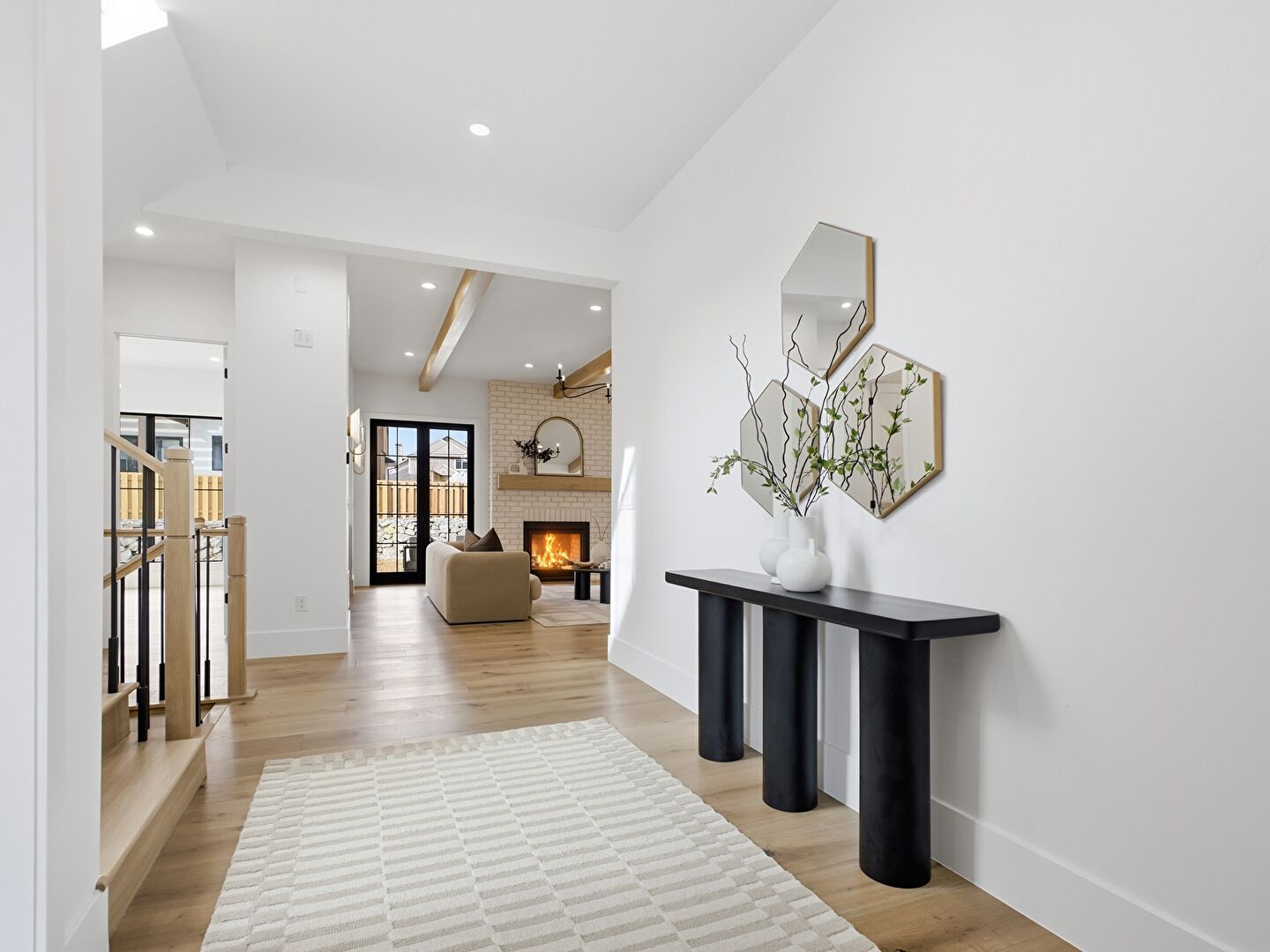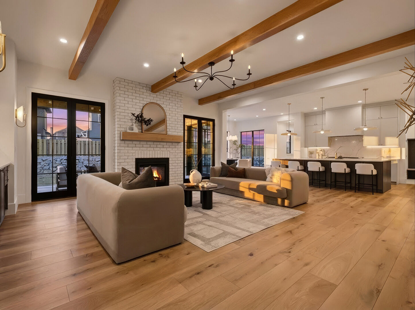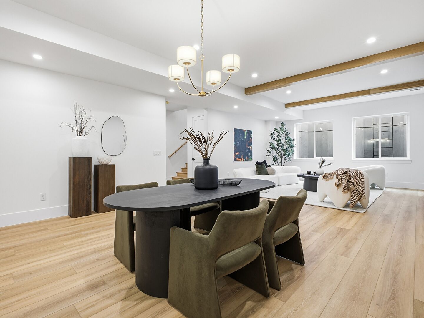 Baseboards Wall, Beamed Ceiling, Drywall, Fireplace, Natural Light, Notable Chandelier, Recessed Lighting, Stairs, Wood Finish Floor, Baseboards Wall, Drywall, Notable Chandelier, Wood Finish Floor