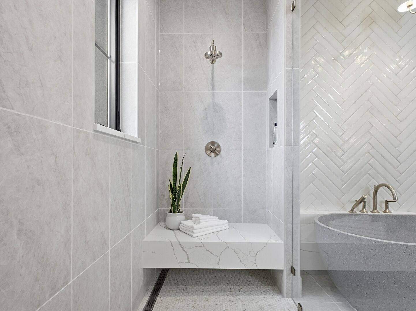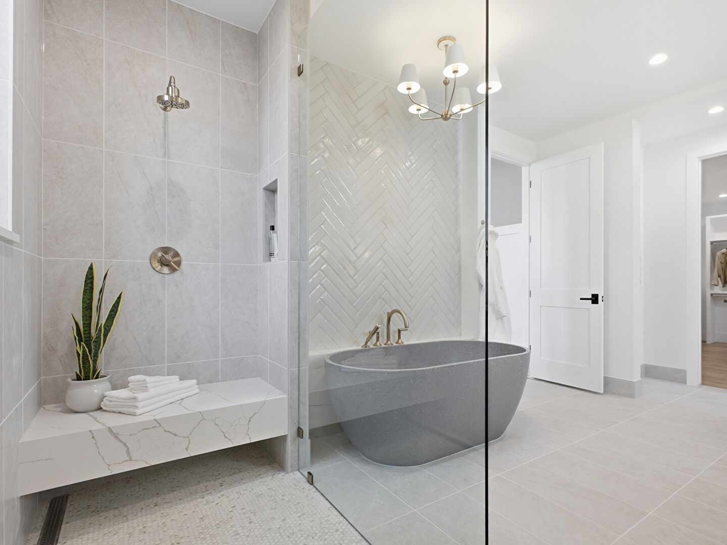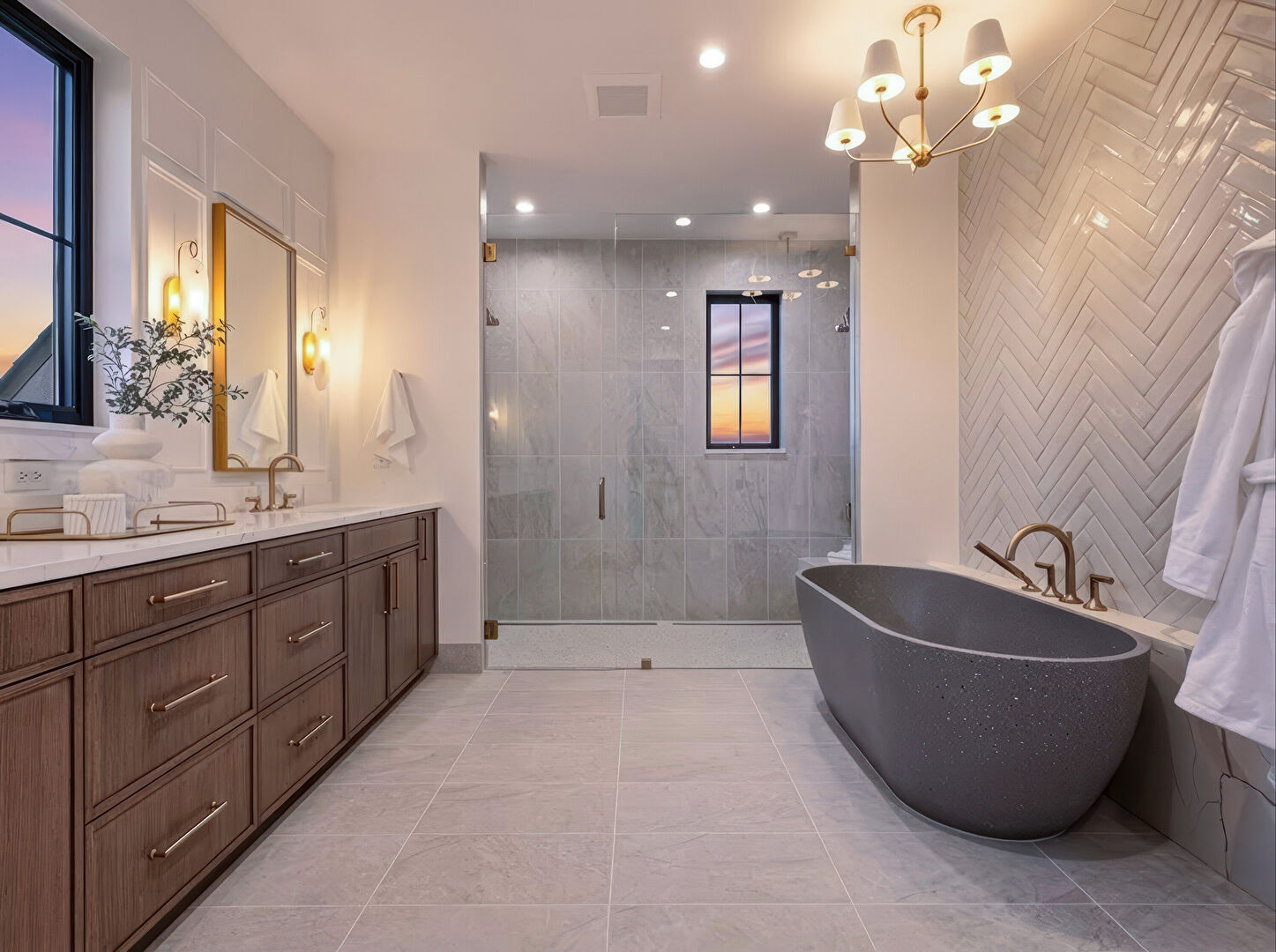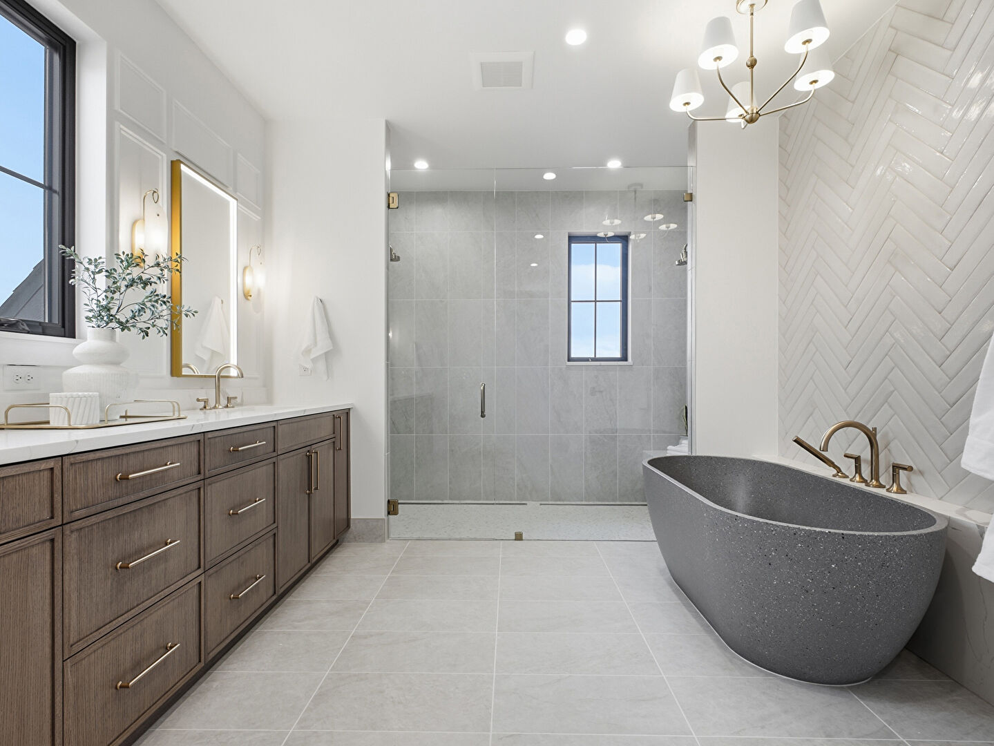 Baseboards Wall, Combined Bath Shower, Double Vanity, Drywall, Full Bathroom, Marble Finish Floor, Natural Light, Notable Chandelier, Recessed Lighting, Tile Floor, Tile Wall, Vanity, Vent, Combined Bath Shower, Drywall, Full Bathroom, Notable Chandelier, Tile Floor, Vent