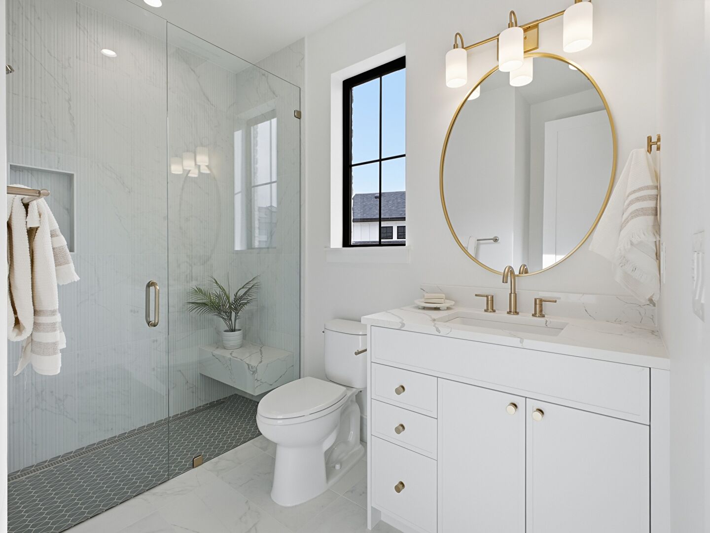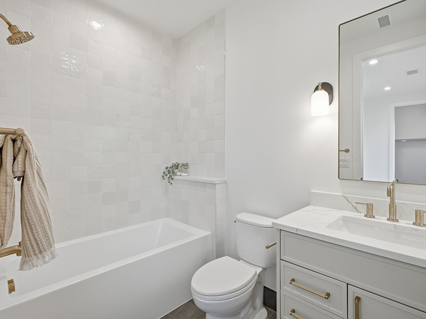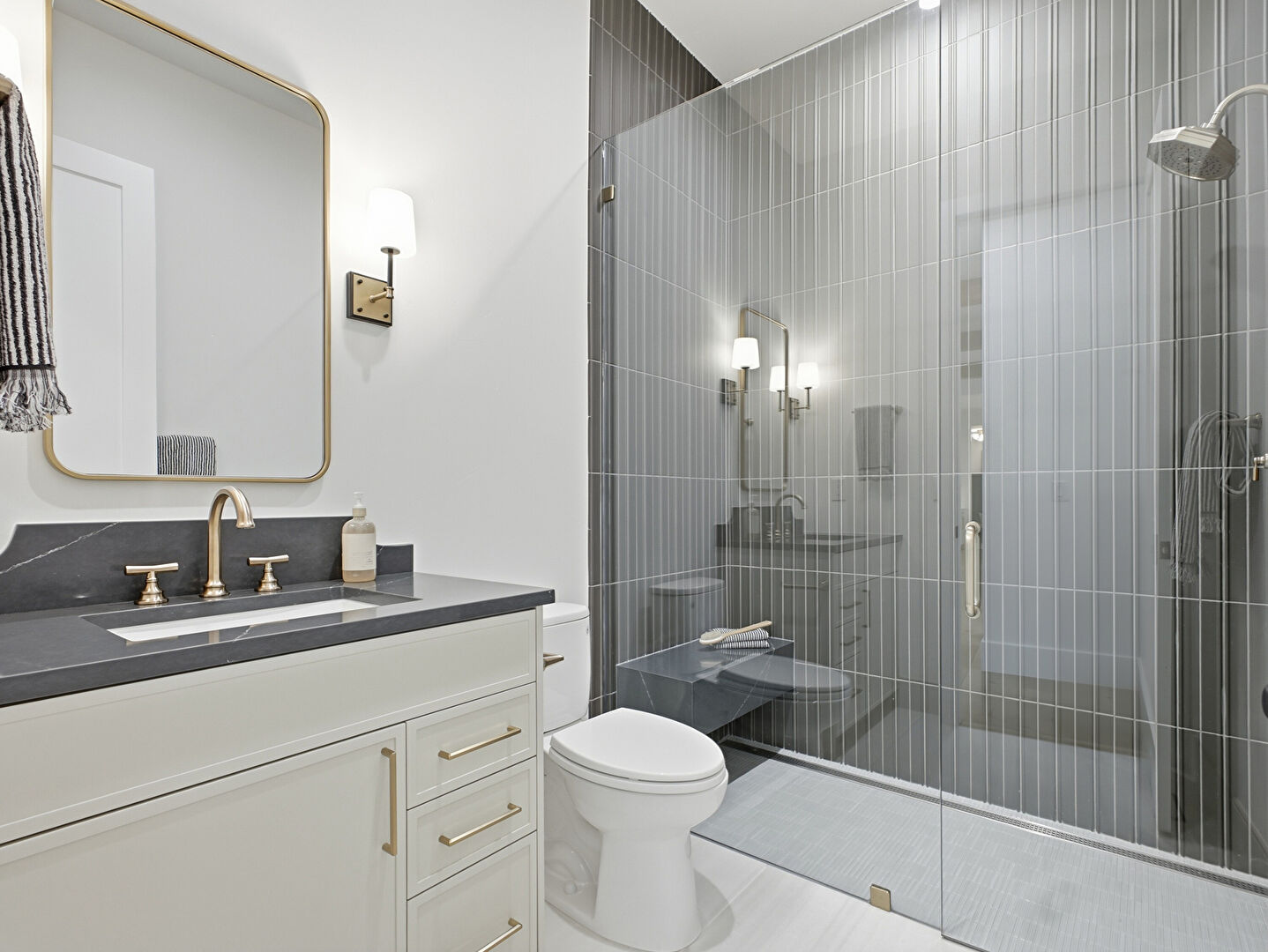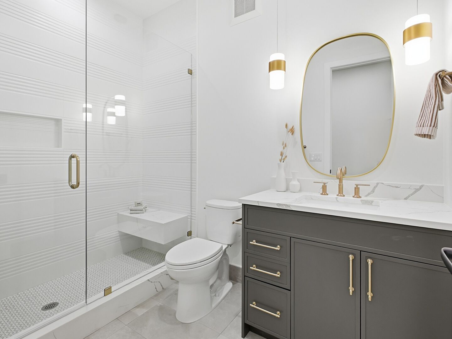 Baseboards Wall, Combined Bath Shower, Double Vanity, Drywall, Full Bathroom, Marble Finish Floor, Natural Light, Notable Chandelier, Recessed Lighting, Tile Floor, Tile Wall, Vanity, Vent, Combined Bath Shower, Drywall, Full Bathroom, Notable Chandelier, Tile Floor, Vent