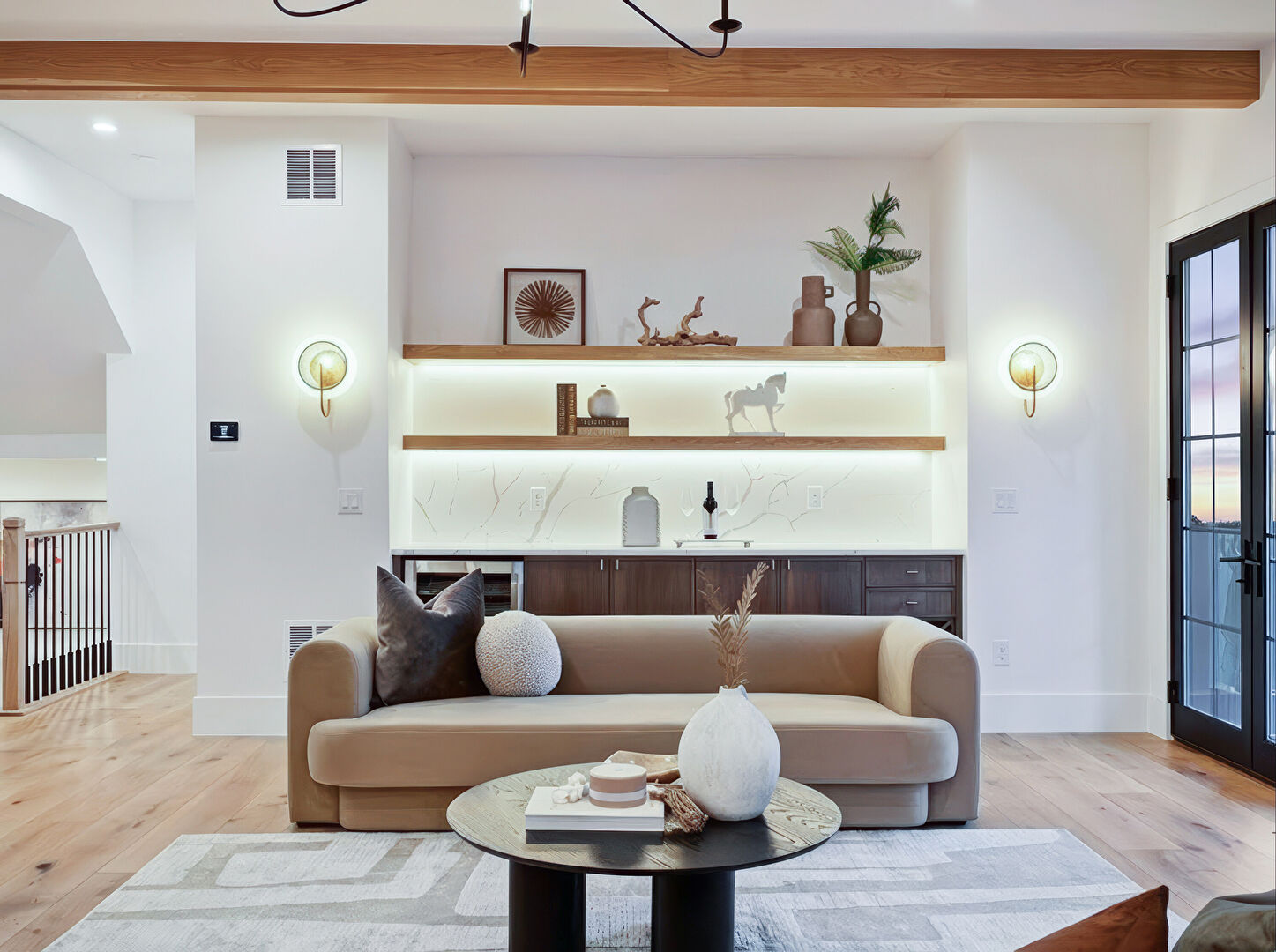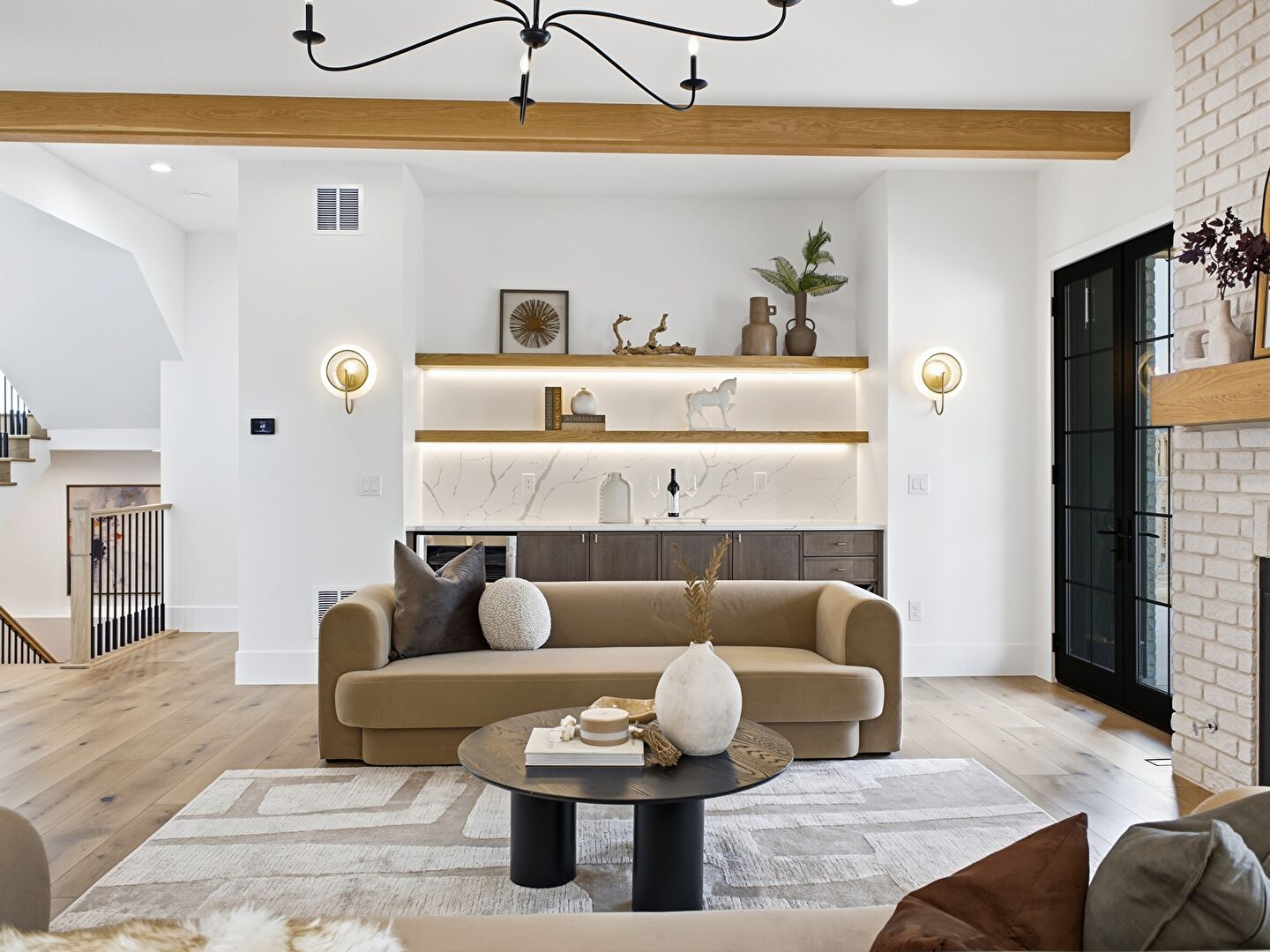 Baseboards Wall, Beamed Ceiling, Drywall, Fireplace, French Doors, High Ceiling, Indoor Bar, L Shaped Kitchen, Natural Light, Notable Chandelier, Recessed Lighting, Stairs, Vent, Wine Cooler, Wood Finish Floor, Baseboards Wall, Beamed Ceiling, Built In Shelves, Drywall, Fireplace, Notable Chandelier, Recessed Lighting, Vent