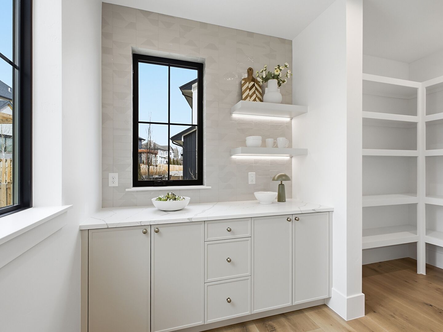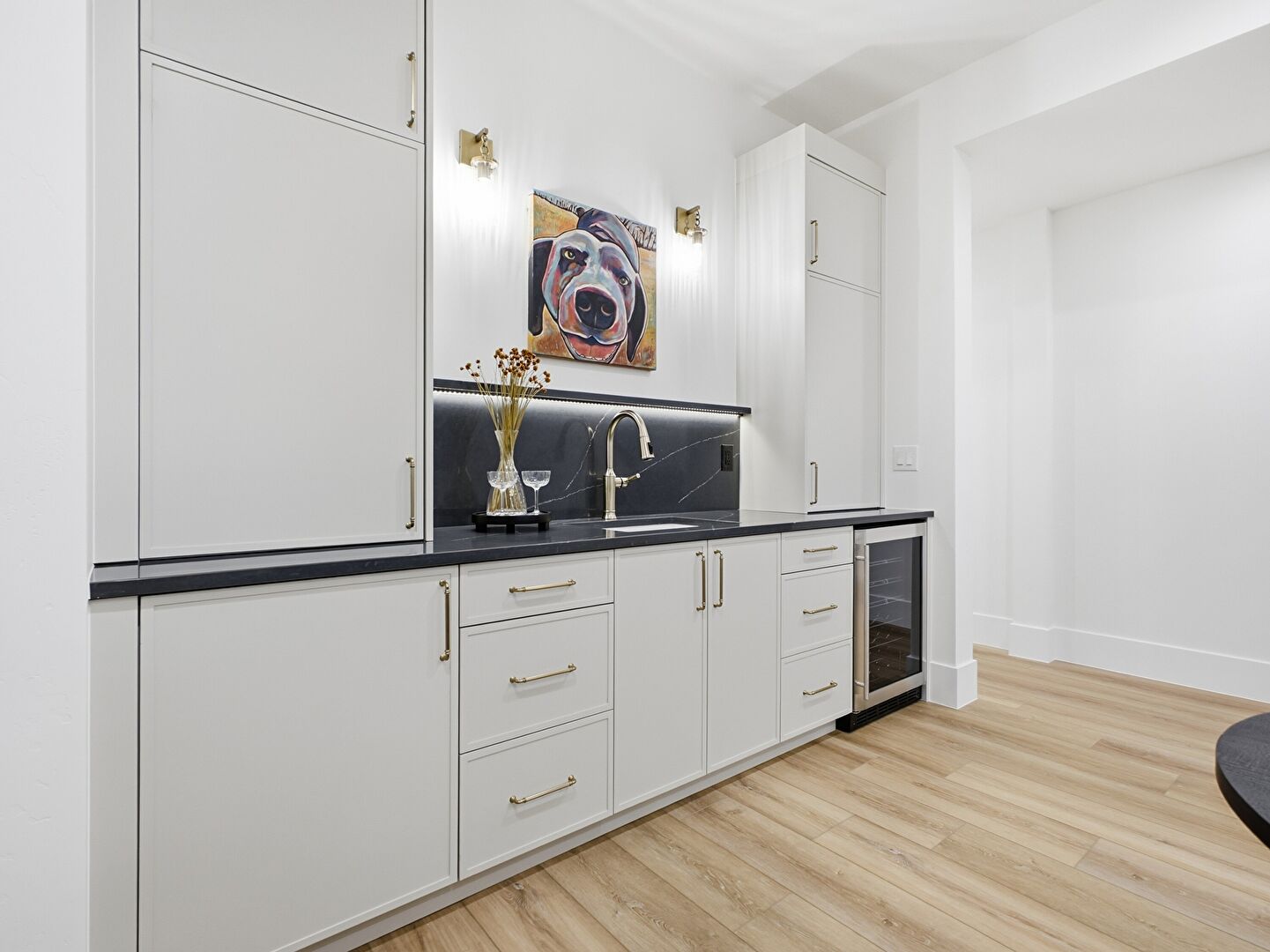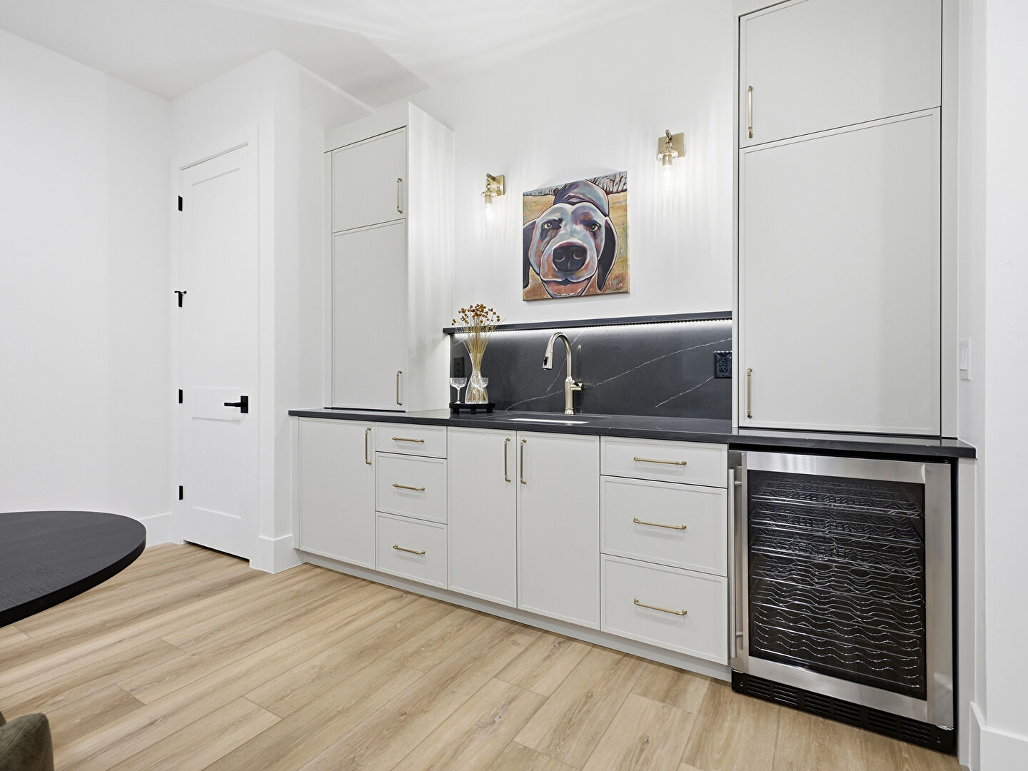 Drywall, Flat Panel Cabinets, Indoor Bar, Stone Countertops, Wine Cooler, Wood Finish Floor, Baseboards Wall
