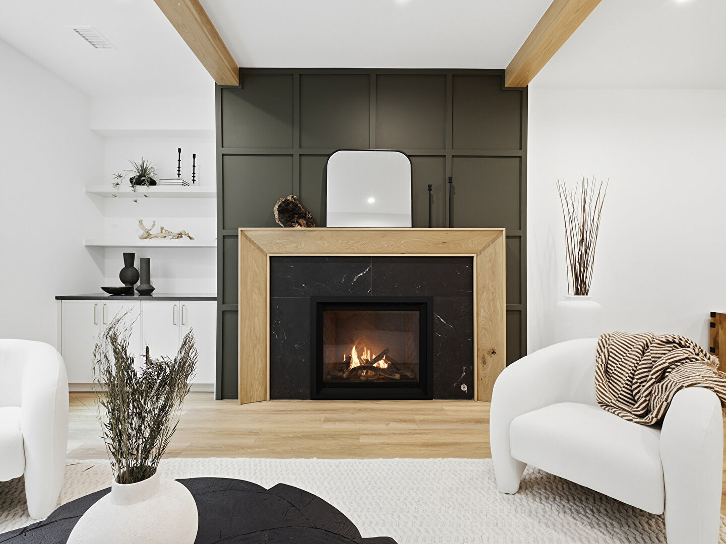 Baseboards Wall, Beamed Ceiling, Dark Brown Cabinets, Drywall, Fireplace, Flat Panel Cabinets, Gray Cabinets, Kitchen Bar, Kitchen Island, L Shaped Kitchen, Medium Brown Cabinets, Natural Light, Notable Chandelier, Open Shelves, Opens To Living Area, Pendant Lighting, Recessed Lighting, Stone Countertops, Vent, Wine Cooler, Wood Finish Floor, Baseboards Wall, Kitchen Island, Natural Light, Notable Chandelier, Recessed Lighting, Stone Countertops, Vent, Wood Finish Floor