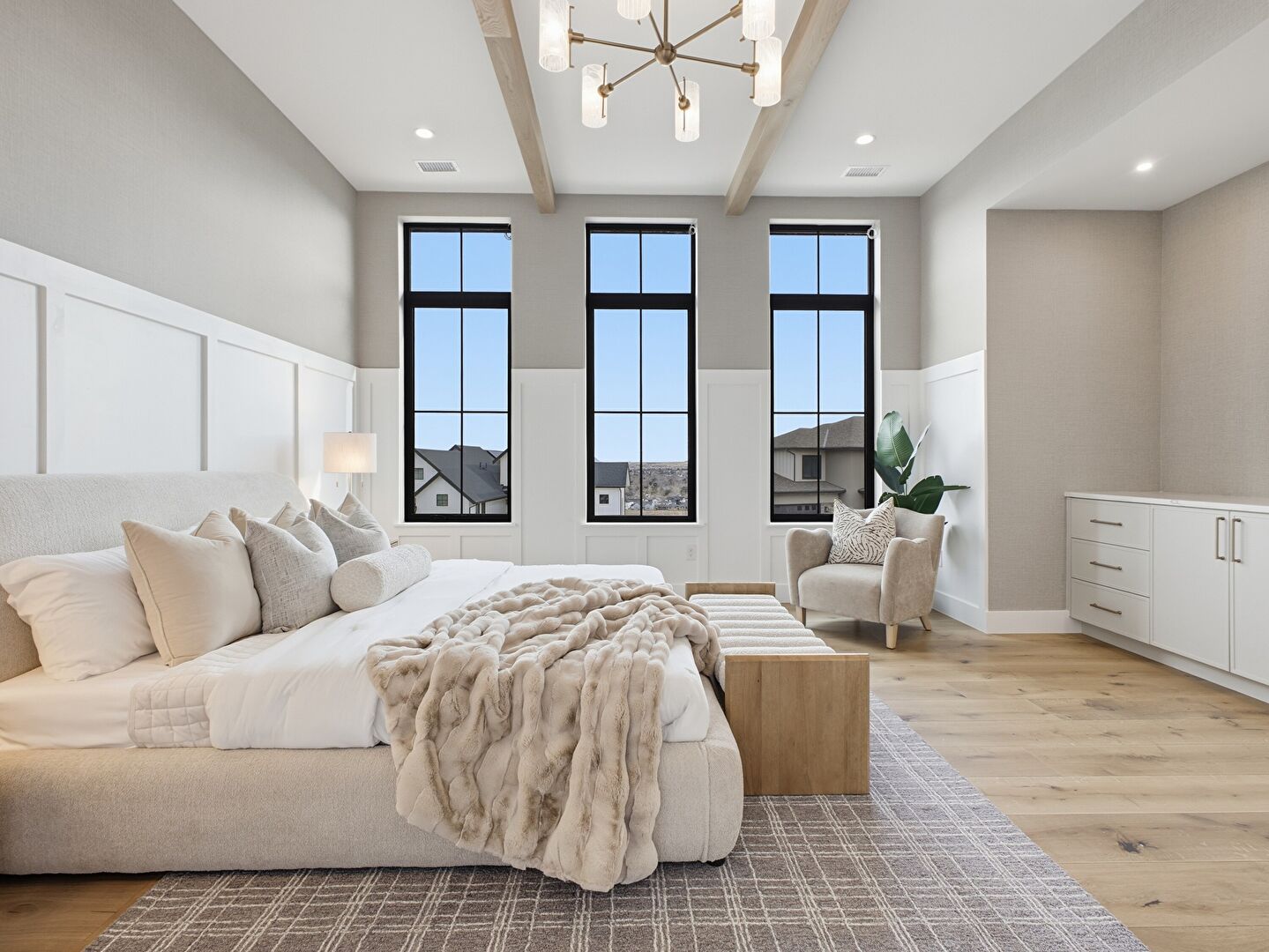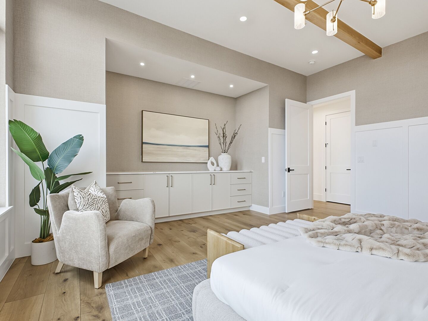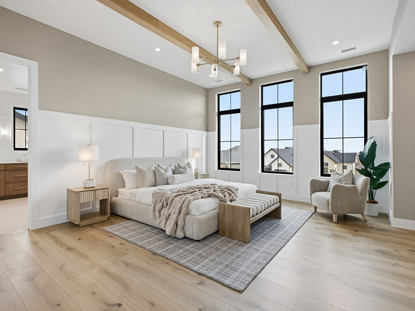 Baseboards Wall, Beamed Ceiling, Carpet, Drywall, Ensuite Bathroom, Natural Light, Notable Chandelier, Paneling Wall, Recessed Lighting, Vent, Wainscot Wall, Wood Finish Floor, Closet, Drywall, Ensuite Bathroom, Natural Light, Recessed Lighting, Vent, Wainscot Wall, Wood Finish Floor