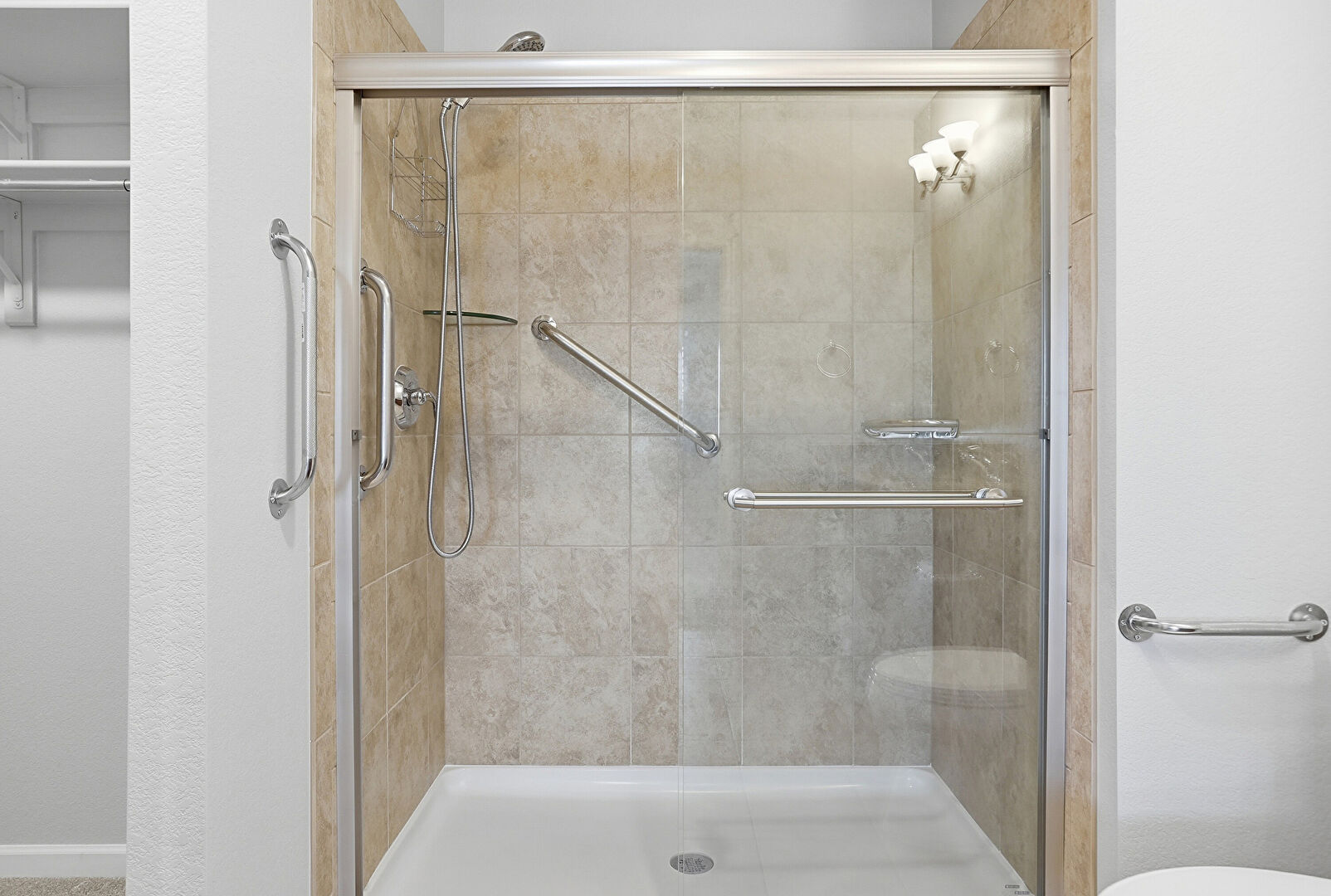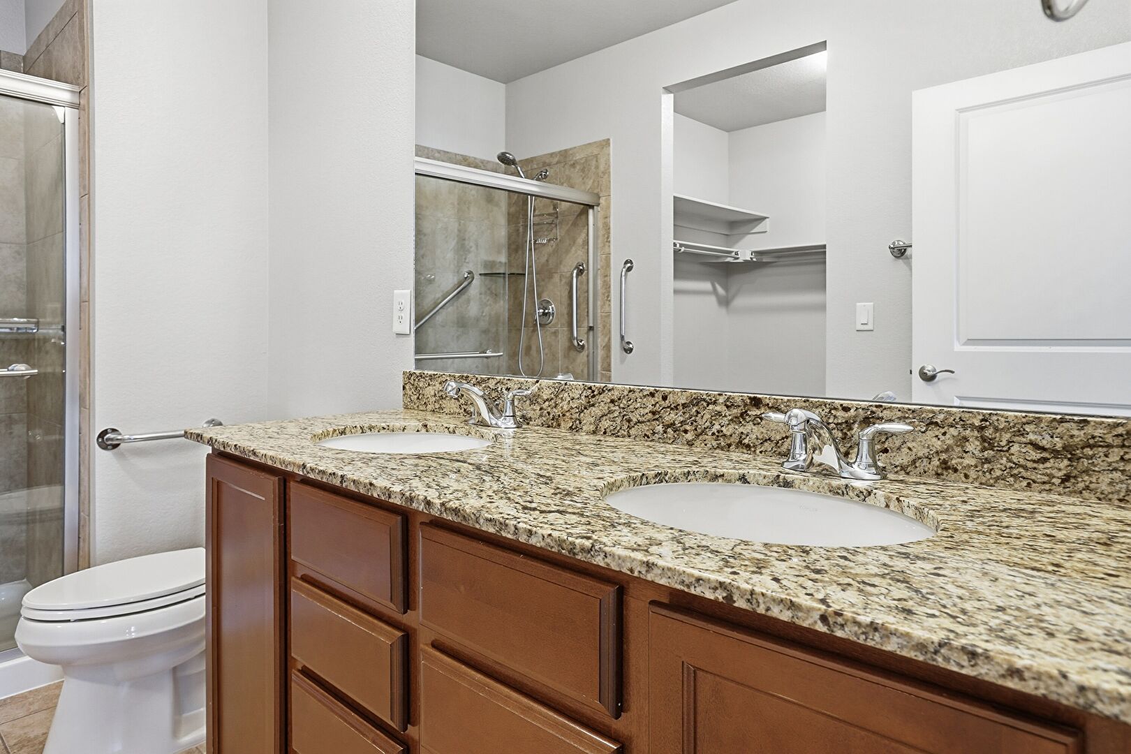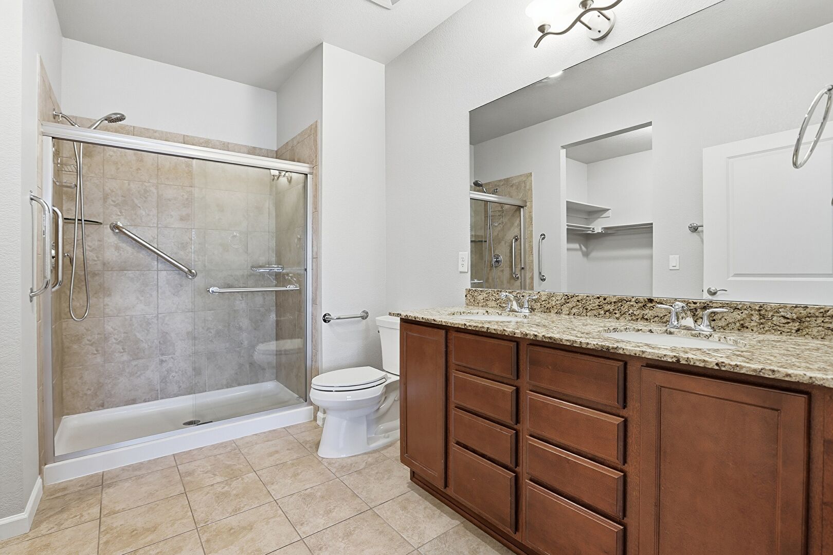 Double Vanity, Drywall, Textured Wall, Tile Floor, Walk In Closet, Full Bathroom