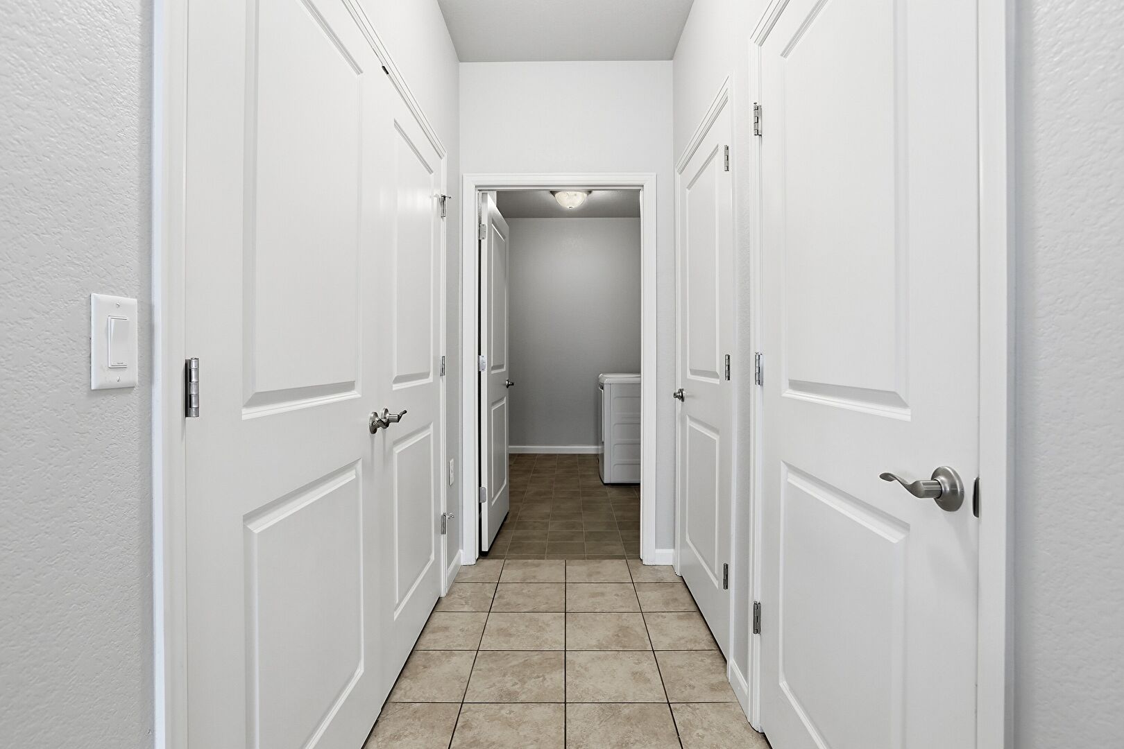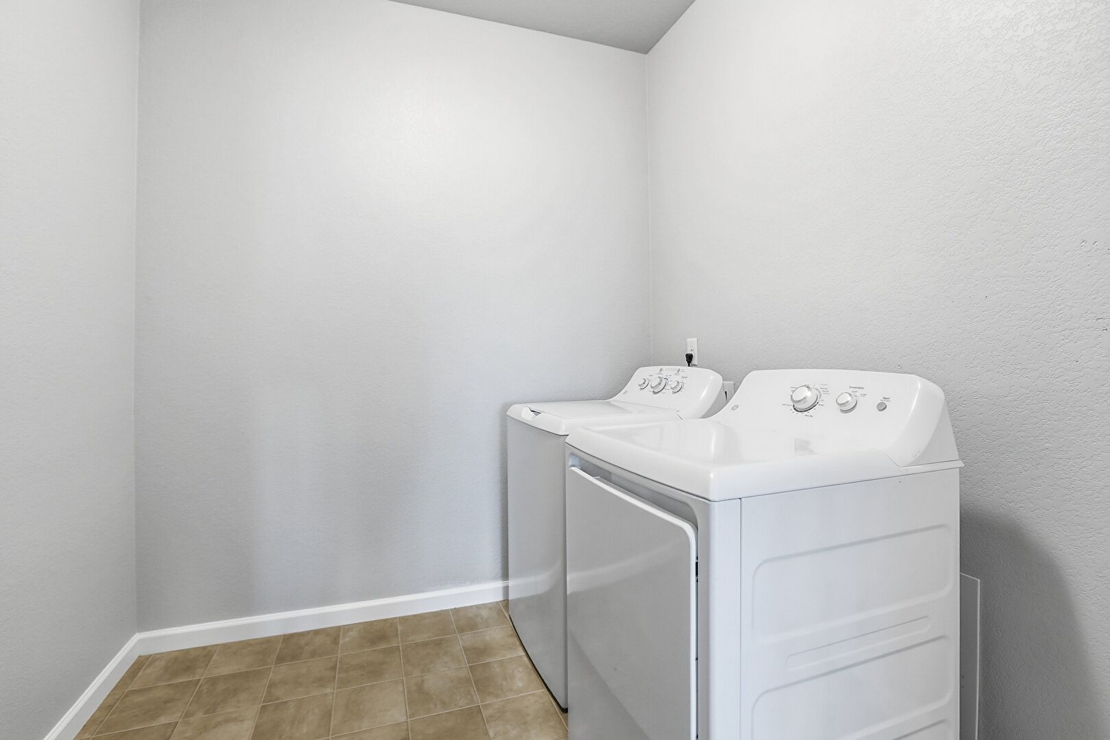 Laundry, Textured Wall, Tile Floor, Washer Dryer, Baseboards Wall