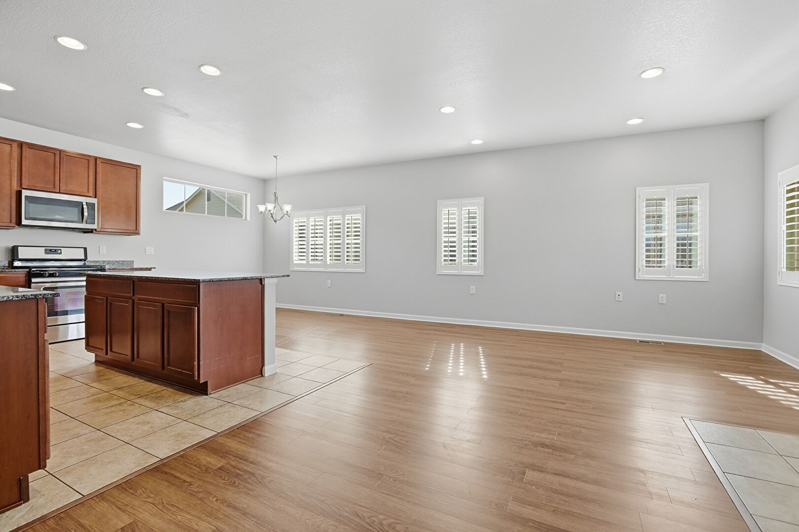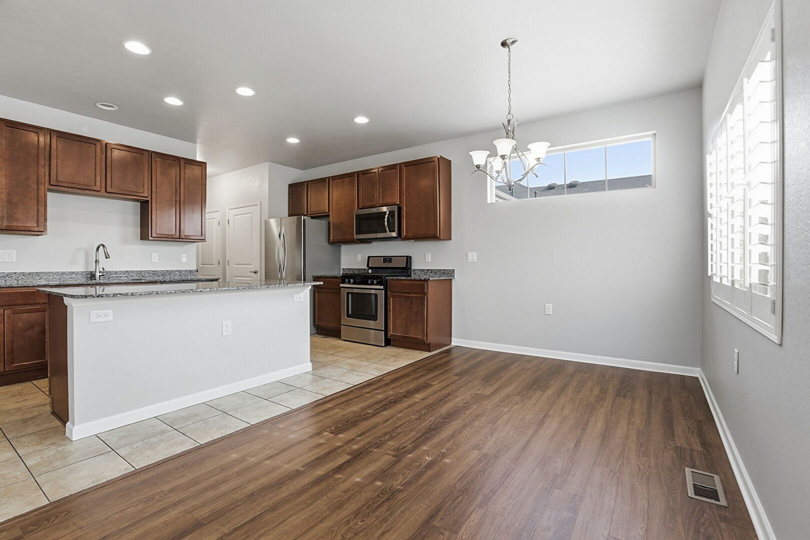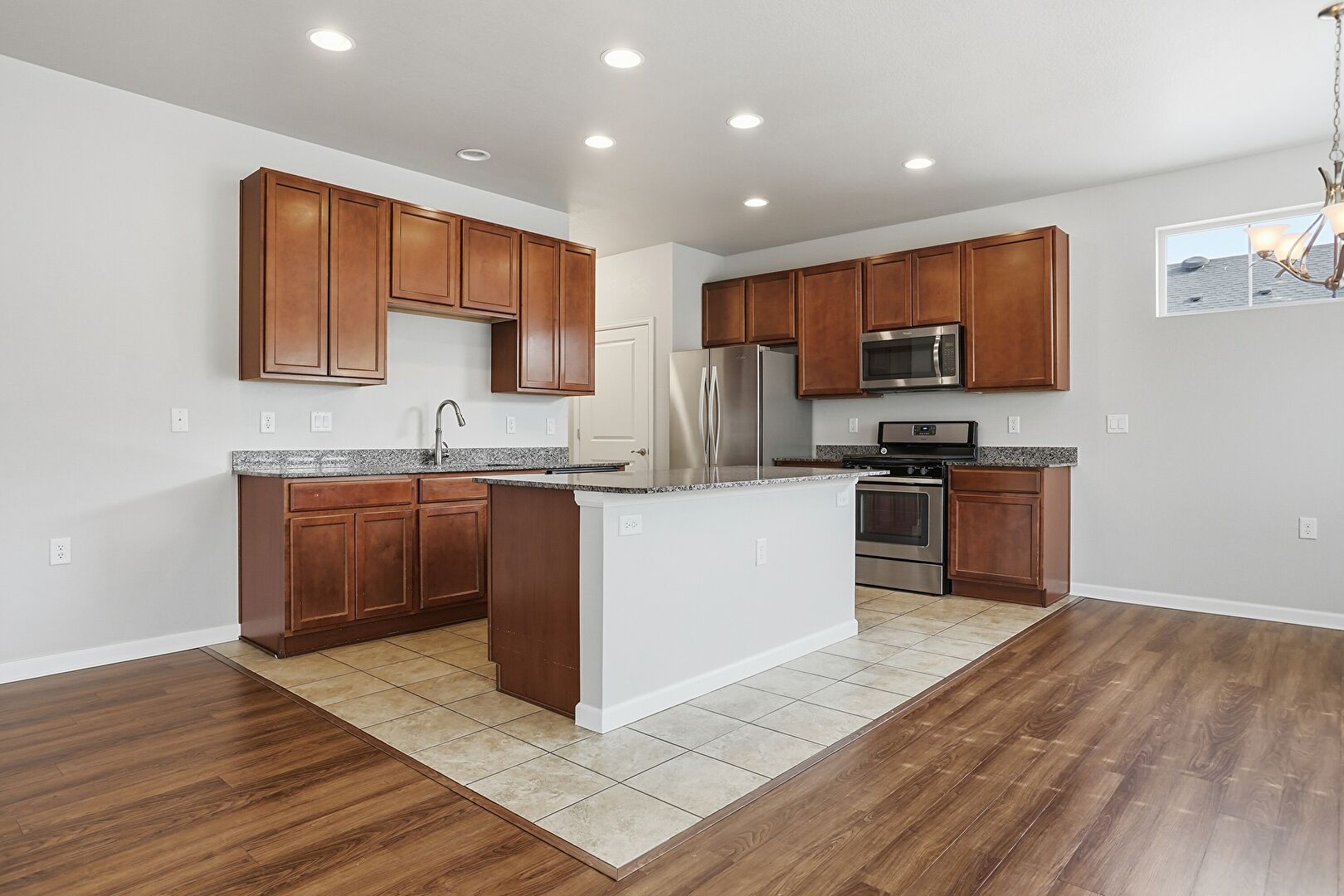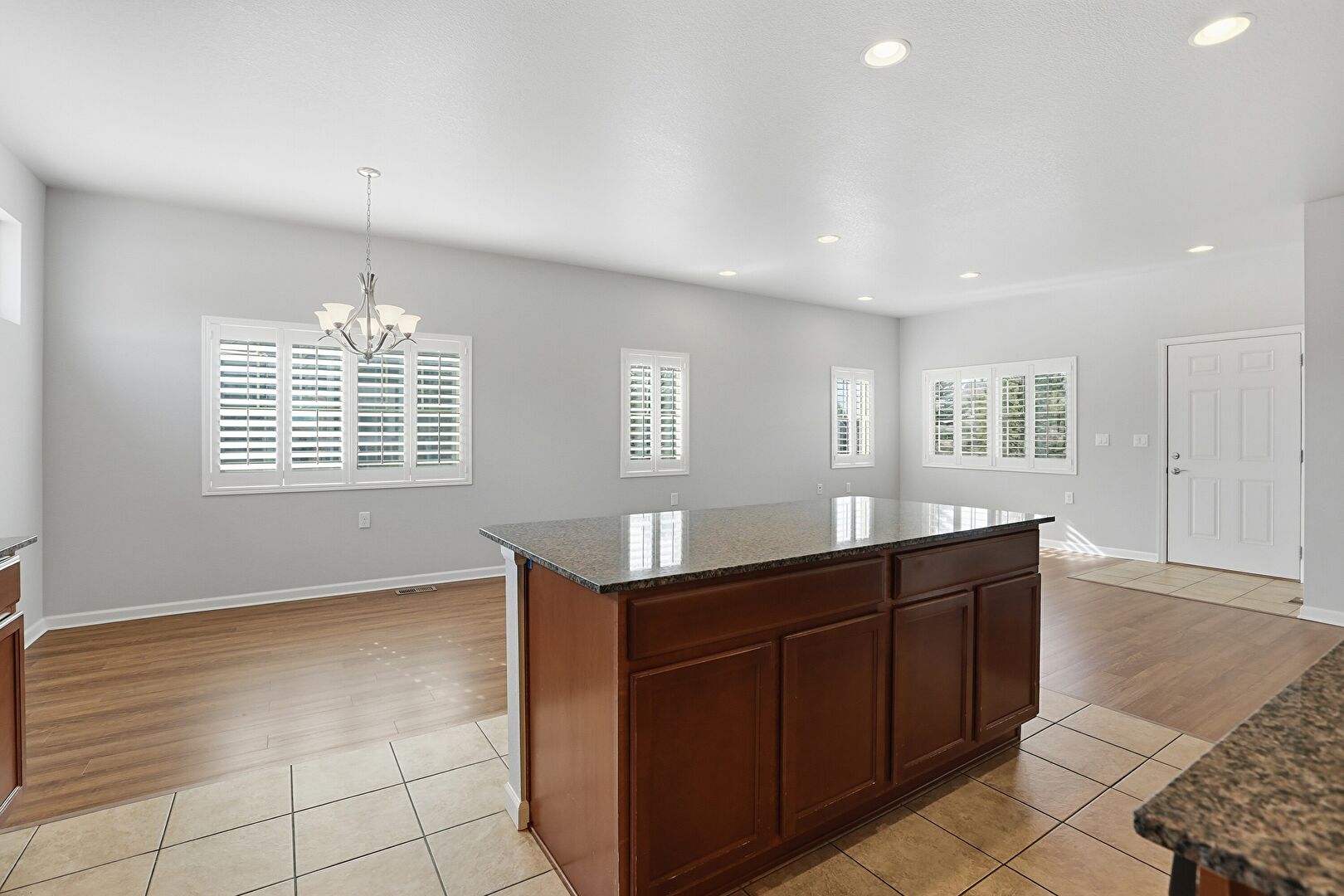 Baseboards Wall, Dark Brown Cabinets, Drywall, Kitchen Island, L Shaped Kitchen, Laundry, Medium Brown Cabinets, Natural Light, Notable Chandelier, Opens To Living Area, Pendant Lighting, Recessed Lighting, Shaker Cabinets, Stone Countertops, Tile Floor, Vent, Wood Finish Floor, Drywall, Medium Brown Cabinets, Natural Light, Notable Chandelier, Opens To Living Area, Pendant Lighting, Recessed Lighting, Shaker Cabinets, Vent, Wood Finish Floor