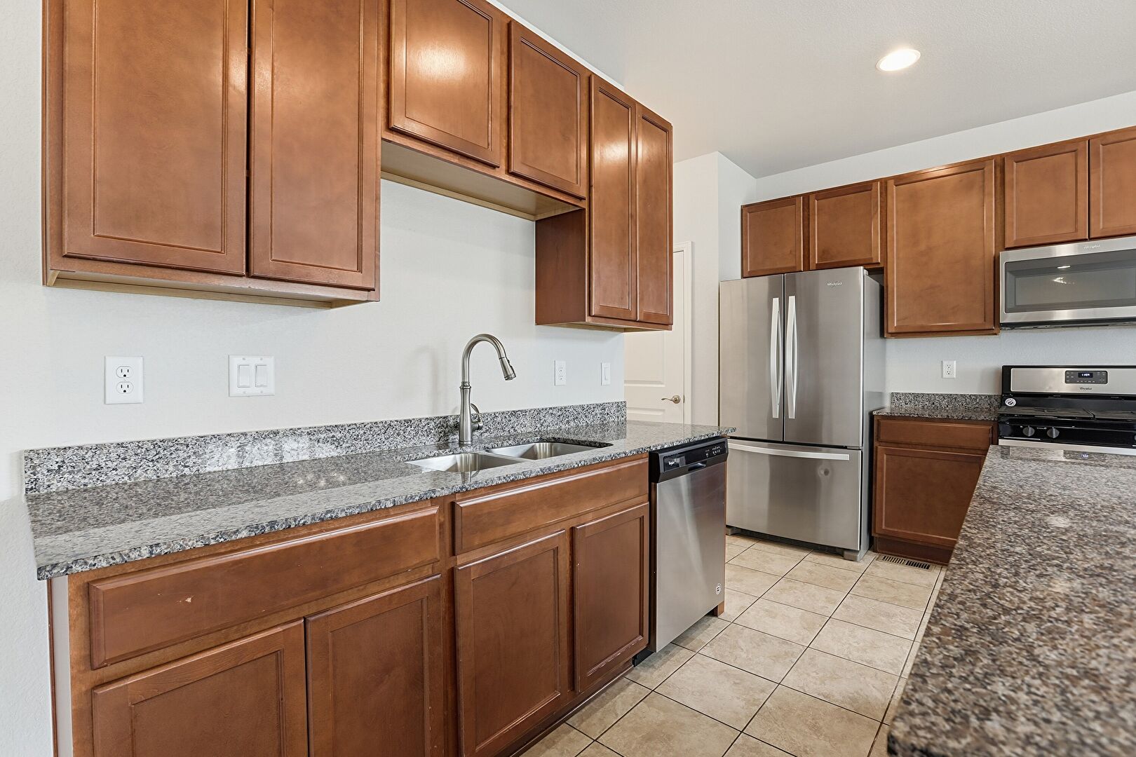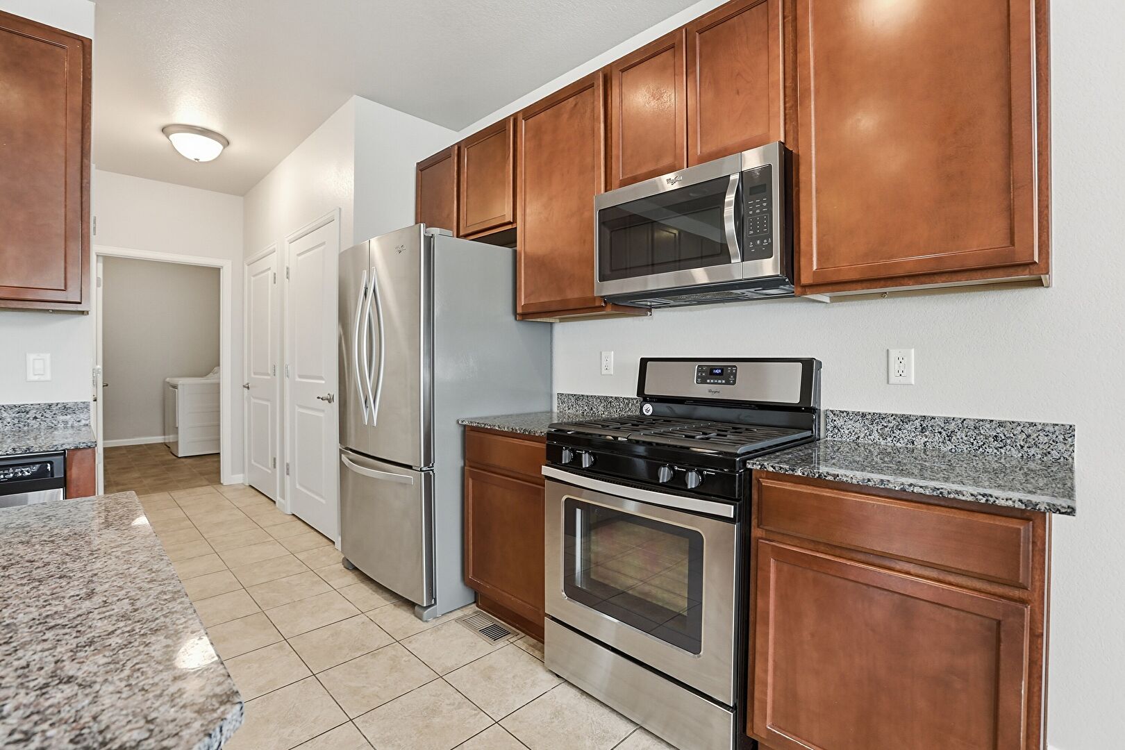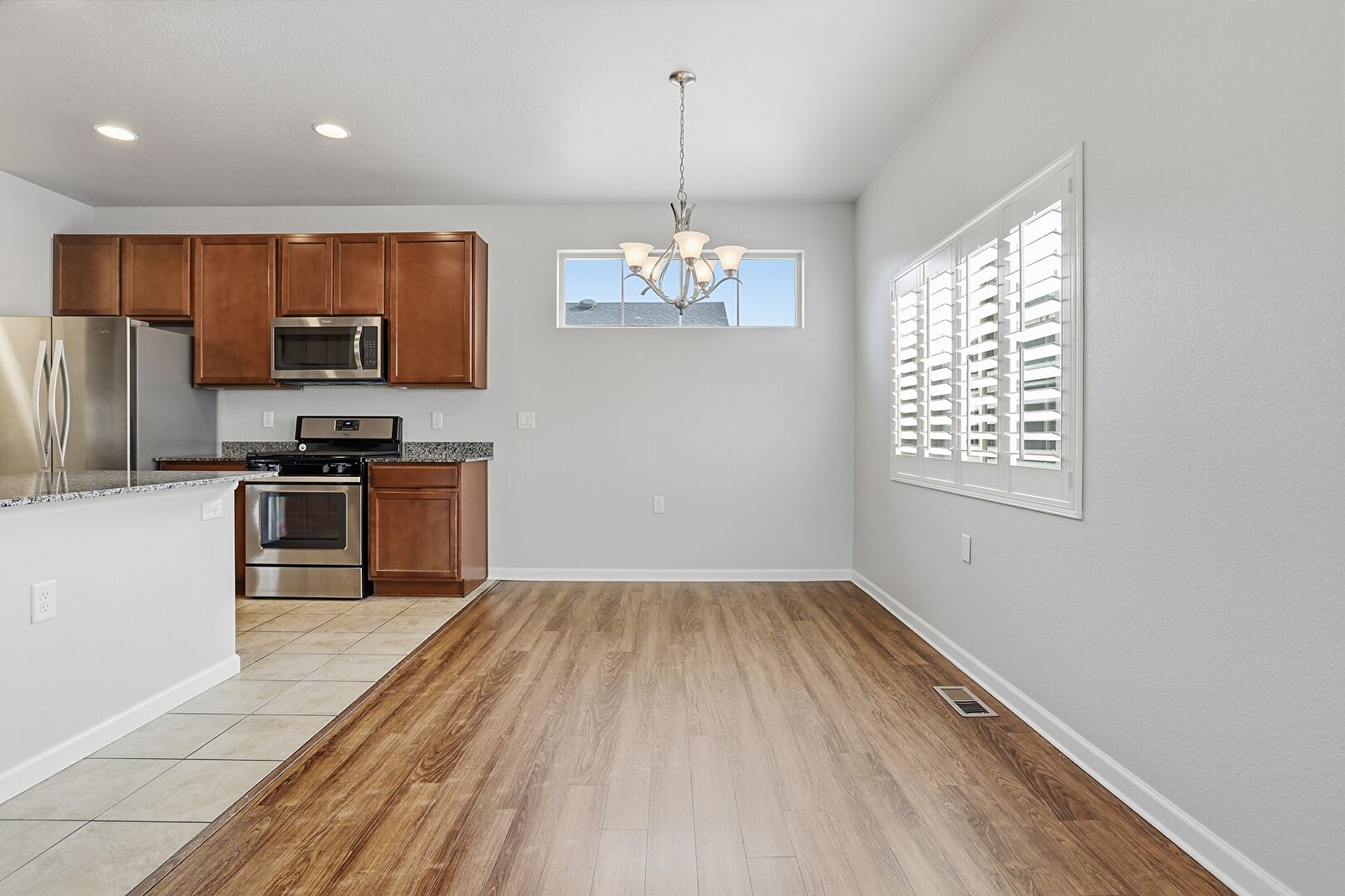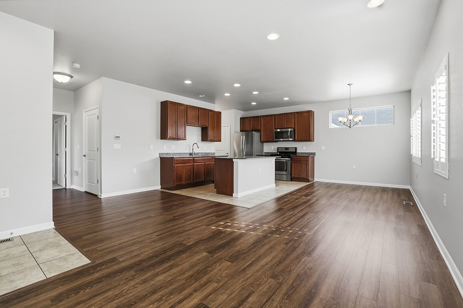 Baseboards Wall, Dark Brown Cabinets, Drywall, Kitchen Island, L Shaped Kitchen, Laundry, Medium Brown Cabinets, Natural Light, Notable Chandelier, Opens To Living Area, Pendant Lighting, Recessed Lighting, Shaker Cabinets, Stone Countertops, Tile Floor, Vent, Wood Finish Floor, Drywall, Medium Brown Cabinets, Natural Light, Notable Chandelier, Opens To Living Area, Pendant Lighting, Recessed Lighting, Shaker Cabinets, Vent, Wood Finish Floor