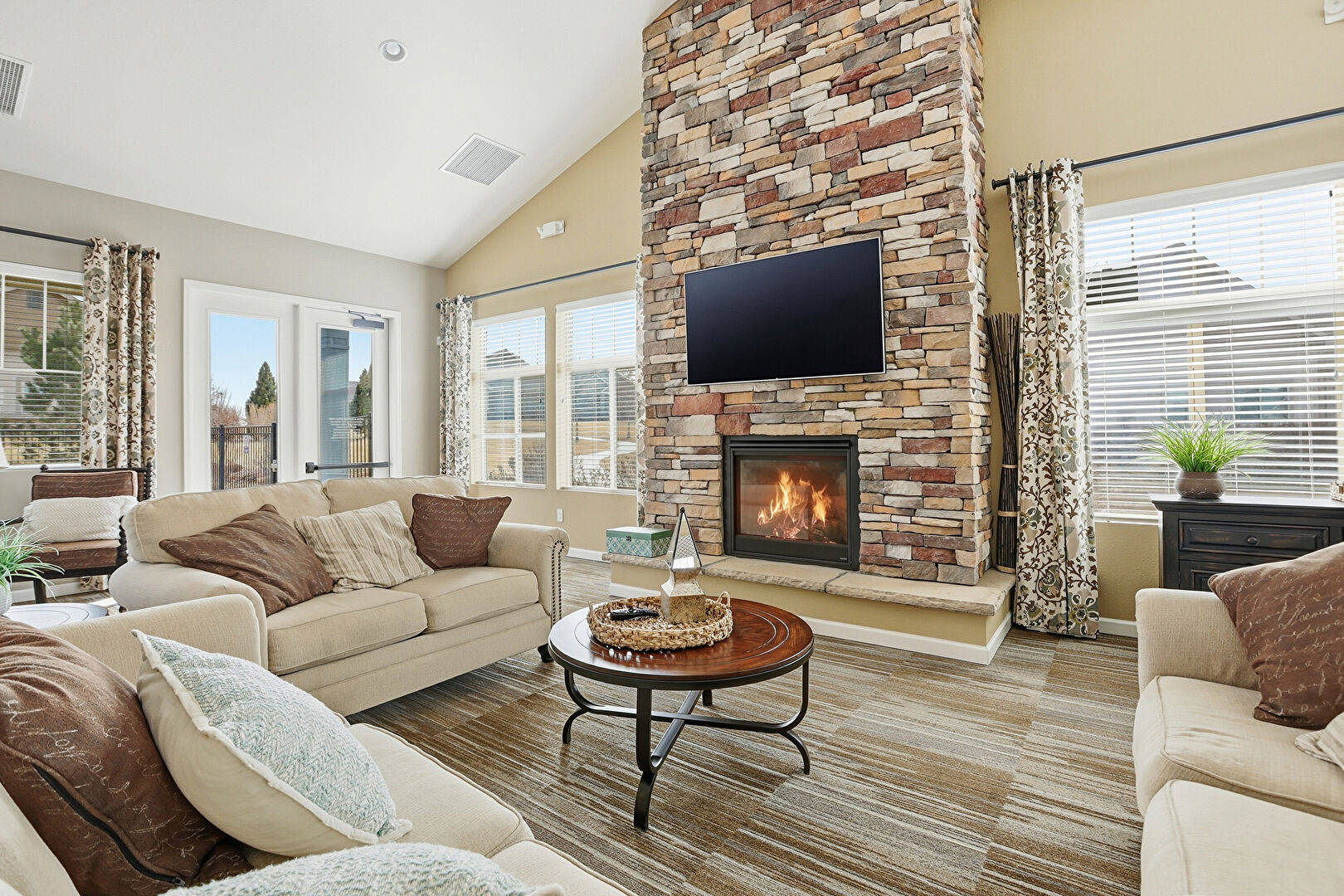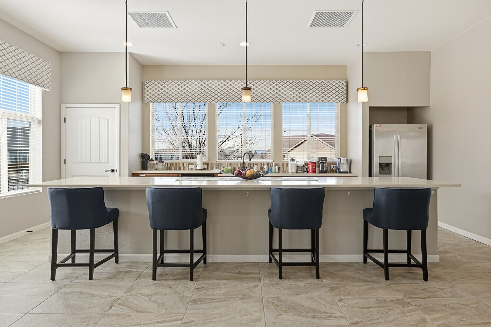Baseboards Wall, Carpet, Cathedral Ceiling, Ceiling Fan, Drywall, Fence, Fire Extinguisher, Fireplace, Flat Panel Cabinets, French Doors, High Ceiling, Kitchen Bar, Natural Light, One Wall Kitchen, Patio, Pendant Lighting, Pool, Recessed Lighting, Stone Countertops, Vaulted Ceiling, Vent, Carpet, Drywall, French Doors, Kitchen Island, Recessed Lighting, Residential View, Vent