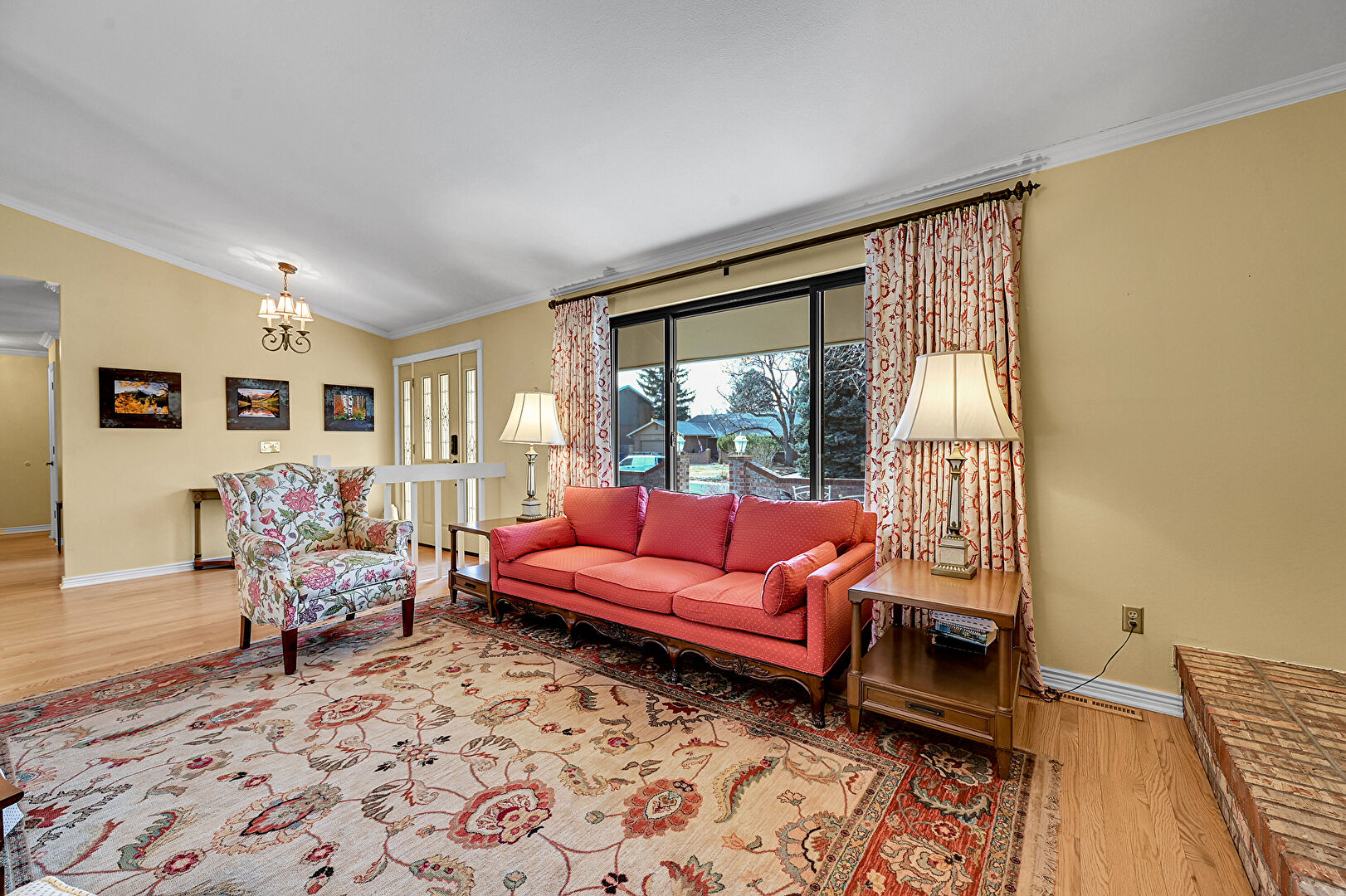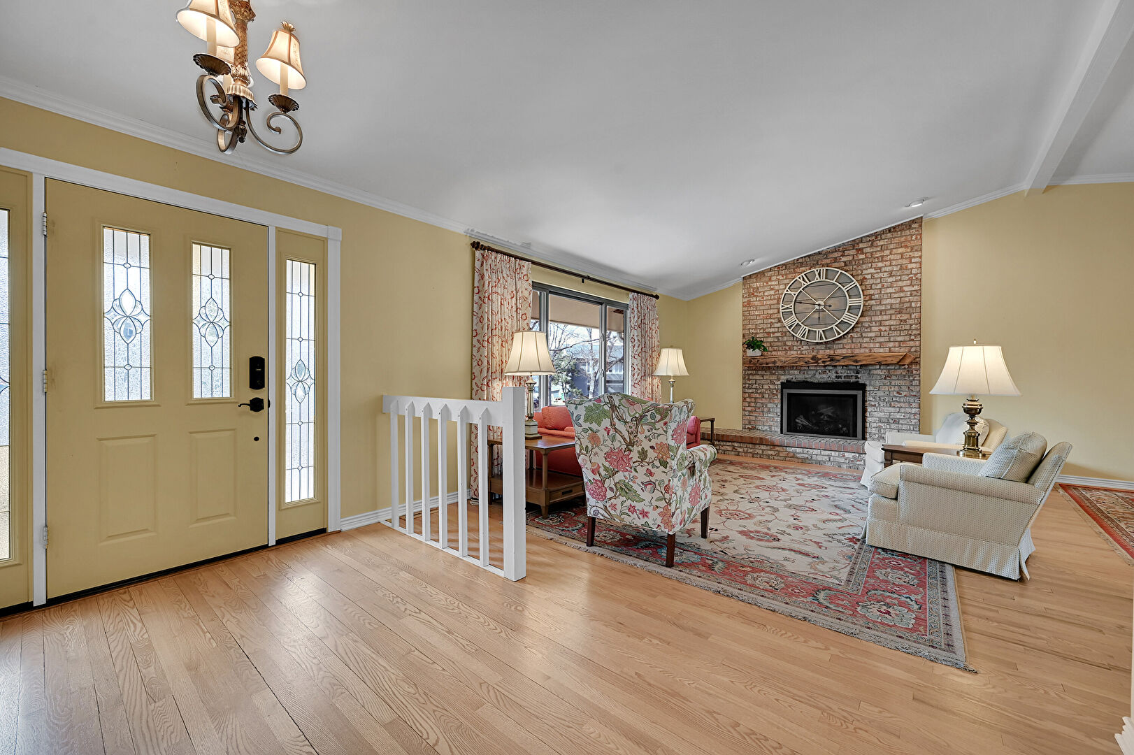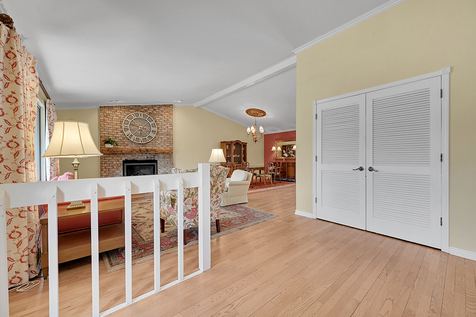 Baseboards Wall, Beamed Ceiling, Crown Molding, Drywall, Fireplace, Natural Light, Notable Chandelier, Vaulted Ceiling, Wood Finish Floor, Baseboards Wall, High Ceiling, Vaulted Ceiling