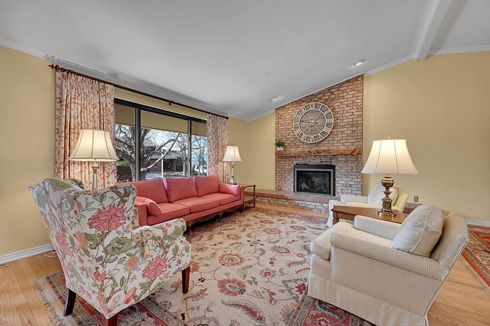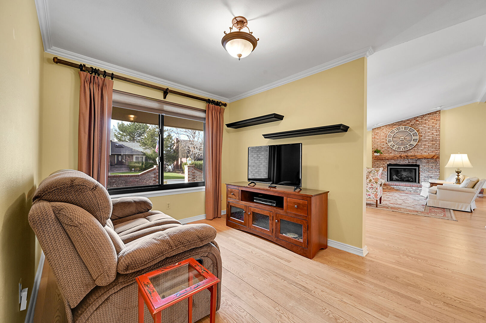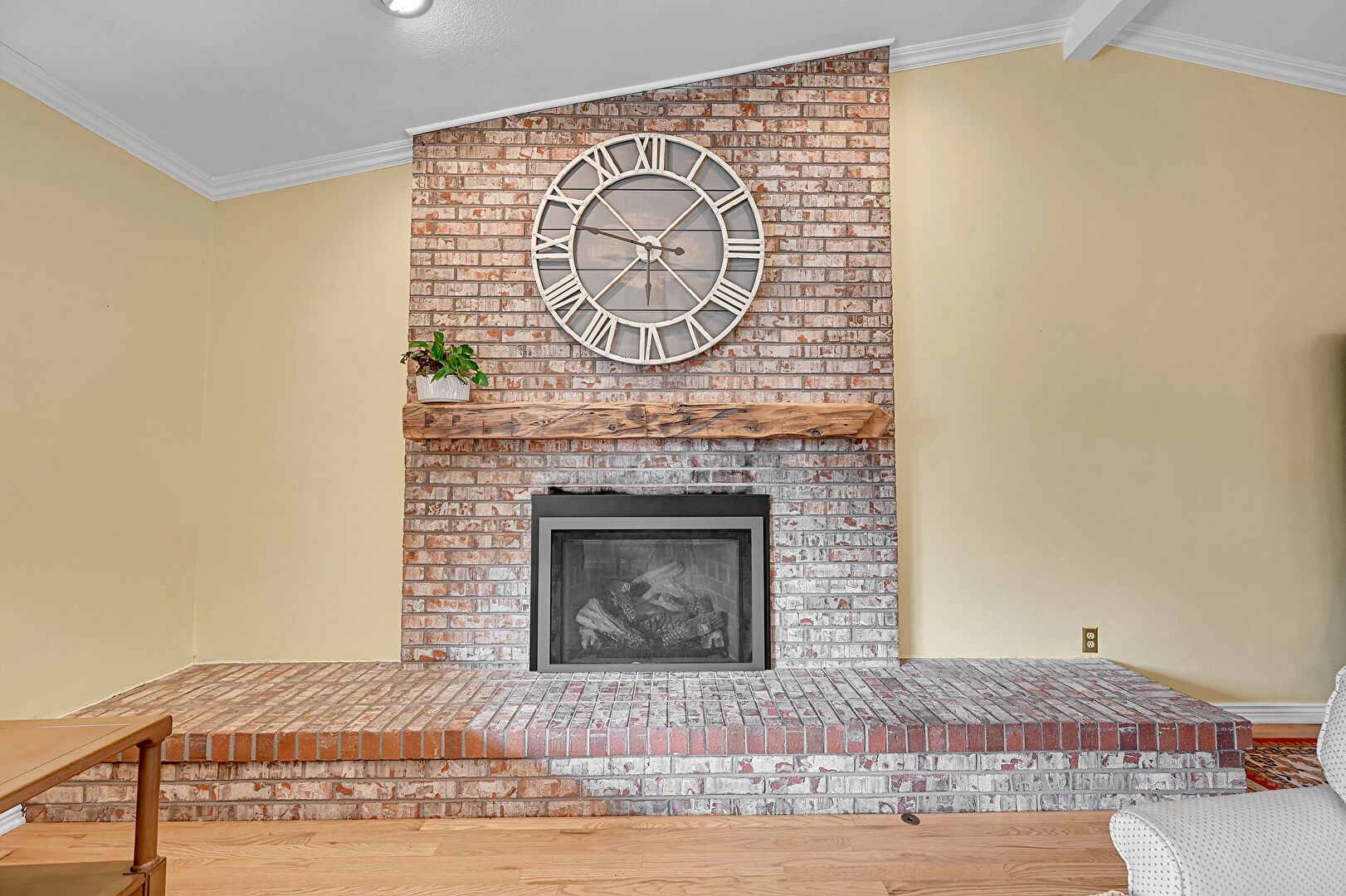 Baseboards Wall, Crown Molding, Drywall, Fireplace, Natural Light, Vaulted Ceiling, Wood Finish Floor, Crown Molding, Natural Light