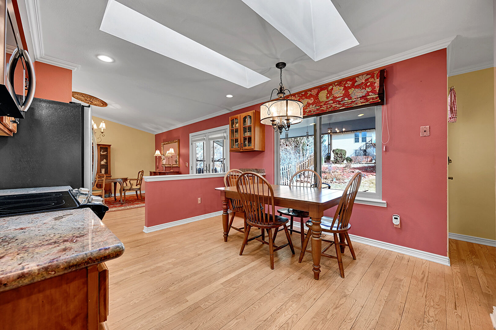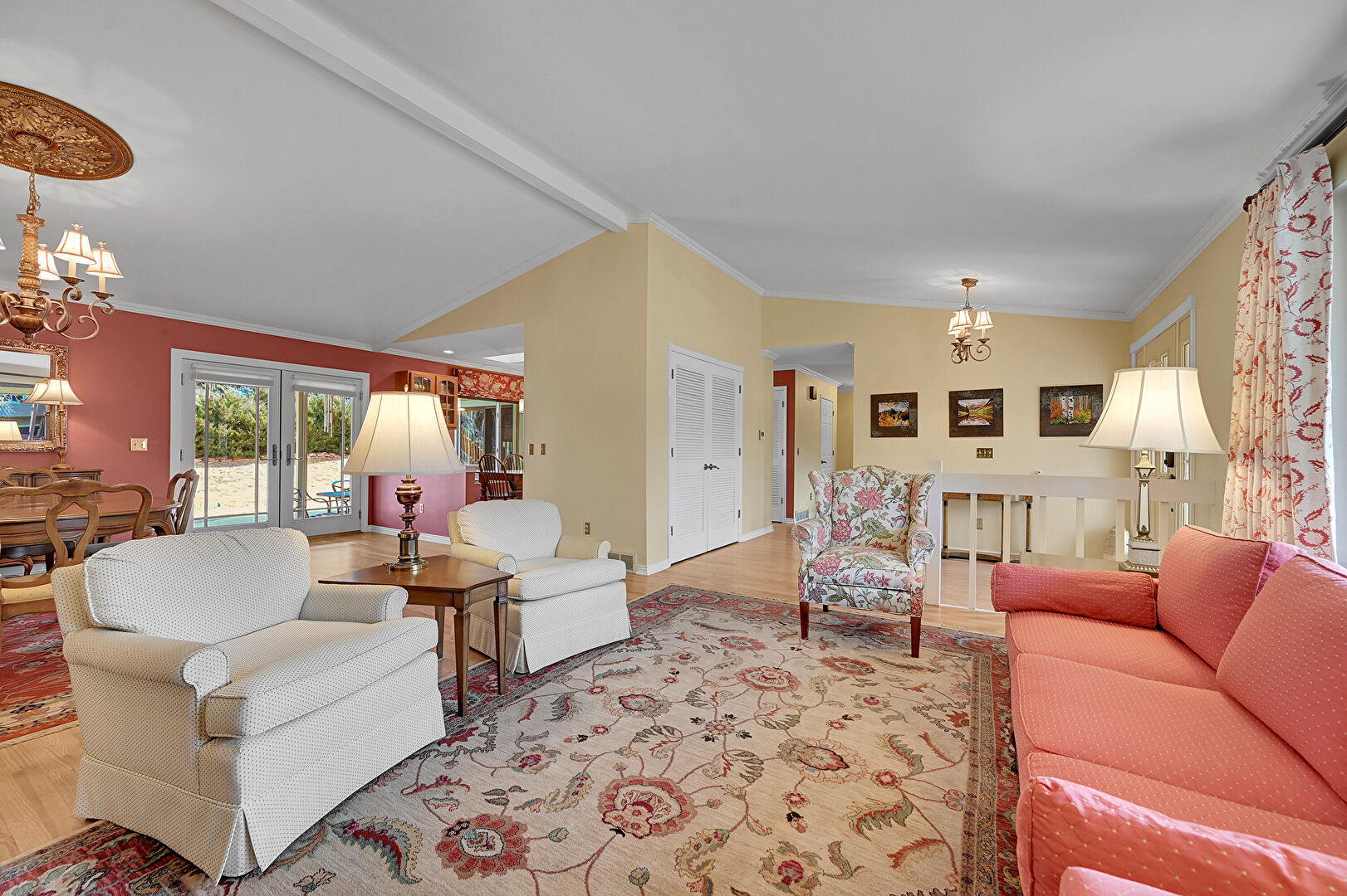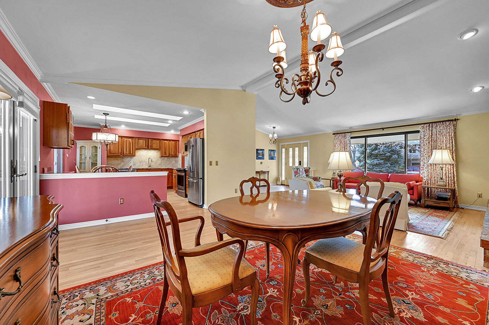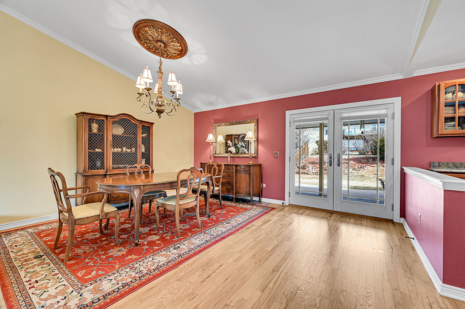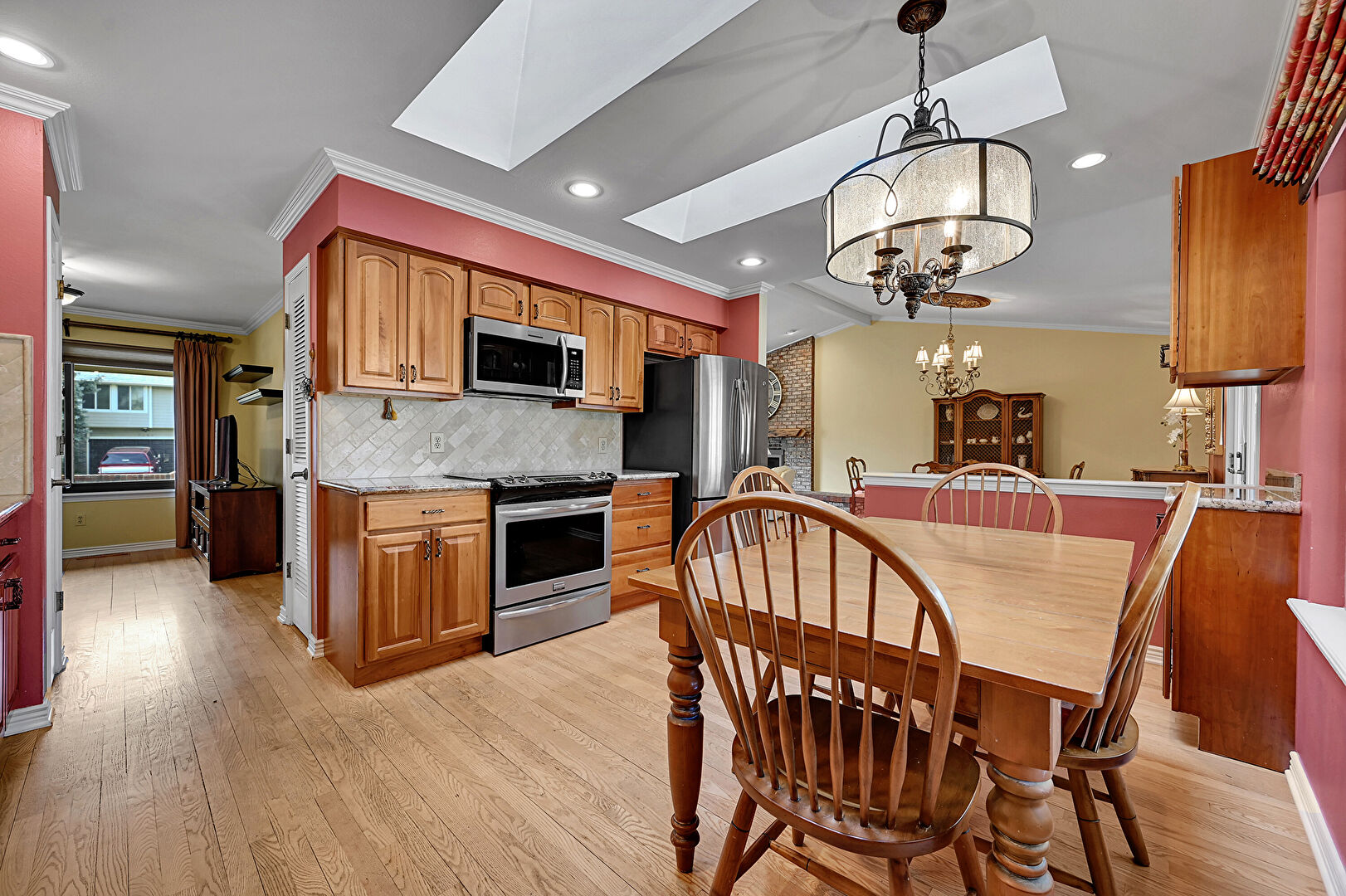 Baseboards Wall, Beamed Ceiling, Crown Molding, Drywall, Fireplace, French Doors, G Shaped Kitchen, Natural Light, Notable Chandelier, Recessed Lighting, Skylight, Vaulted Ceiling, Vent, Wood Finish Floor, Crown Molding, Natural Light, Recessed Lighting, Wood Finish Floor
