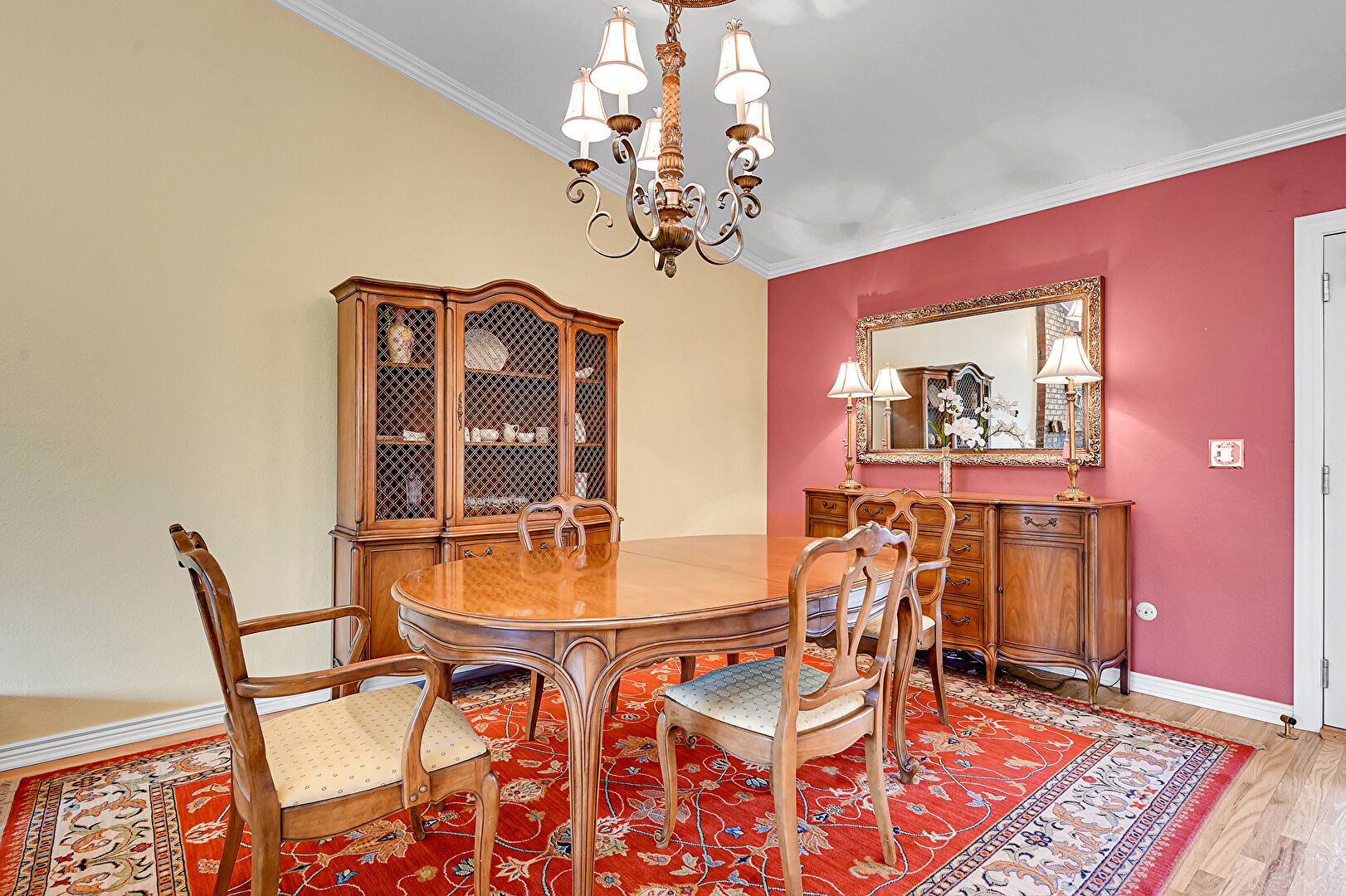 Baseboards Wall, Beamed Ceiling, Crown Molding, Drywall, Fireplace, Natural Light, Notable Chandelier, Vaulted Ceiling, Wood Finish Floor, Drywall, Notable Chandelier