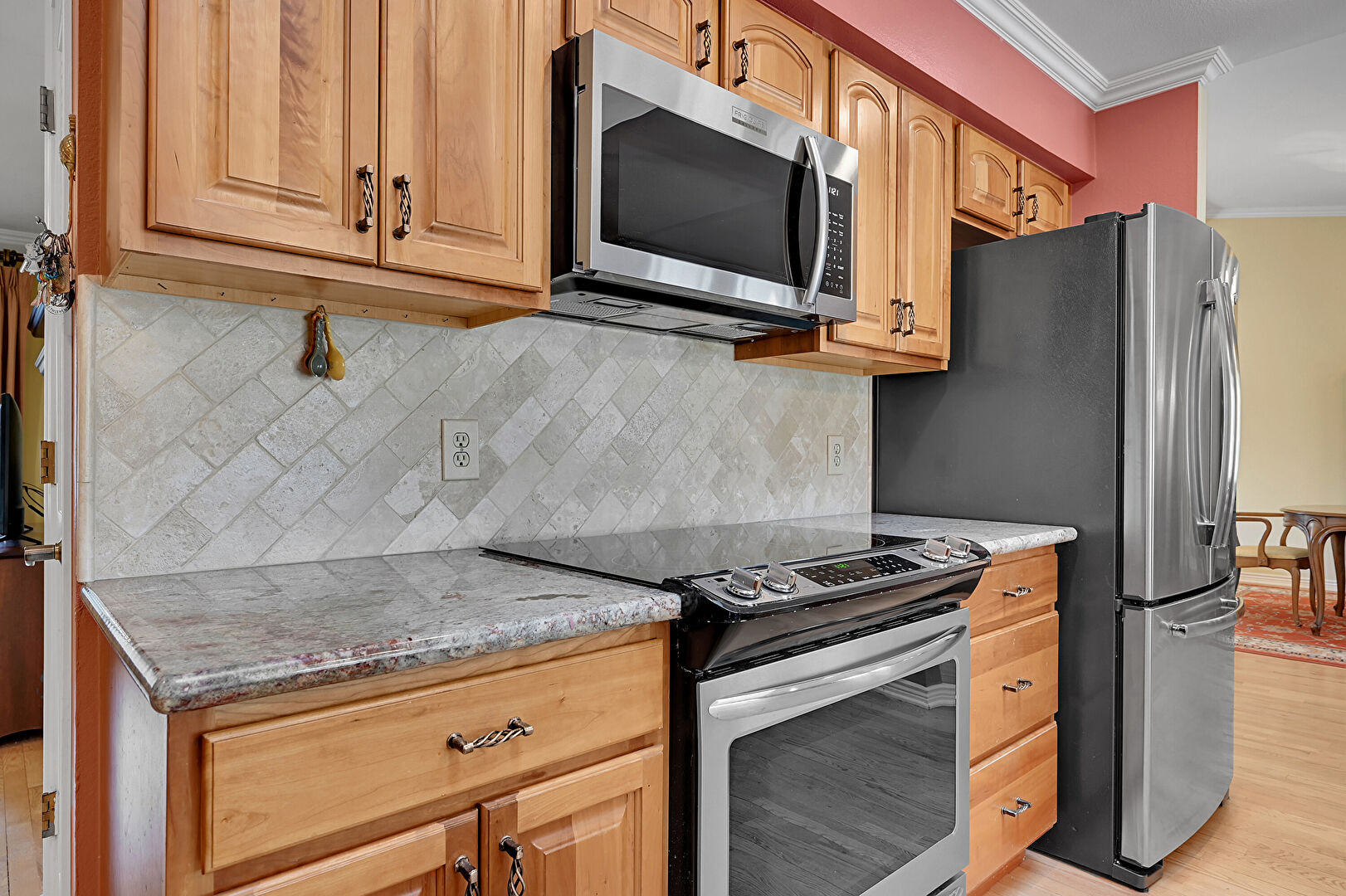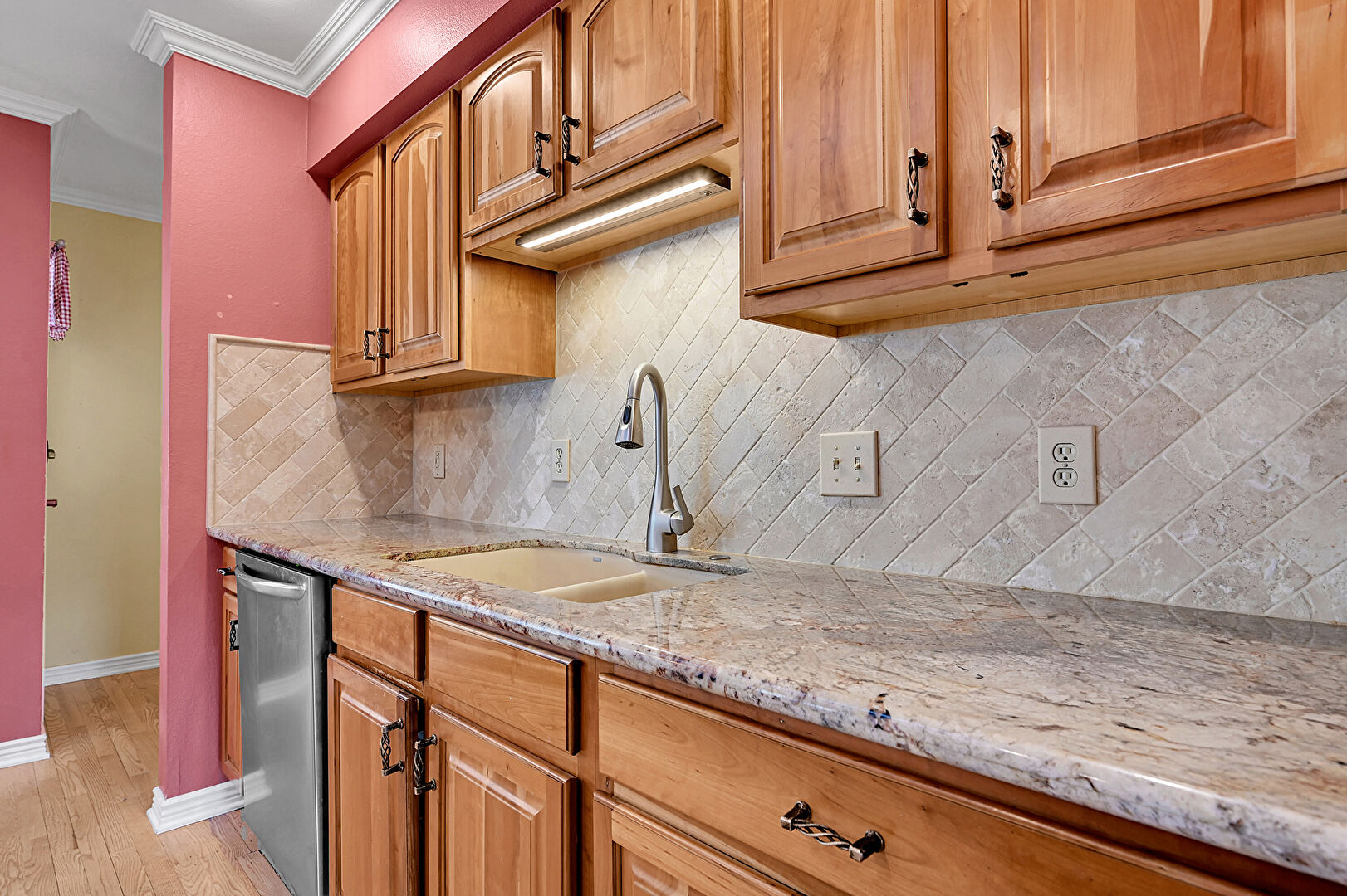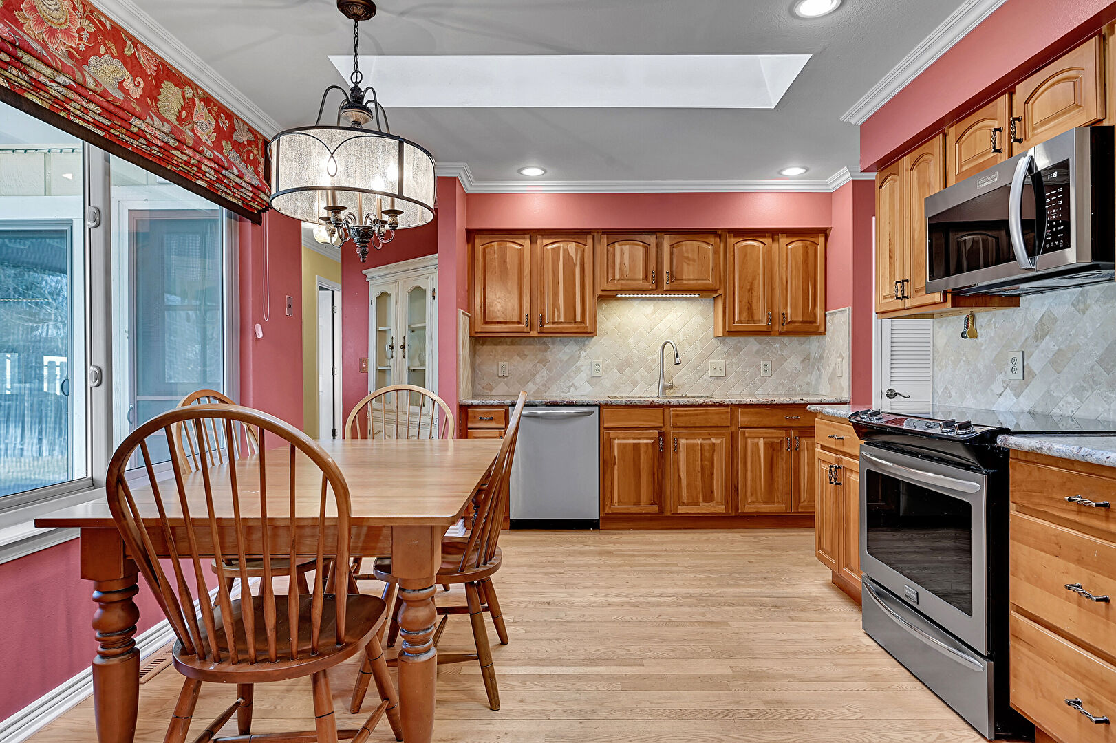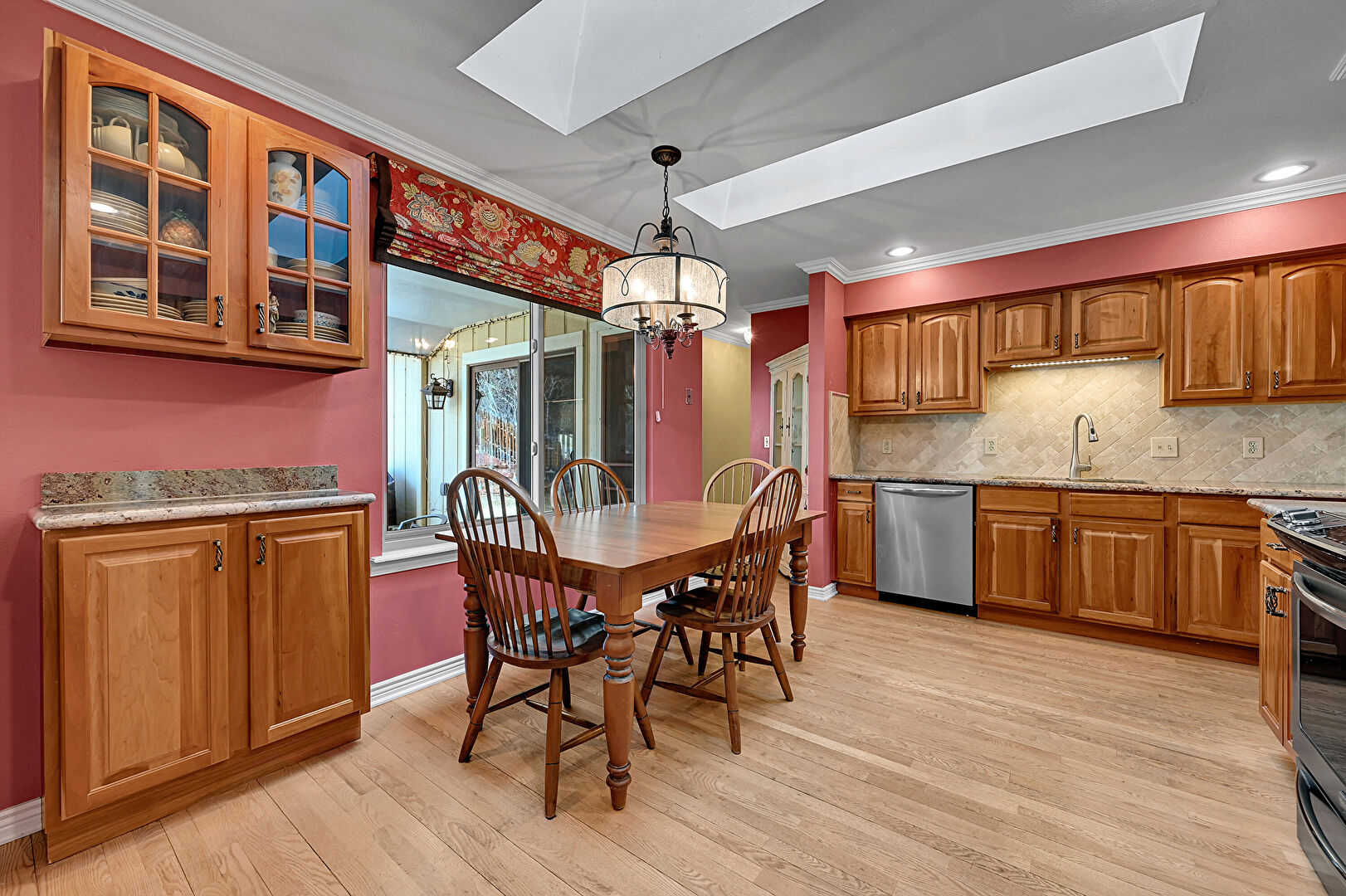 Arched Cabinets, Baseboards Wall, Crown Molding, Crown Molding Cabinets, Drywall, Medium Brown Cabinets, Natural Light, Notable Chandelier, Pendant Lighting, Raised Cabinets, Recessed Lighting, Skylight, Stone Countertops, Wood Finish Floor, Crown Molding, Raised Cabinets