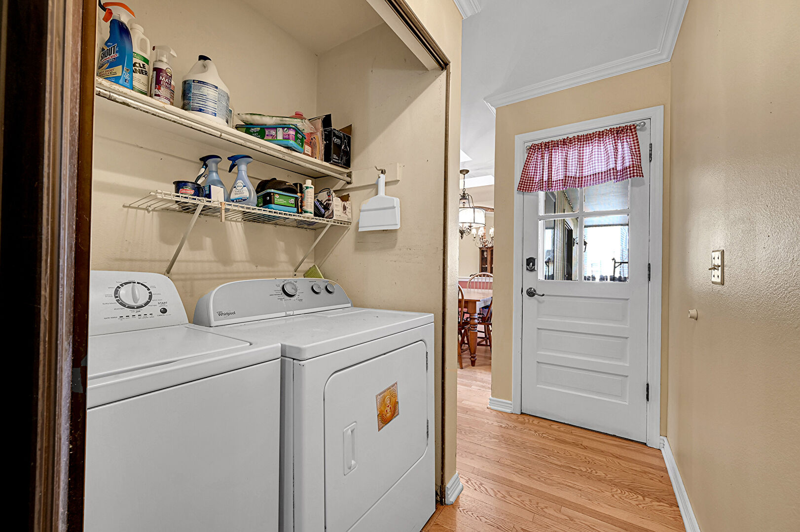 Baseboards Wall, Crown Molding, Drywall, Natural Light, Wood Finish Floor, Laundry