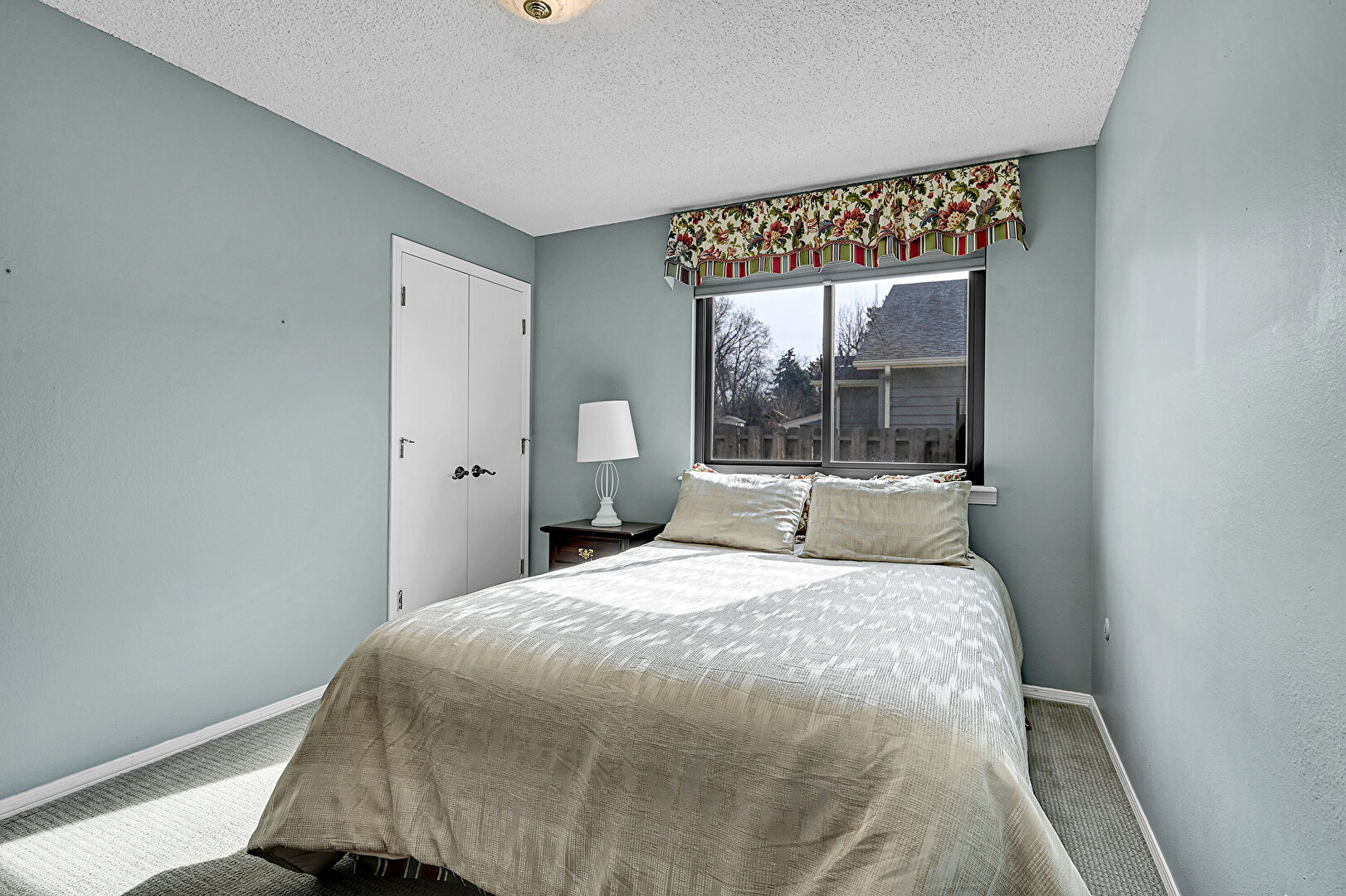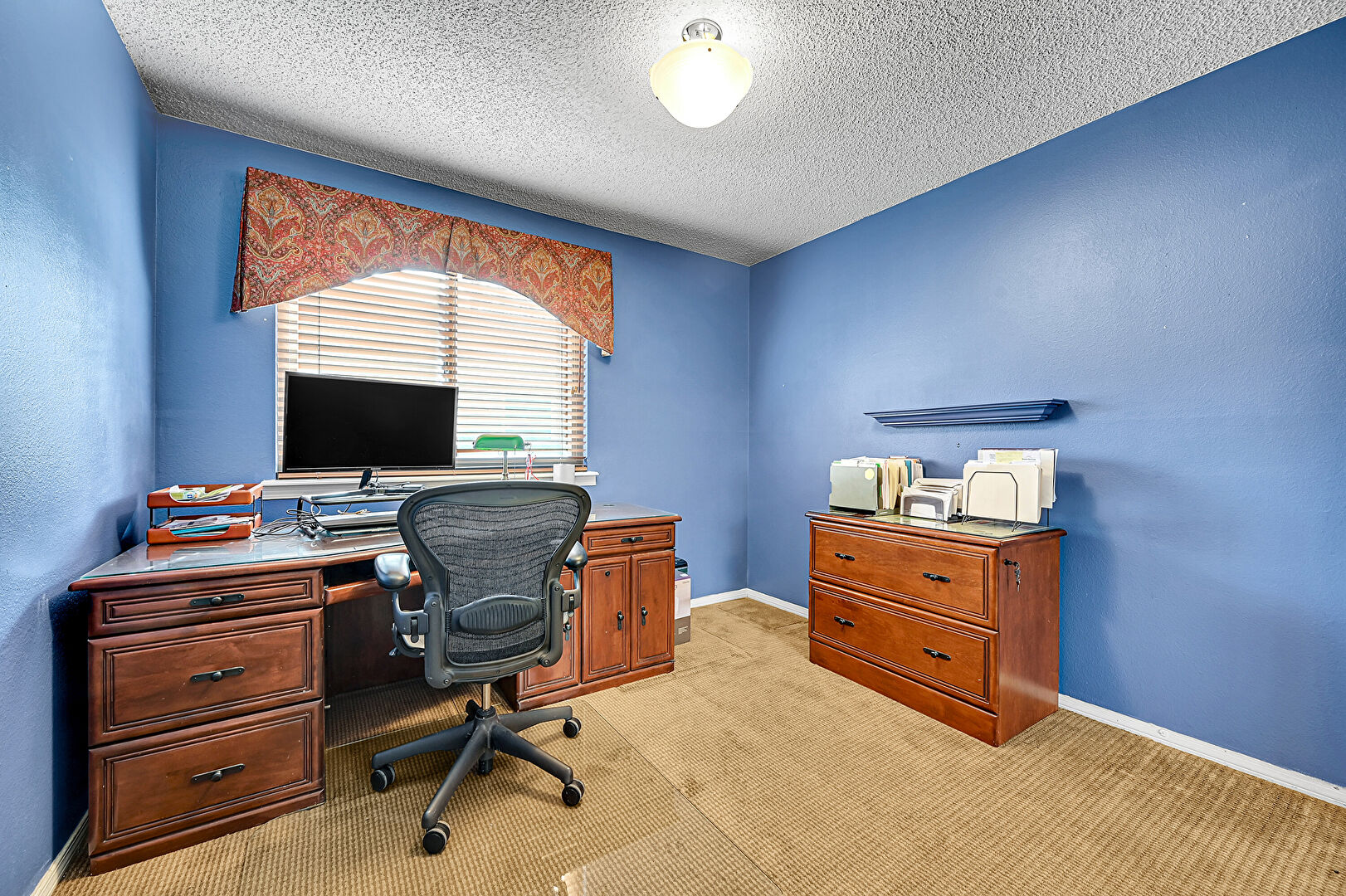 Baseboards Wall, Brick Siding, Carpet, Closet, Downspout, Driveway, Drywall, Fence, Natural Light, Office Area, Textured Ceiling, Textured Wall, Vent, Vertical Siding, Carpet, Chimney, Drywall, Natural Light, Smoke Carbon Monoxide Detector, Textured Ceiling