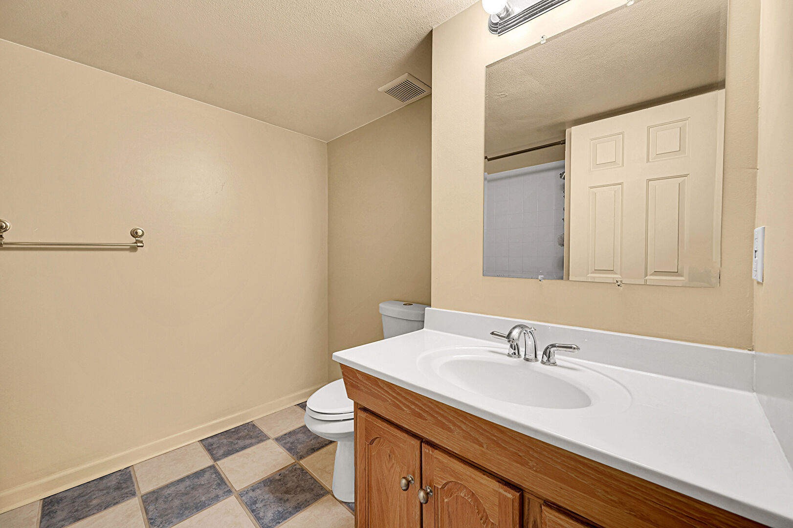 Baseboards Wall, Drywall, Full Bathroom, Textured Ceiling, Tile Floor, Vanity, Vaulted Ceiling, Vent, Vinyl Floor, Textured Wall, Vanity