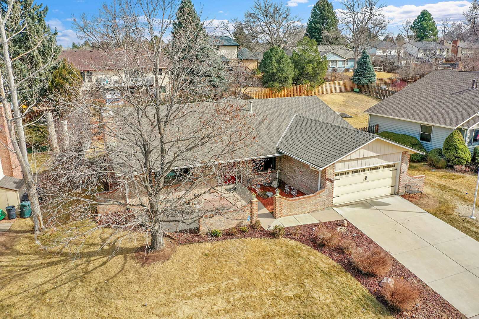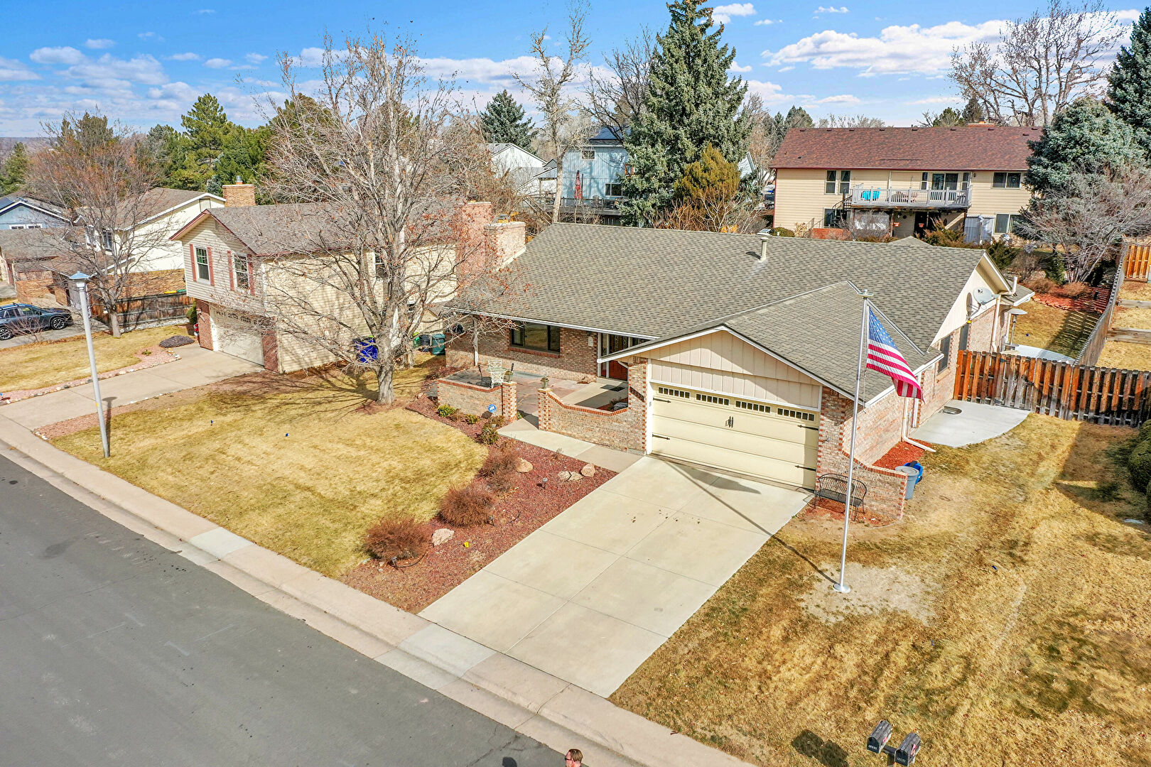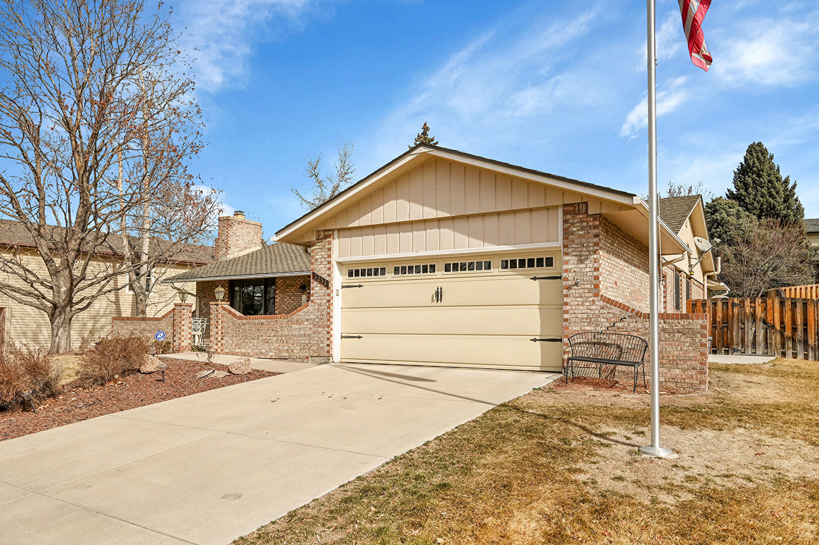 Board Batten Siding, Brick Siding, Chimney, Concrete Foundation, Downspout, Driveway, Fence, Gutters, Lawn, Patio, Porch, Residential View, Shingle Roof, Vertical Siding, Brick Siding, Driveway, Fence, Gutters, Lawn, Residential View, Shingle Roof, Vertical Siding