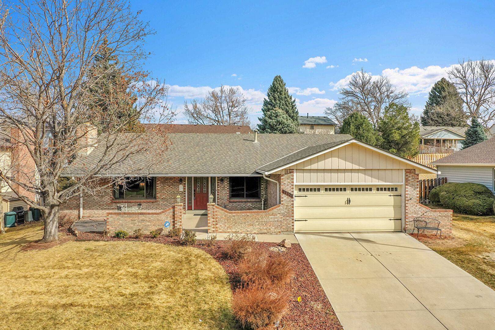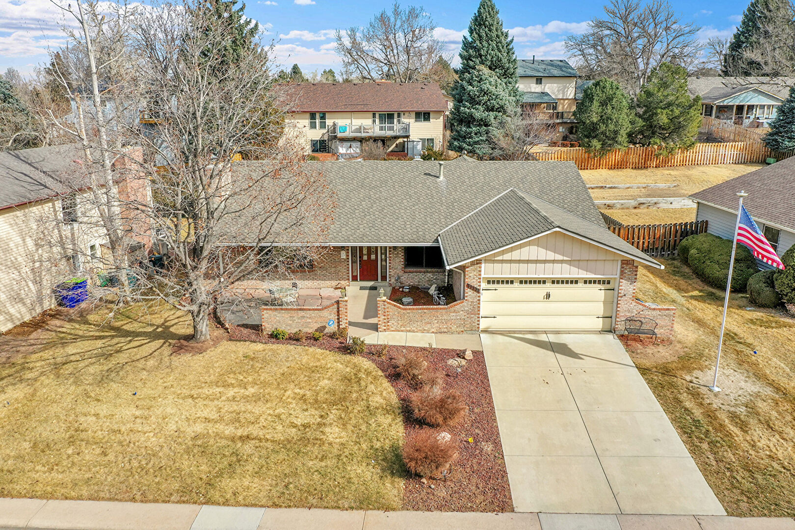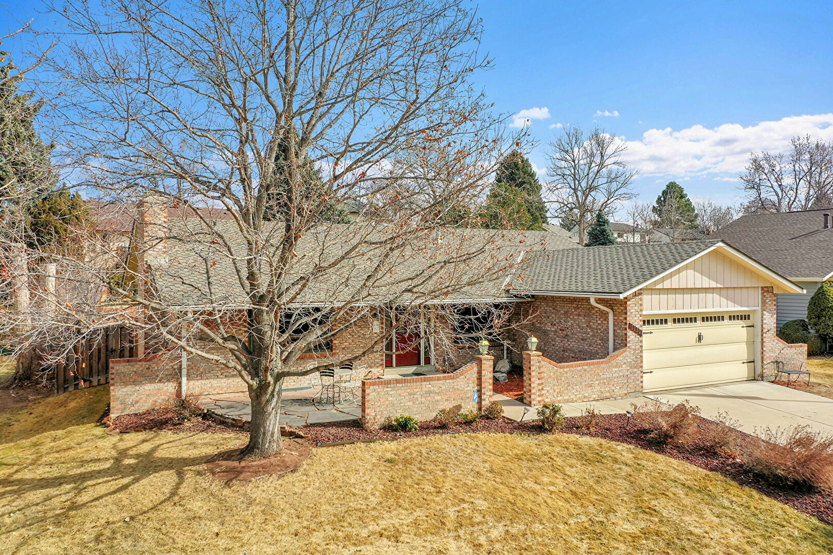 Board Batten Siding, Brick Siding, Chimney, Concrete Foundation, Downspout, Driveway, Fence, Gutters, Lawn, Patio, Porch, Residential View, Shingle Roof, Vertical Siding, Brick Siding, Driveway, Fence, Gutters, Lawn, Residential View, Shingle Roof, Vertical Siding