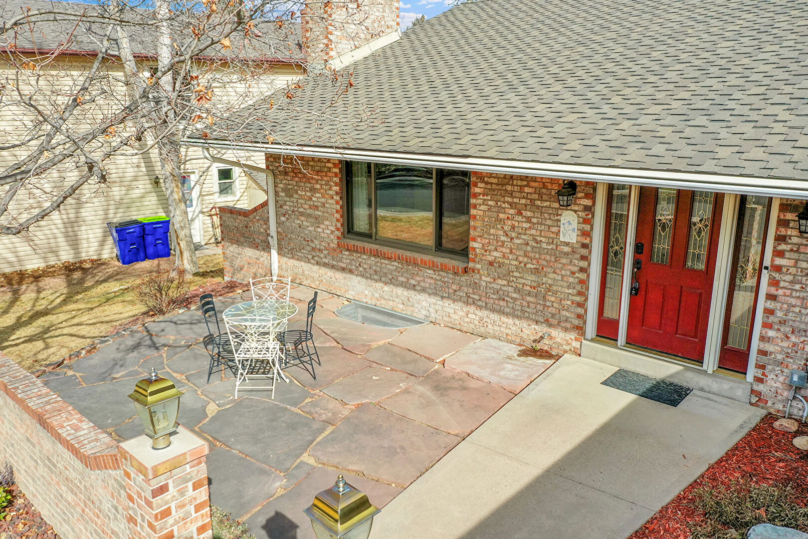 Brick Siding, Chimney, Gutters, Outdoor Dining Area, Porch, Shingle Roof, Downspout, Patio, Stoop