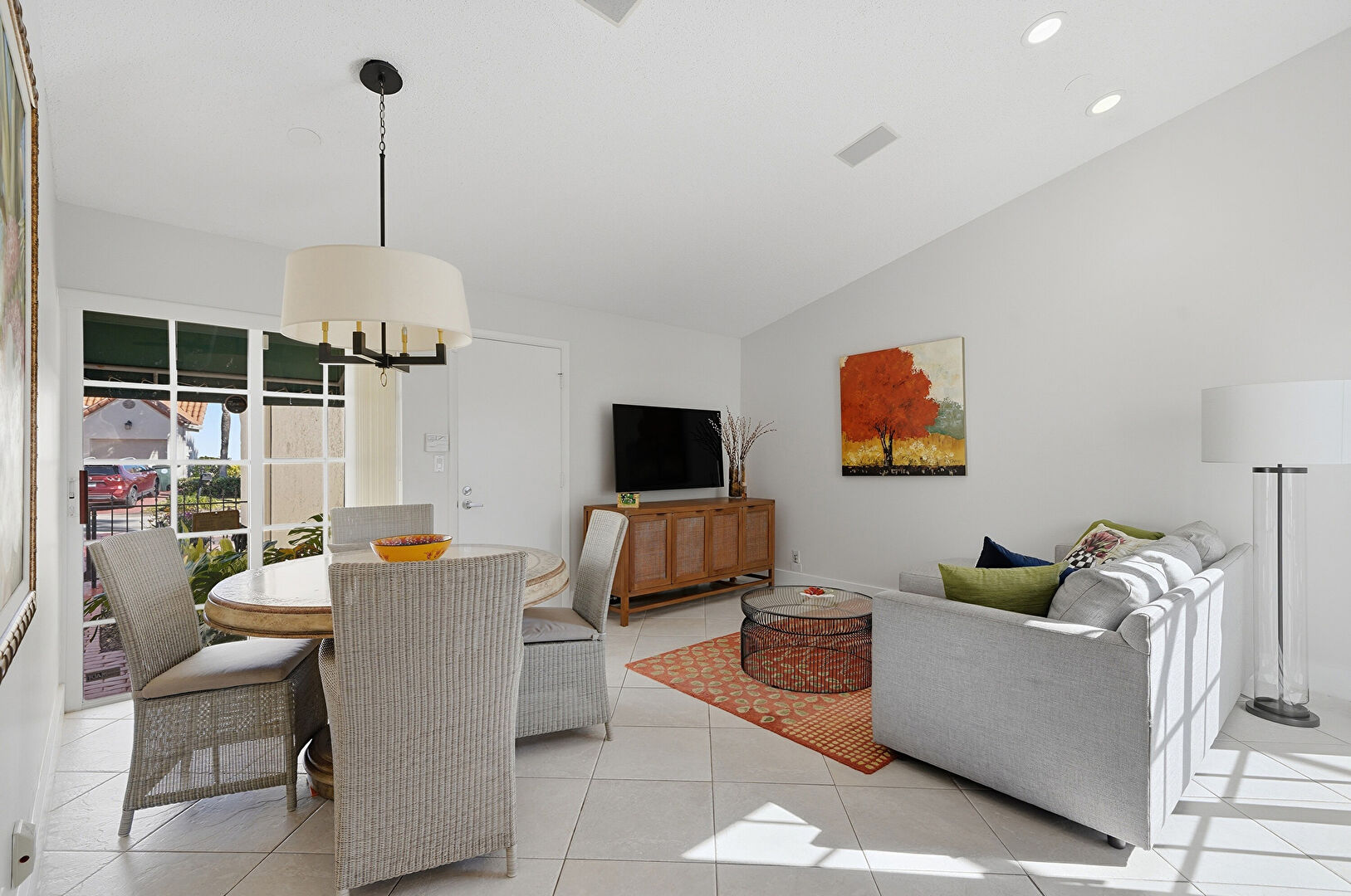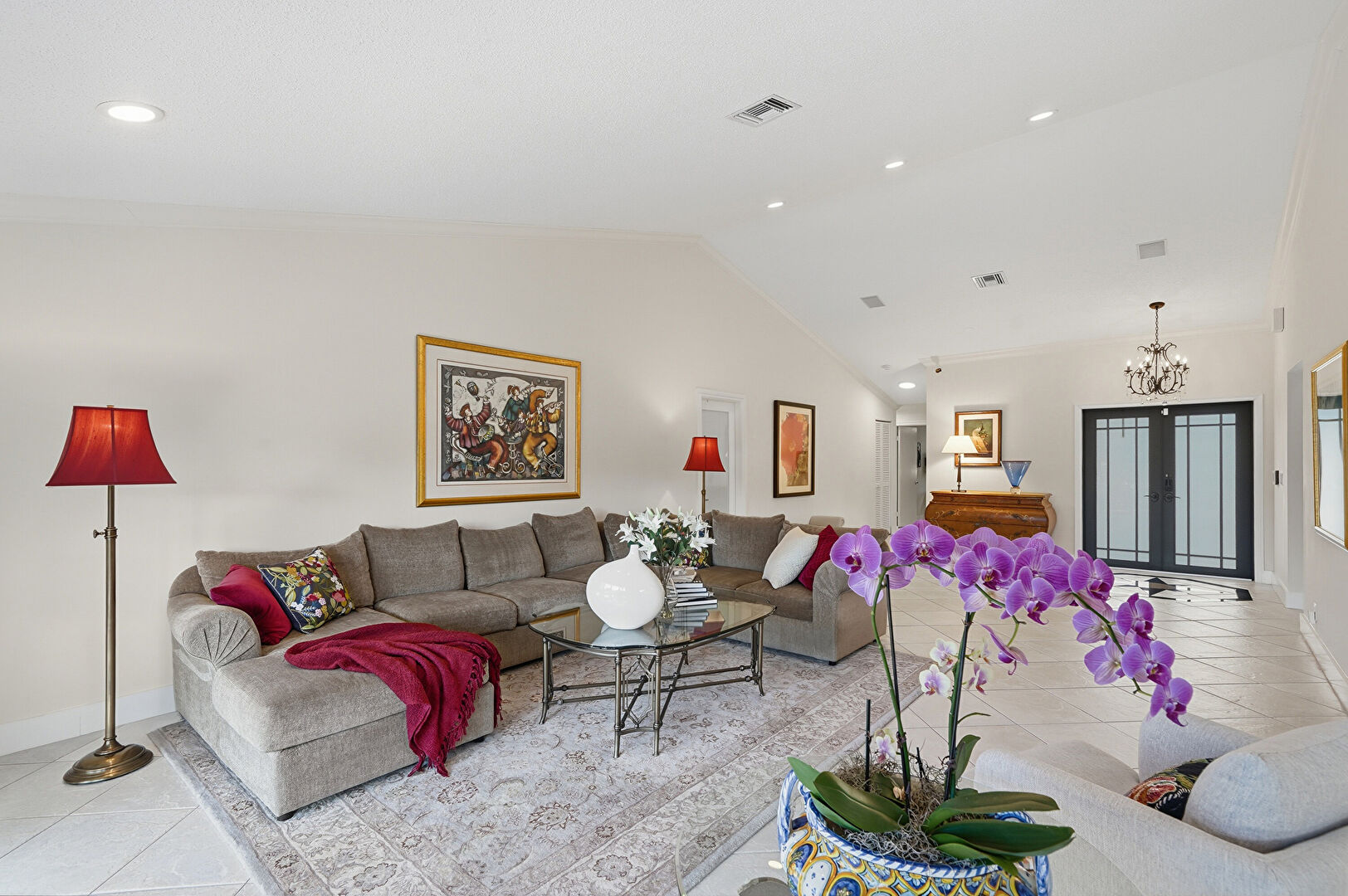 Baseboards Wall, Crown Molding, Drywall, Natural Light, Notable Chandelier, Recessed Lighting, Tile Floor, Vaulted Ceiling, Vent, Baseboards Wall, Notable Chandelier, Vaulted Ceiling