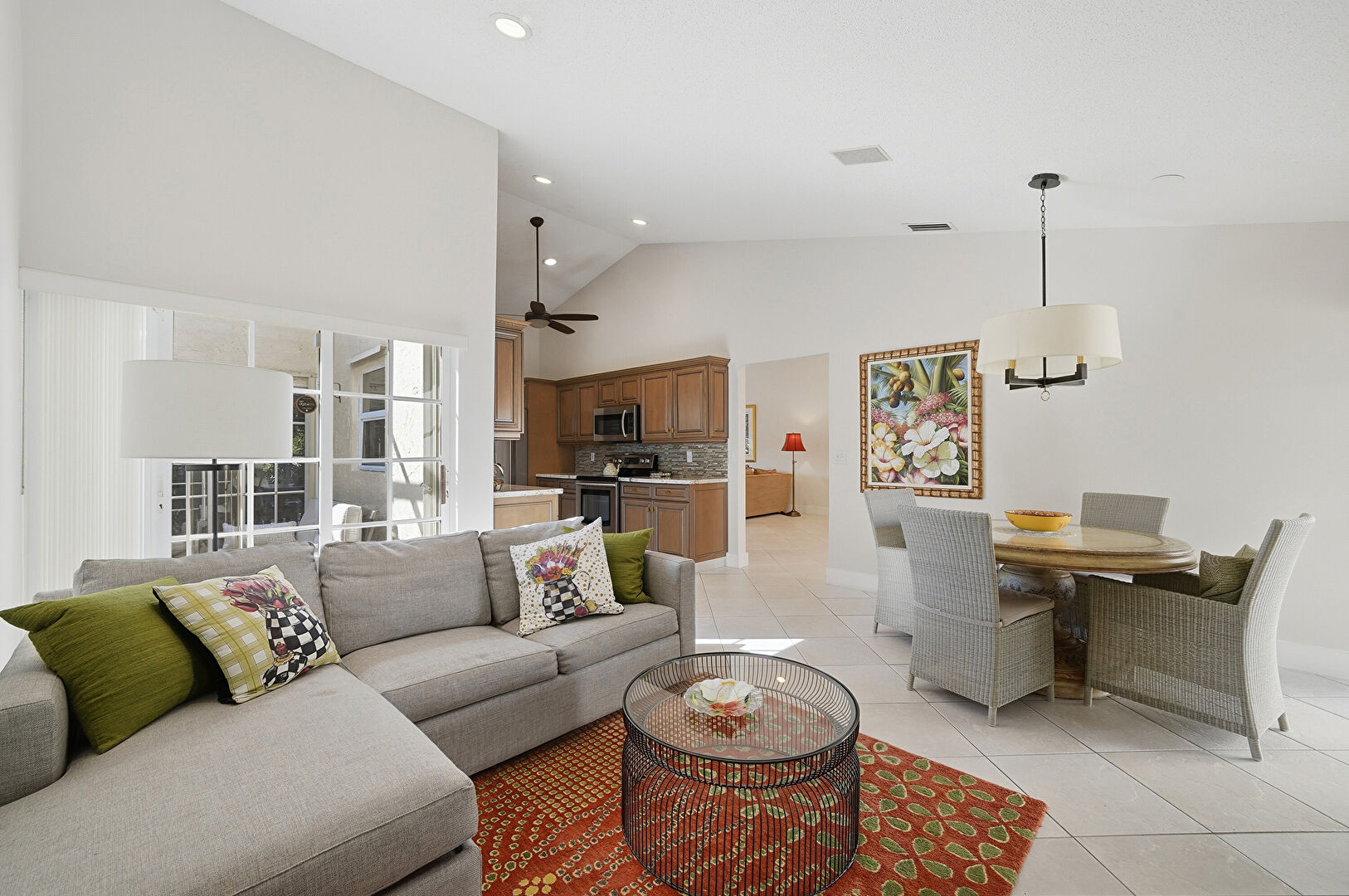 Baseboards Wall, Ceiling Fan, Drywall, Galley Kitchen, High Ceiling, Natural Light, Notable Chandelier, Recessed Lighting, Tile Floor, Vaulted Ceiling, Vent, Baseboards Wall, Ceiling Fan, Tile Floor