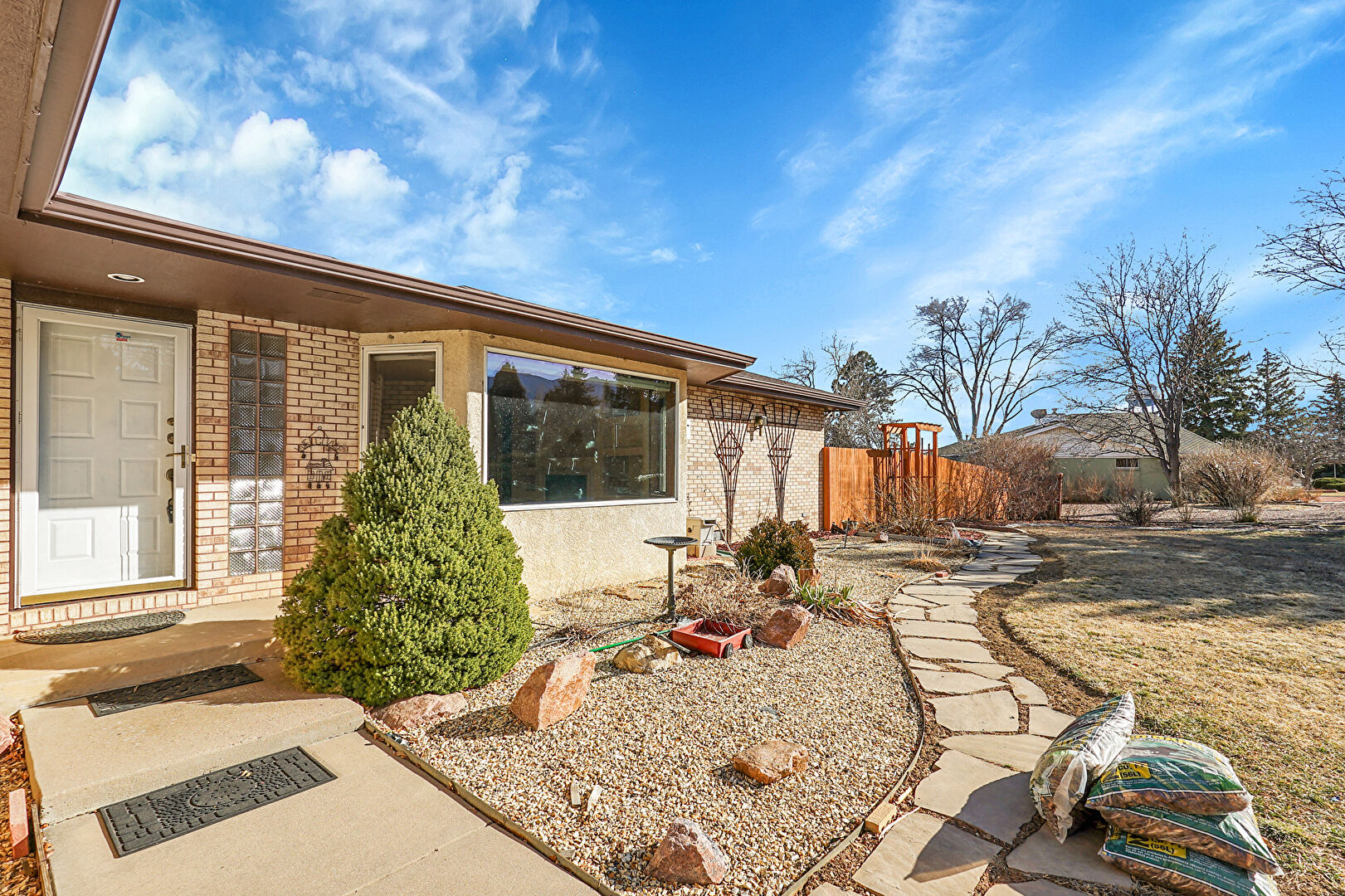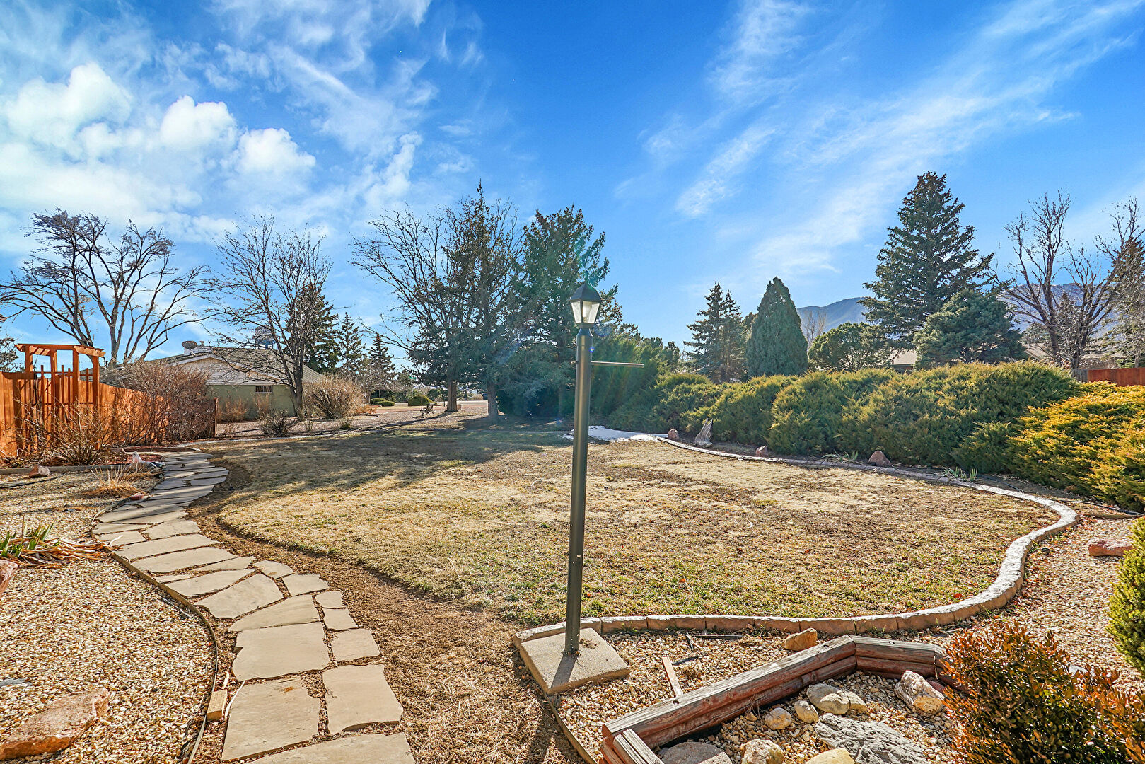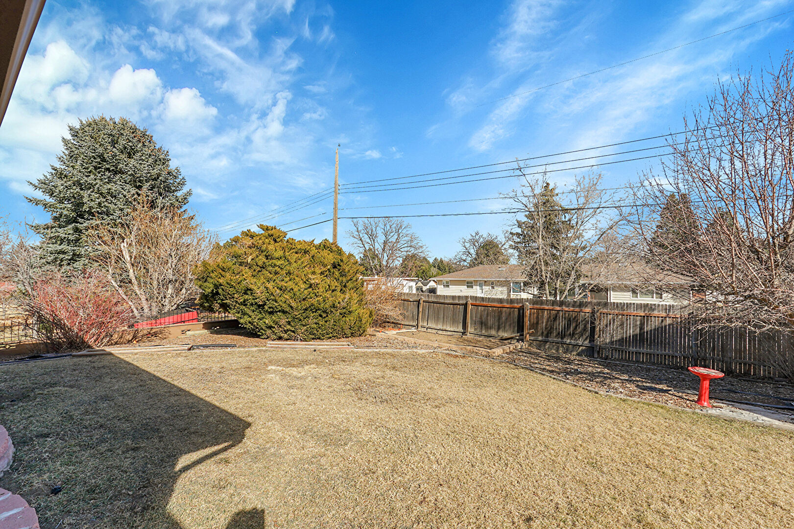 Concrete Foundation, Deck, Downspout, Fence, French Doors, Garden, Gutters, Lawn, Outdoor Structure, Satellite Dish, Shed, Stucco Siding, Patio