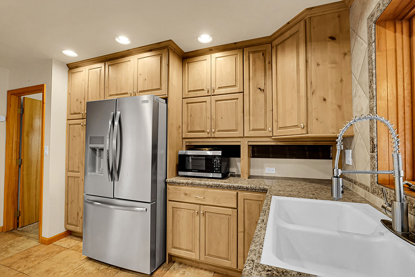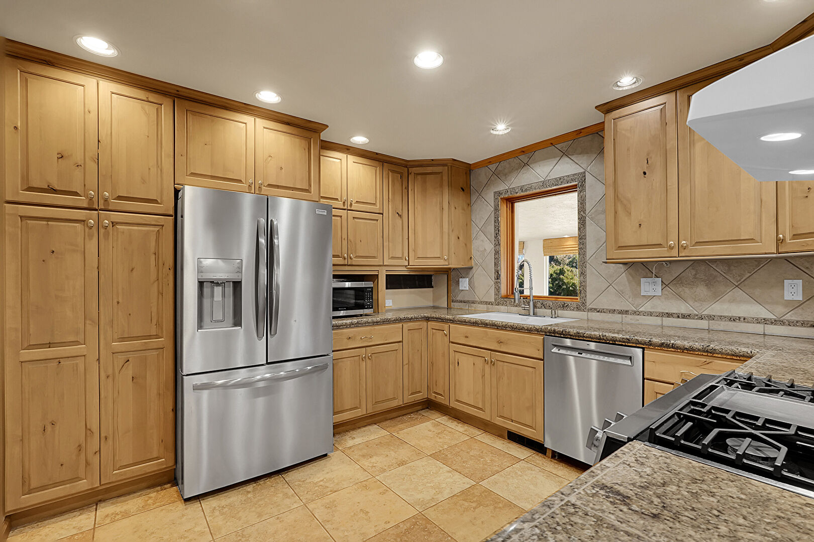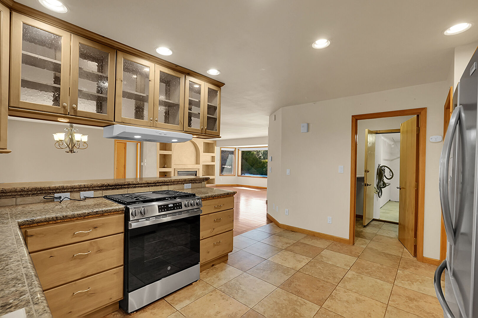 Baseboards Wall, Crown Molding Cabinets, Drywall, Glass Insert Cabinets, Natural Light, Raised Cabinets, Recessed Lighting, Stone Countertops, Tile Floor, U Shaped Kitchen, Crown Molding Cabinets, Drywall, Kitchen Peninsula, Medium Brown Cabinets