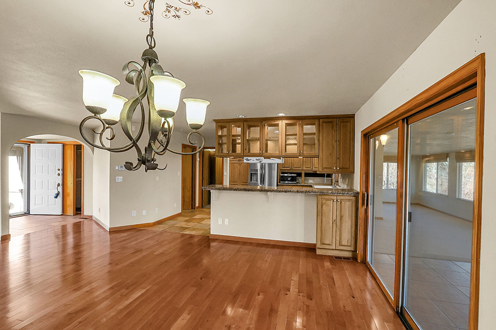 Arched Walkways, Baseboards Wall, Built In Shelves, Crown Molding Cabinets, Drywall, Glass Insert Cabinets, Kitchen Bar, Kitchen Peninsula, Medium Brown Cabinets, Natural Light, Notable Chandelier, Opens To Living Area, Raised Cabinets, Stone Countertops, U Shaped Kitchen, Vent, Wood Finish Floor, Fireplace, Pendant Lighting