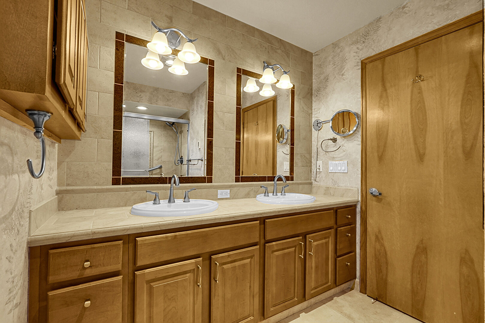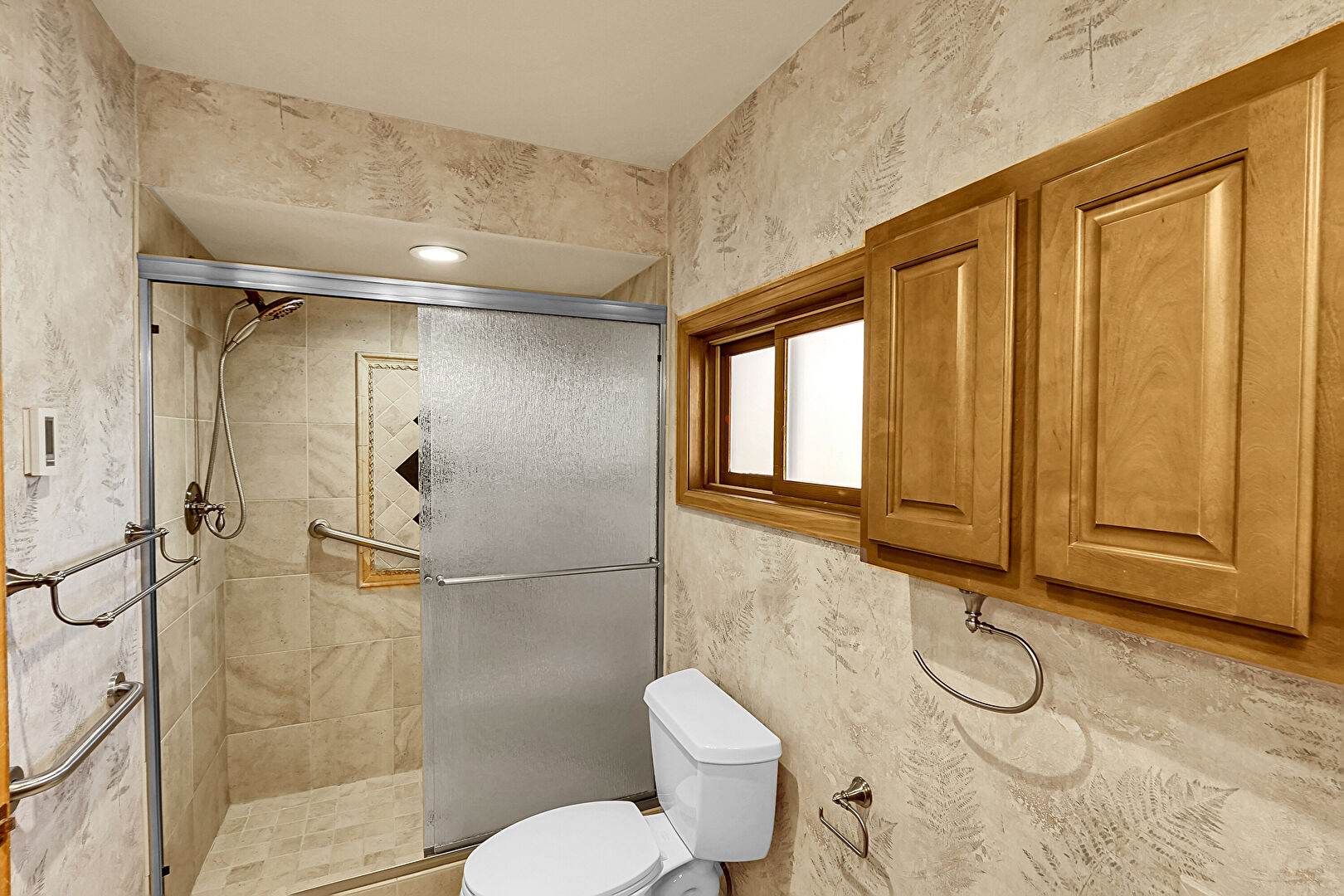 Baseboards Wall, Combined Bath Shower, Full Bathroom, Recessed Lighting, Tile Floor, Tile Wall, Vanity, Vent, Wallpaper Wall, Combined Bath Shower, Vanity