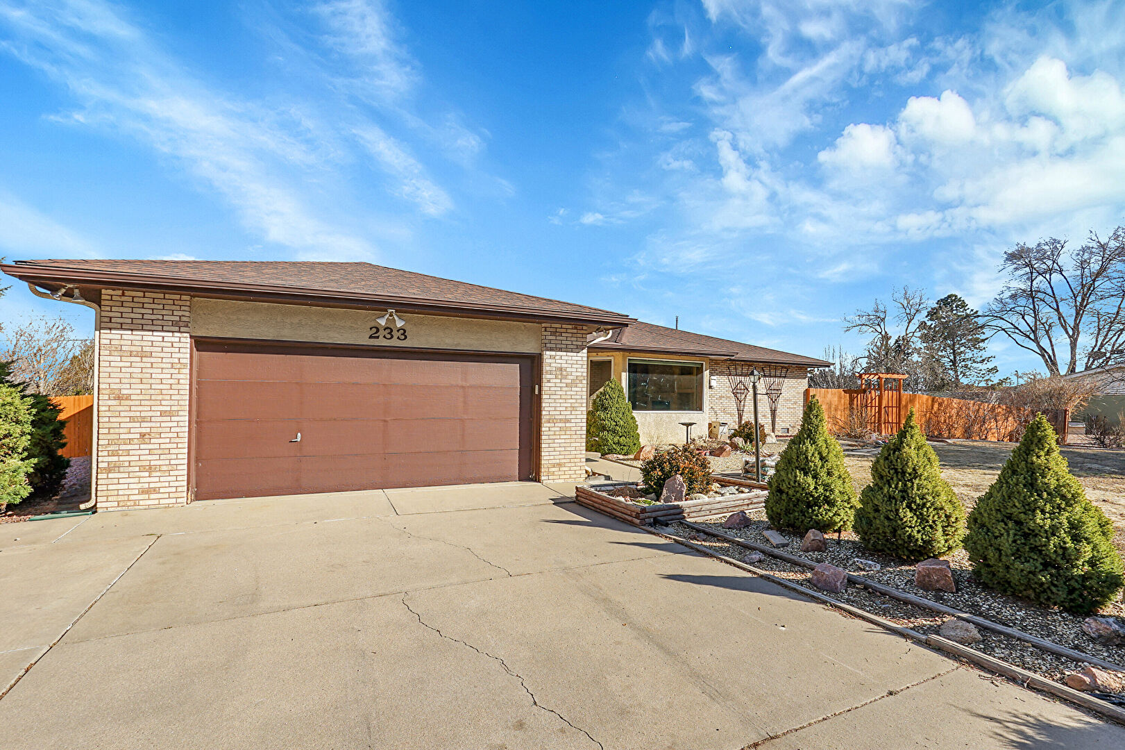 Chimney, Detached Garage, Fence, Garage, Lawn, Shingle Roof, Vertical Siding, Concrete Foundation, Driveway, Fire Extinguisher, Garage Door Opener