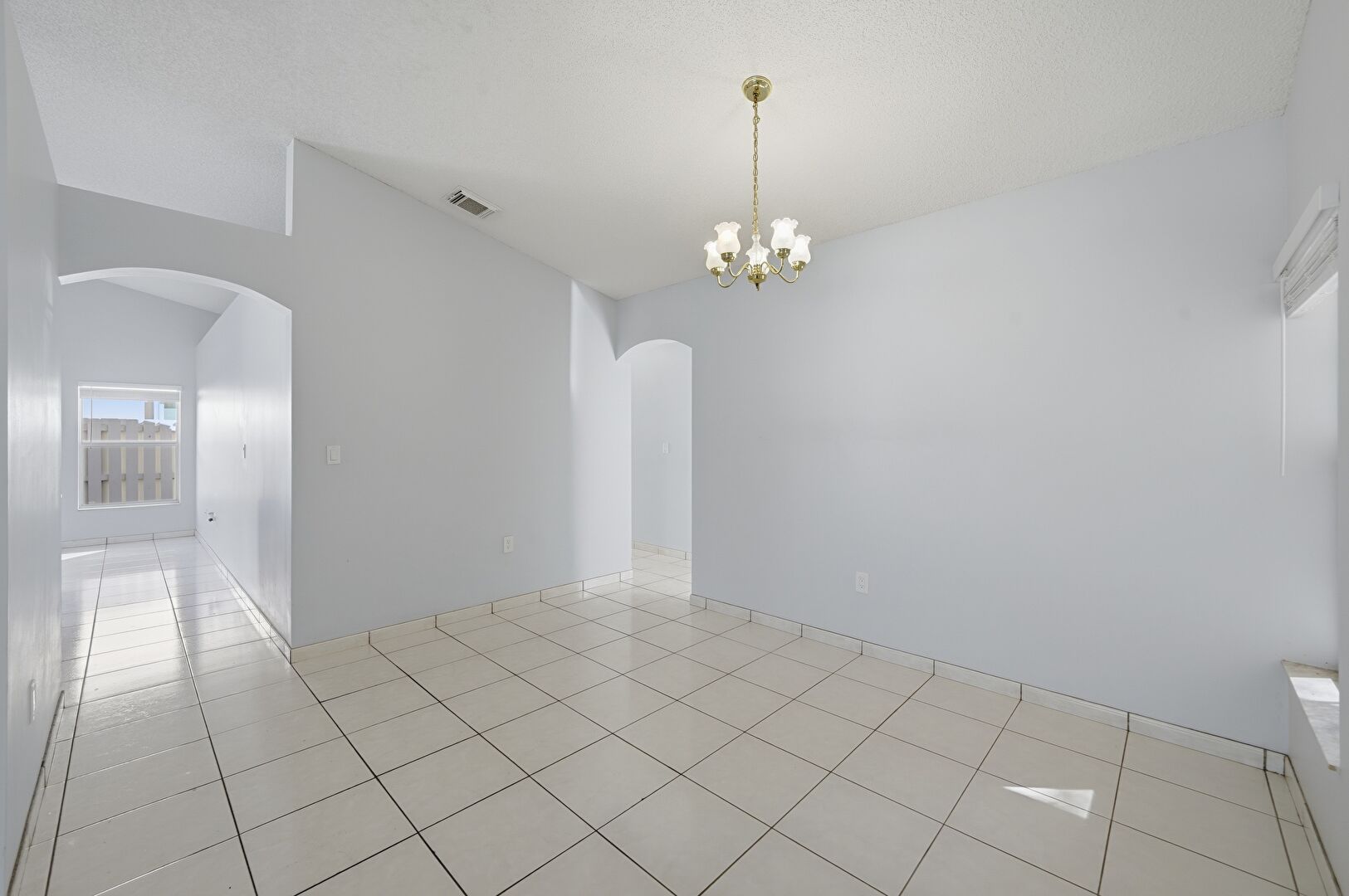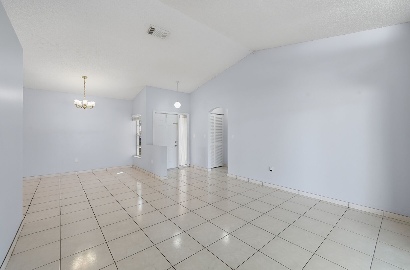 Arched Walkways, Baseboards Wall, Drywall, High Ceiling, Natural Light, Notable Chandelier, Textured Ceiling, Tile Floor, Vaulted Ceiling, Vent, Drywall, Notable Chandelier, Tile Floor