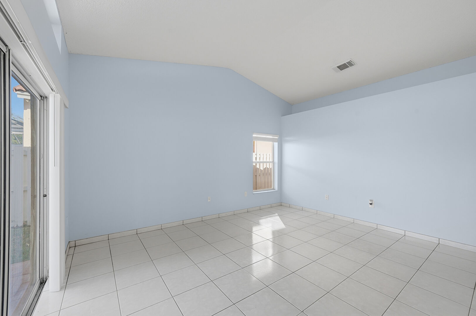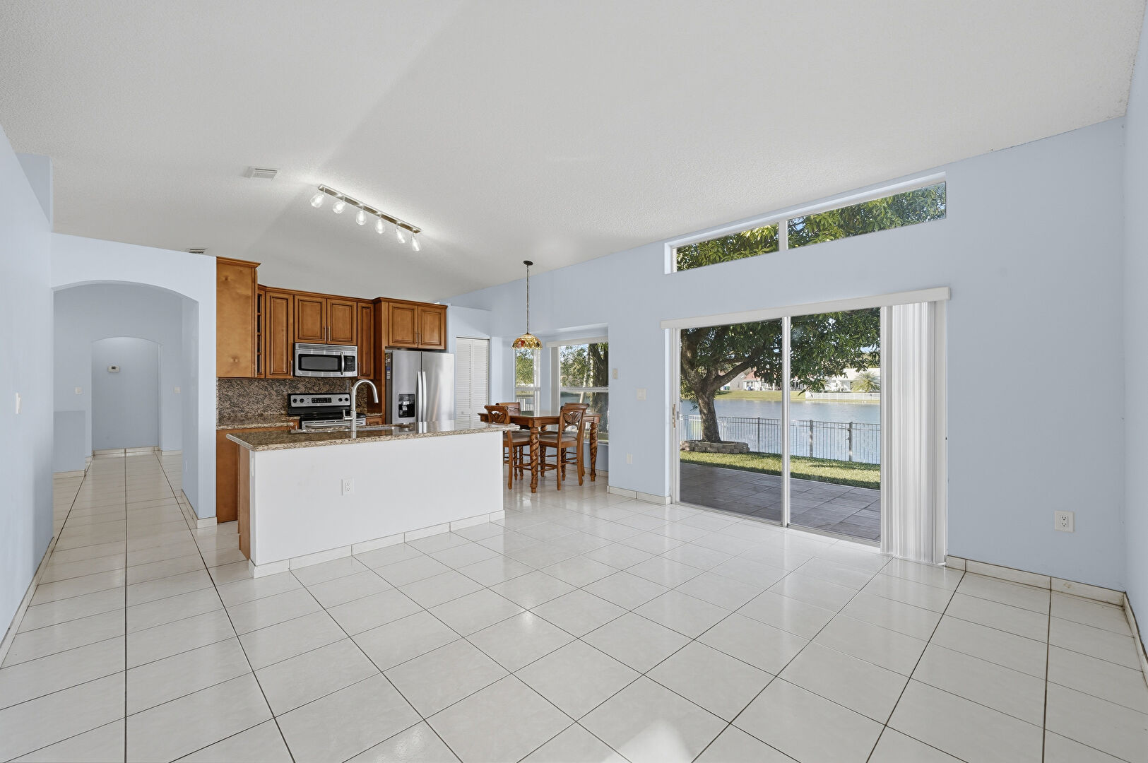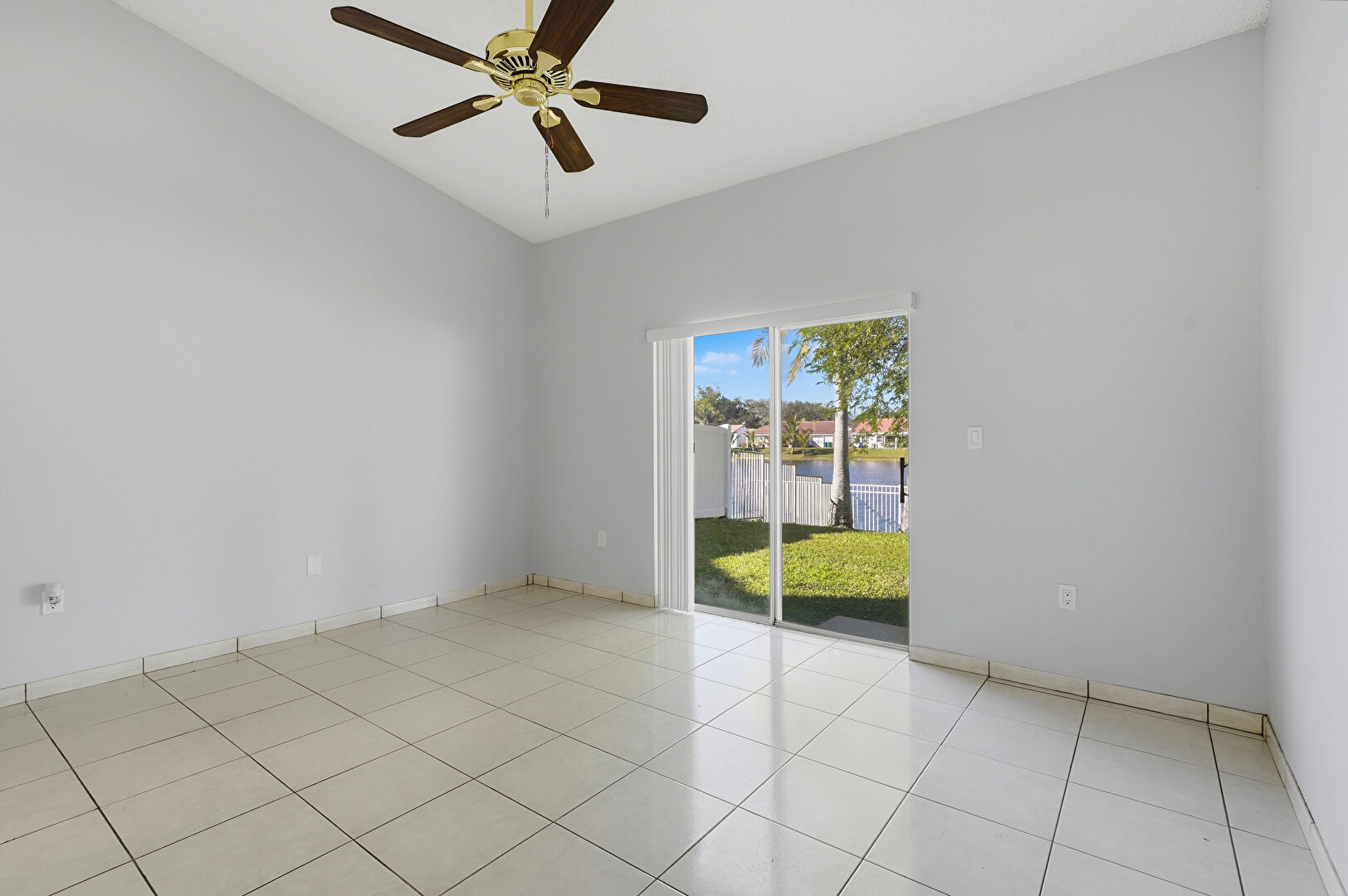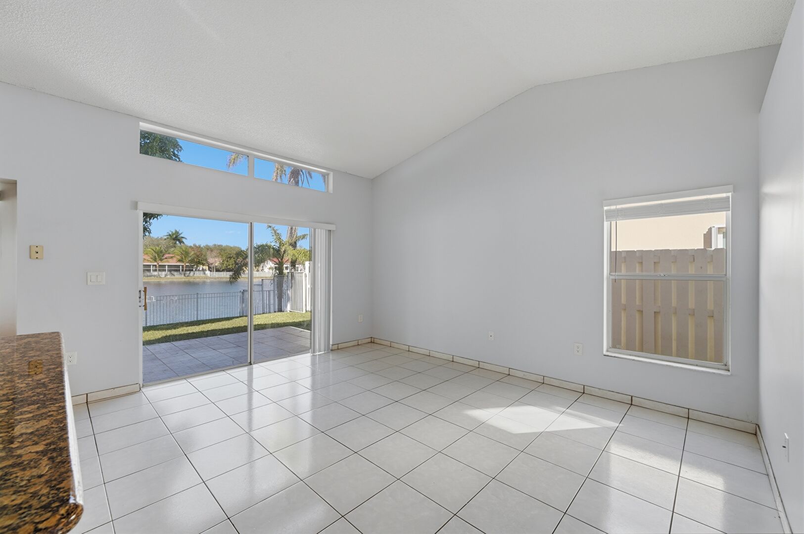Baseboards Wall, Ceiling Fan, Drywall, High Ceiling, Natural Light, Tile Floor, Vaulted Ceiling, Vent, Water View, Waterfront, Drywall, High Ceiling, Vaulted Ceiling