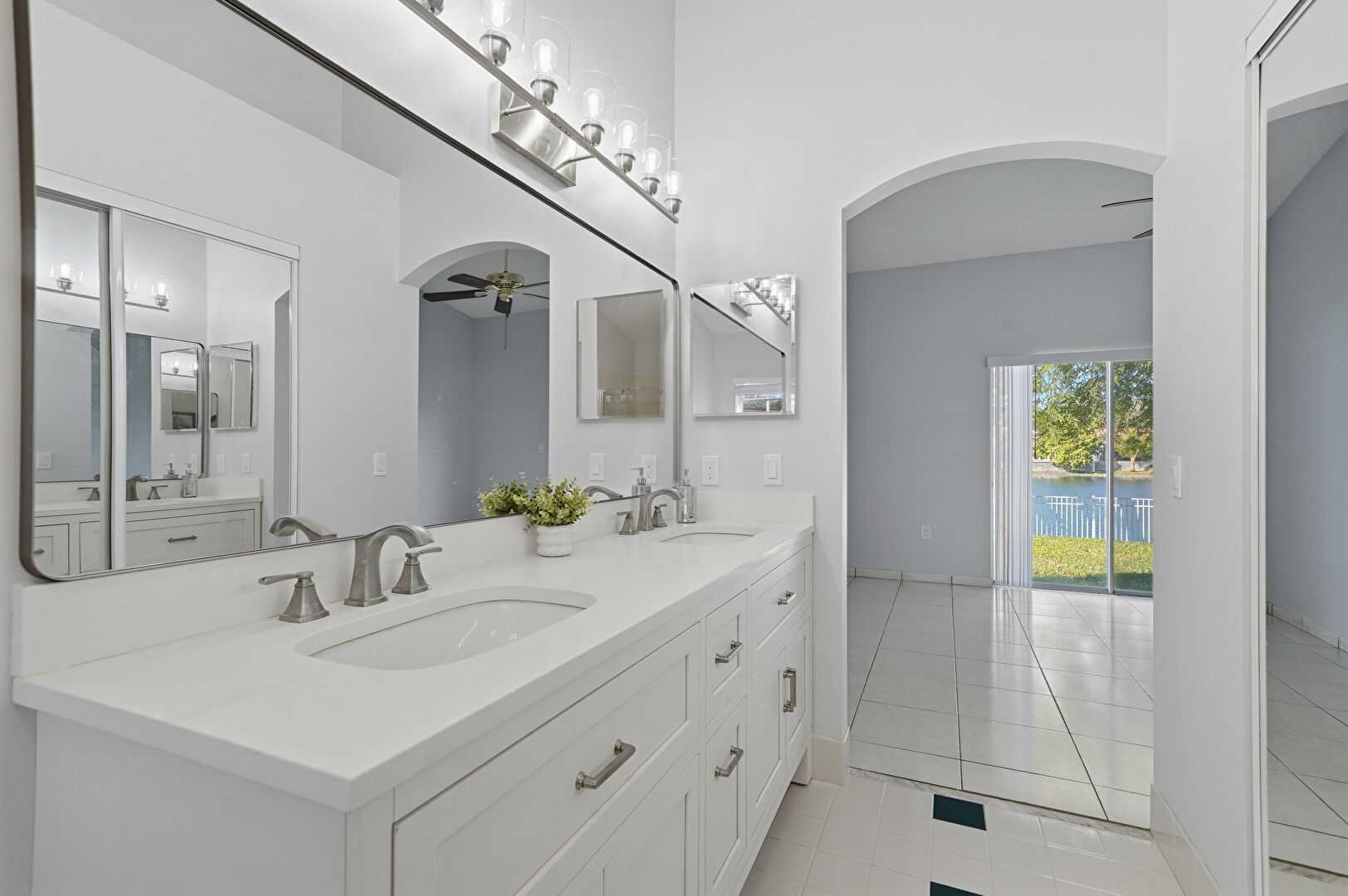 Baseboards Wall, Ceiling Fan, Double Vanity, Drywall, Full Bathroom, High Ceiling, Natural Light, Tile Floor, Vaulted Ceiling, Water View, Double Vanity, Drywall, Natural Light, Water Closet
