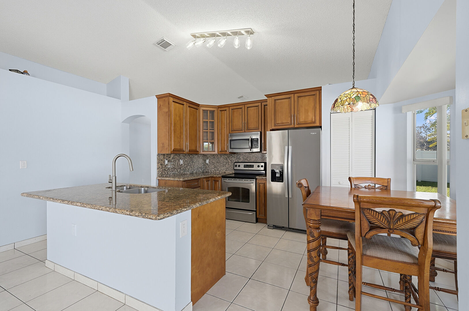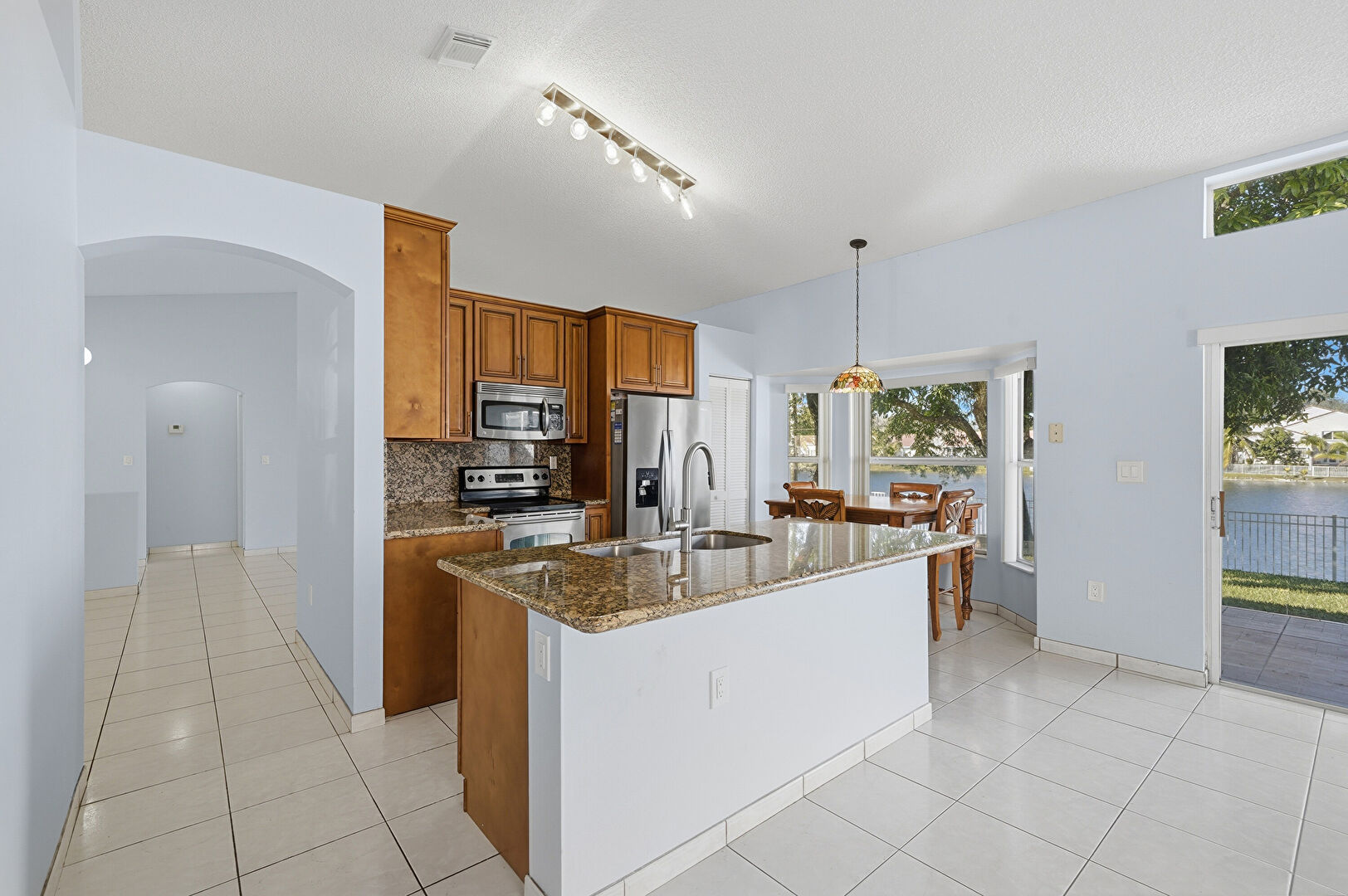 Arched Walkways, Baseboards Wall, Crown Molding Cabinets, Drywall, High Ceiling, Kitchen Island, Medium Brown Cabinets, Natural Light, Opens To Living Area, Pendant Lighting, Raised Cabinets, Shaker Cabinets, Tile Floor, Track Lighting, Vaulted Ceiling, Vent, Water View, Waterfront, Stone Countertops, Tile Floor, Vaulted Ceiling