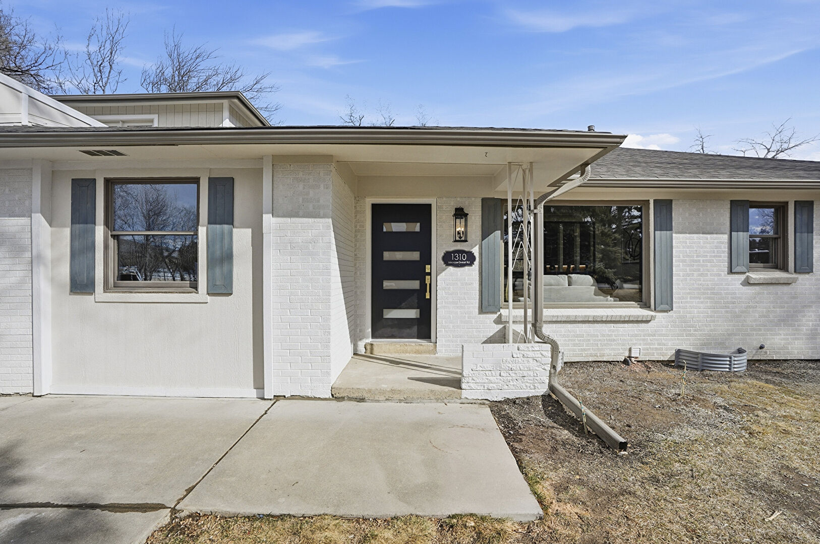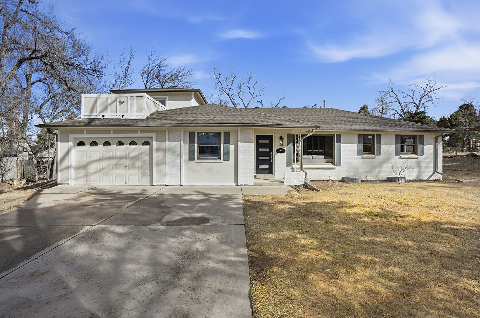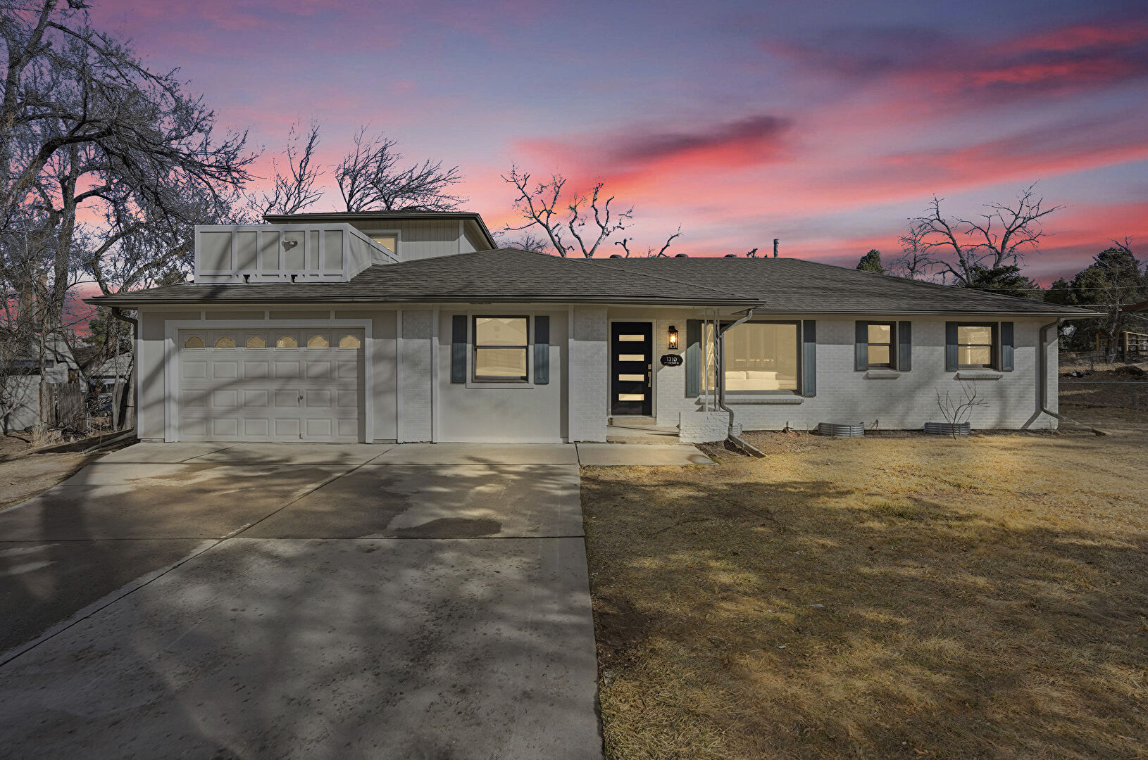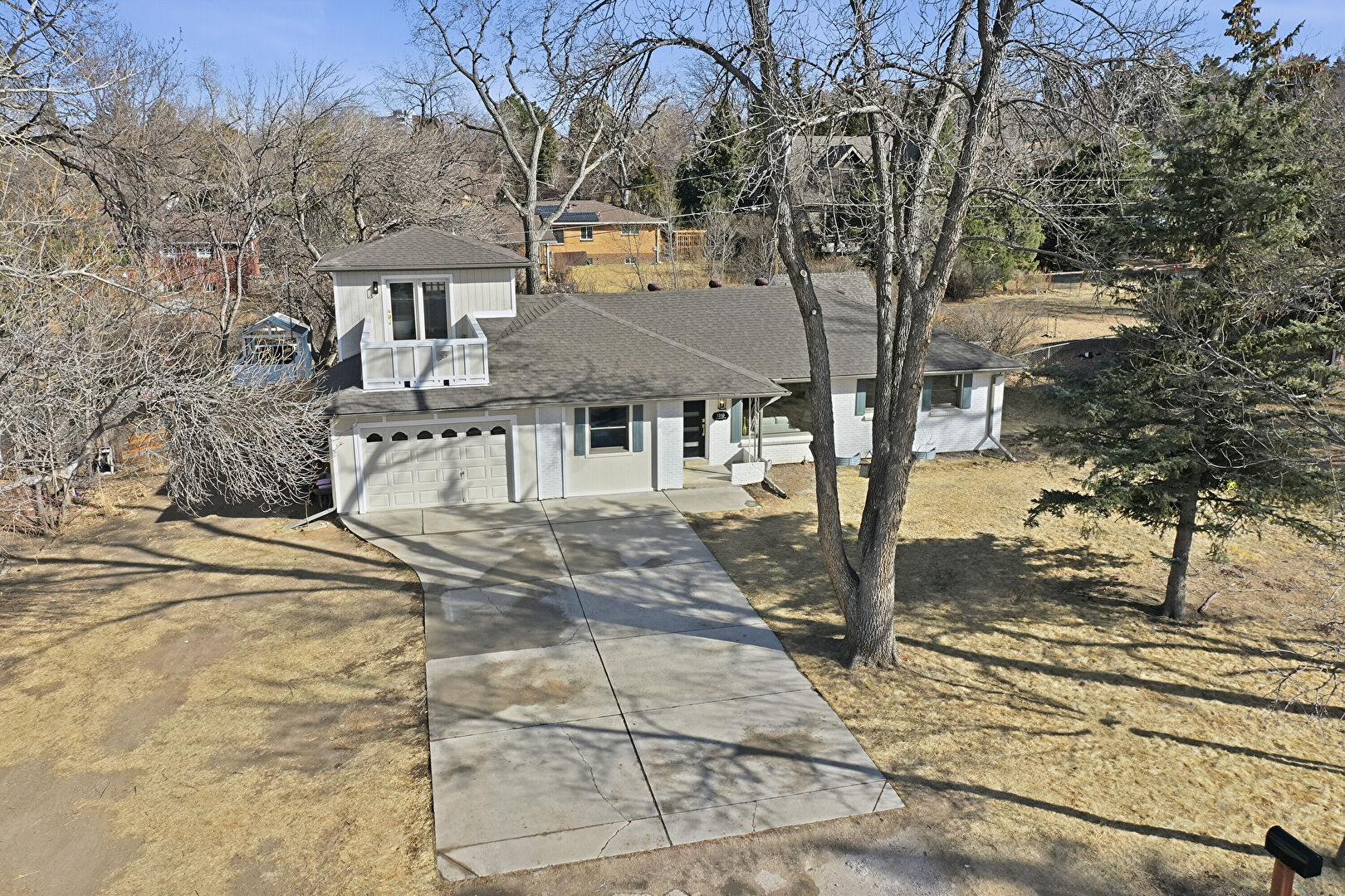 Brick Siding, Concrete Foundation, Downspout, Driveway, Fence, Garage, Gutters, Lawn, Parking Pad, Porch, Shingle Roof, Vertical Siding, Woods View, Driveway, Fence, Gutters, Lawn, Parking Pad, Shingle Roof, Stucco Siding