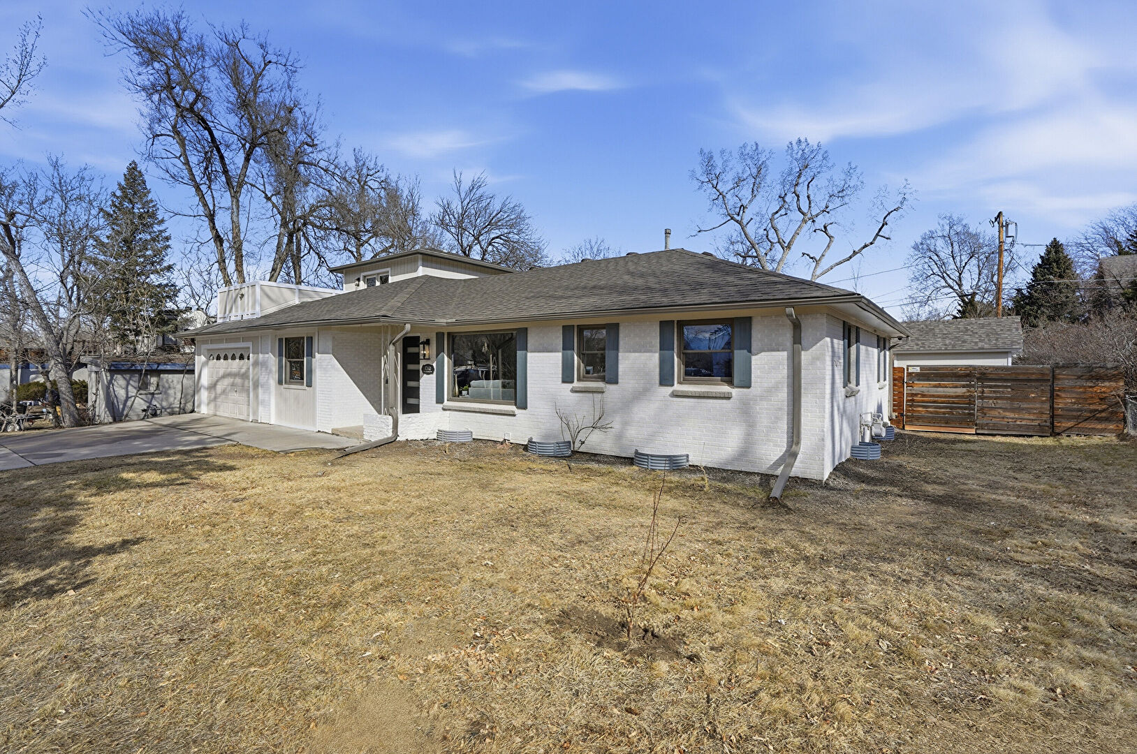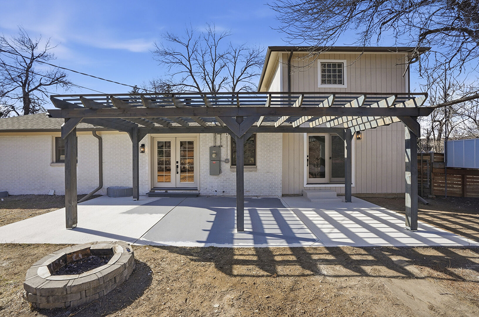 Brick Siding, Downspout, Electric Meter, Fence, Fire Pit, Foundation Piers, French Doors, Gutters, Lawn, Outdoor Structure, Patio, Pergola, Shingle Roof, Vertical Siding, Brick Siding, Fence, Lawn, Patio, Pergola, Stucco Siding, Vertical Siding