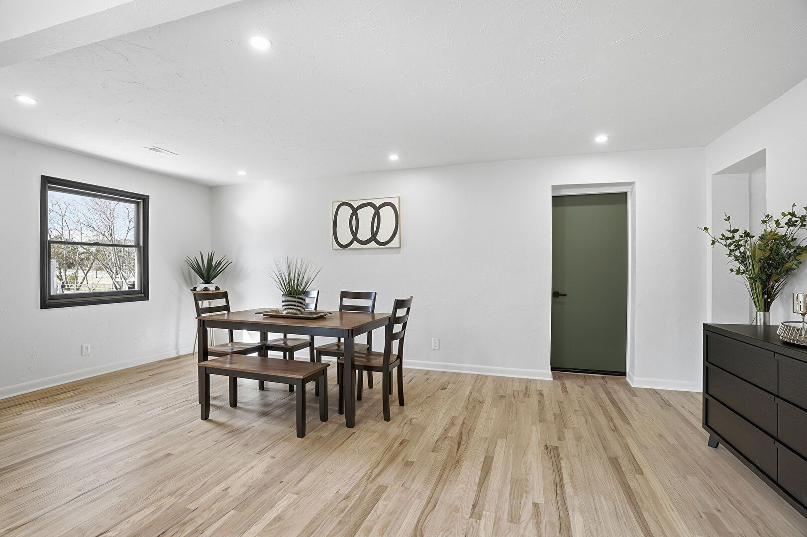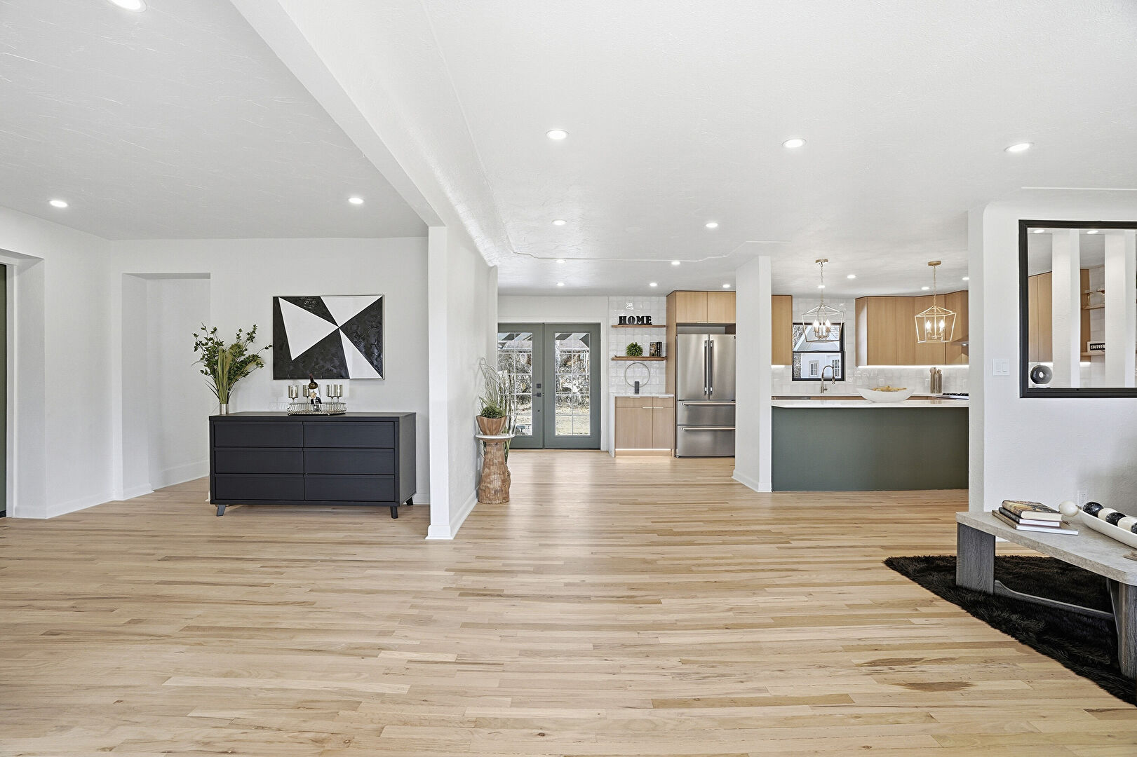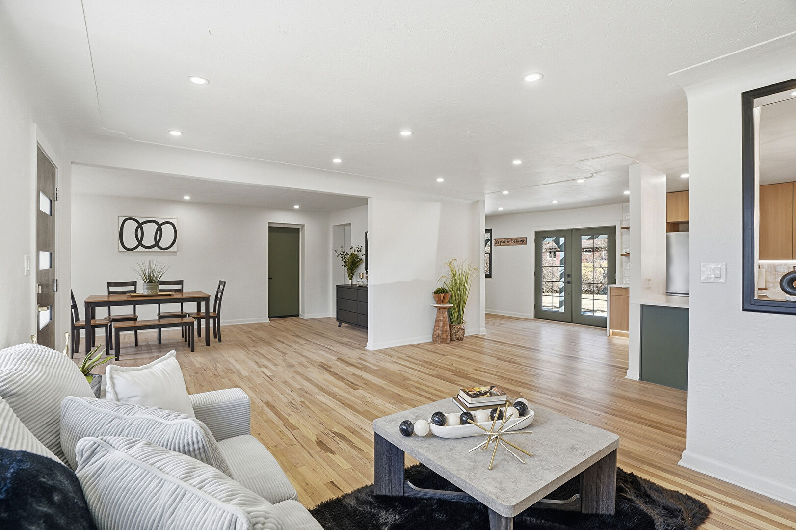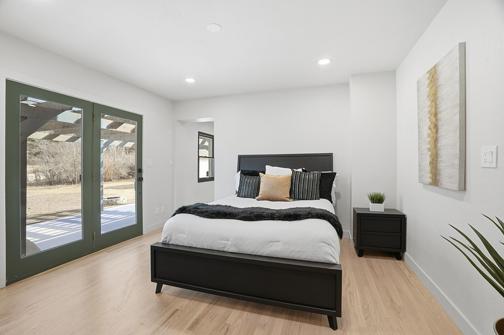 Baseboards Wall, Drywall, French Doors, Recessed Lighting, Wood Finish Floor, Natural Light