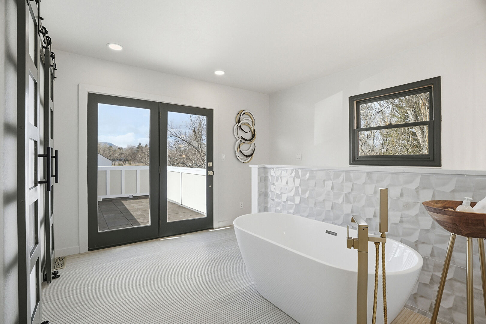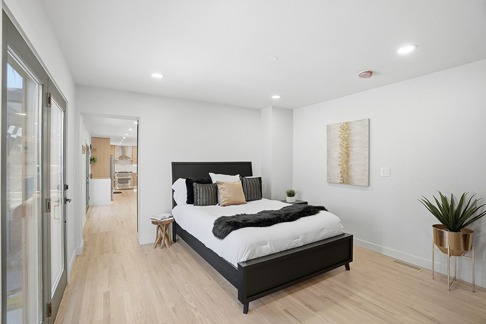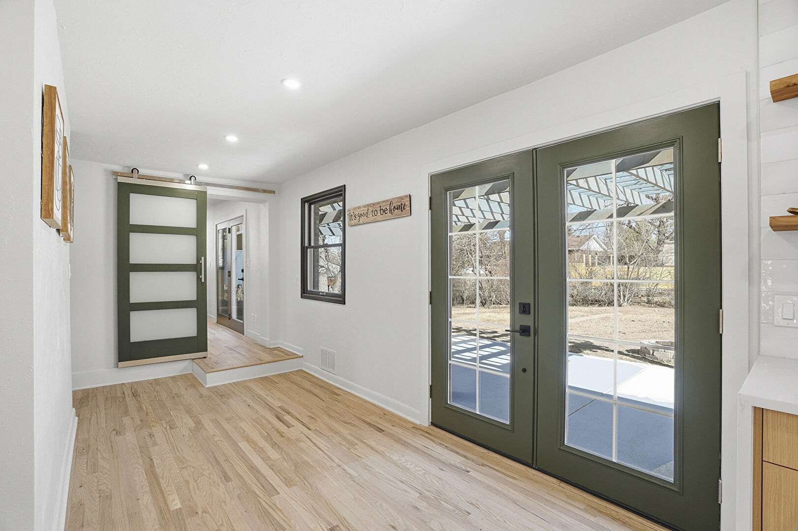 Barn Door, Baseboards Wall, Drywall, French Doors, Natural Light, Recessed Lighting, Vent, Wood Finish Floor, Vent, Wood Finish Floor