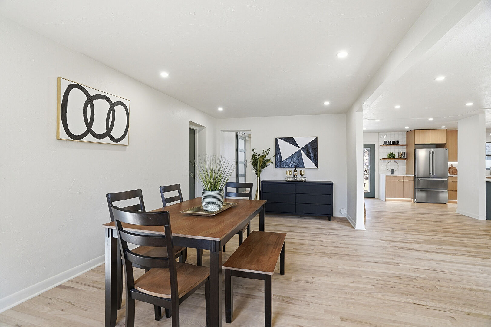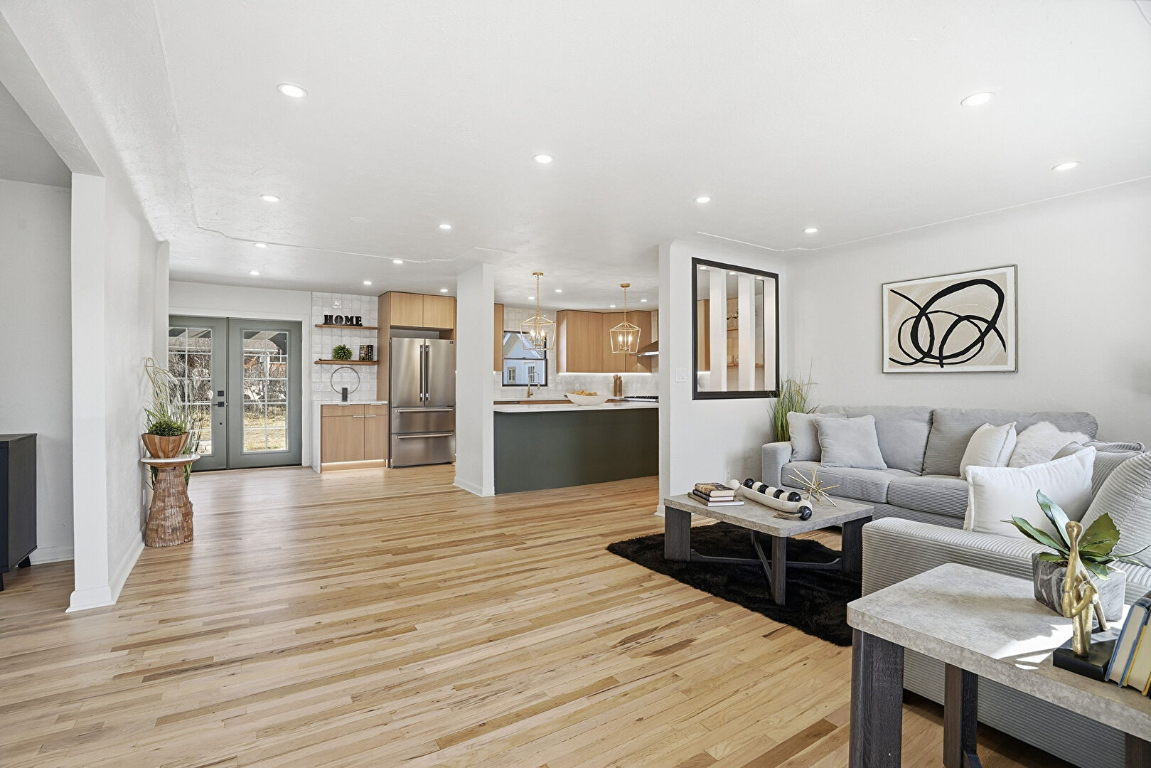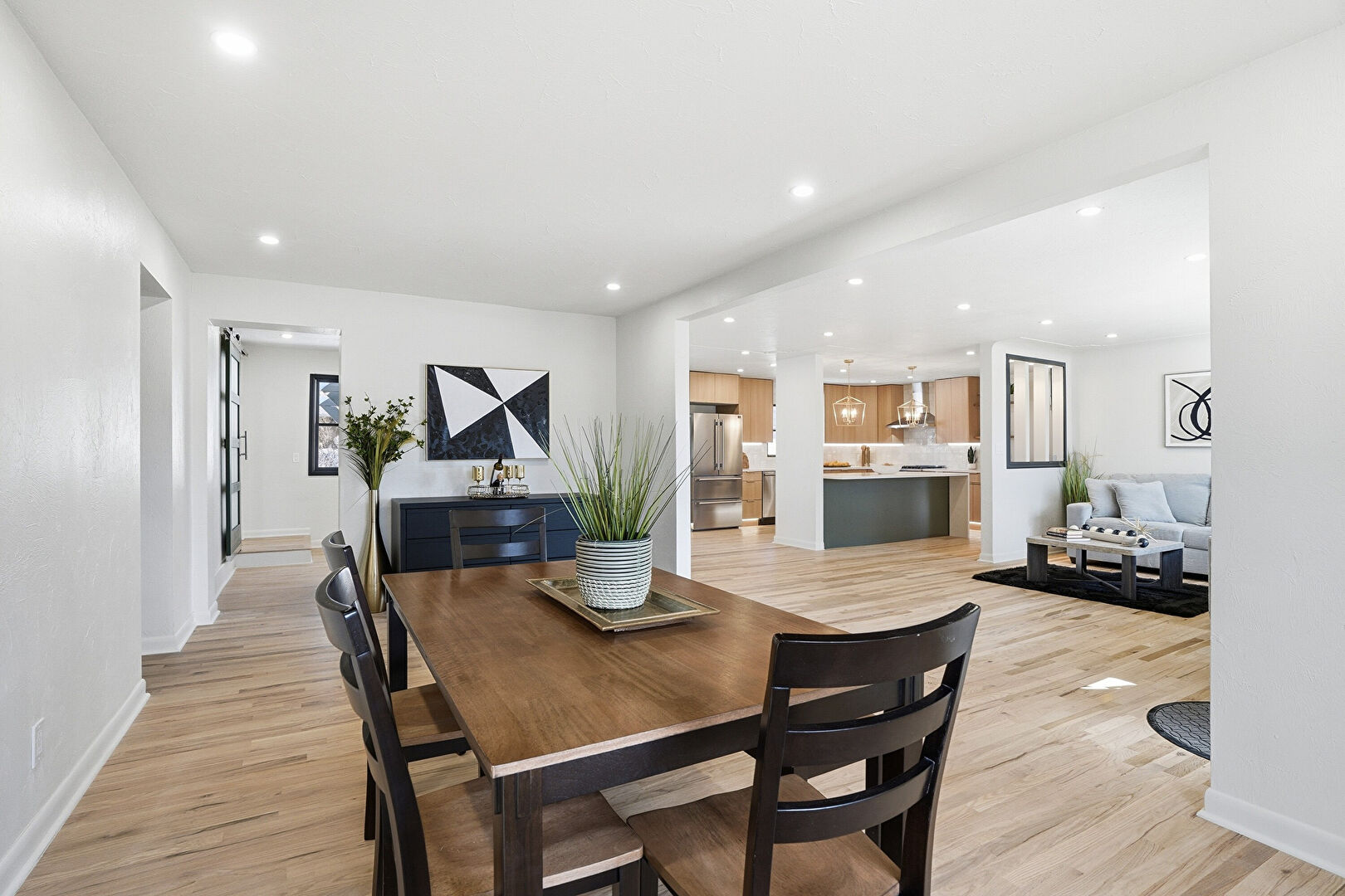Barn Door, Baseboards Wall, Drywall, French Doors, Natural Light, Recessed Lighting, Vent, Wood Finish Floor, Vent, Wood Finish Floor