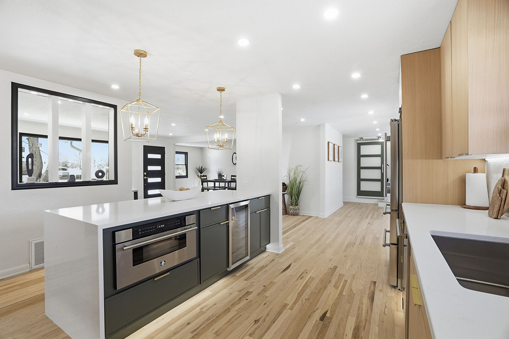 Barn Door, Baseboards Wall, Black Cabinets, Drywall, Flat Panel Cabinets, French Doors, Kitchen Bar, Kitchen Island, Kitchen Peninsula, L Shaped Kitchen, Natural Light, Notable Chandelier, Open Shelves, Opens To Living Area, Pendant Lighting, Recessed Lighting, Stone Countertops, Vent, Wine Cooler, Wood Finish Floor, Gray Cabinets, Pendant Lighting, Stone Countertops, Wood Finish Floor