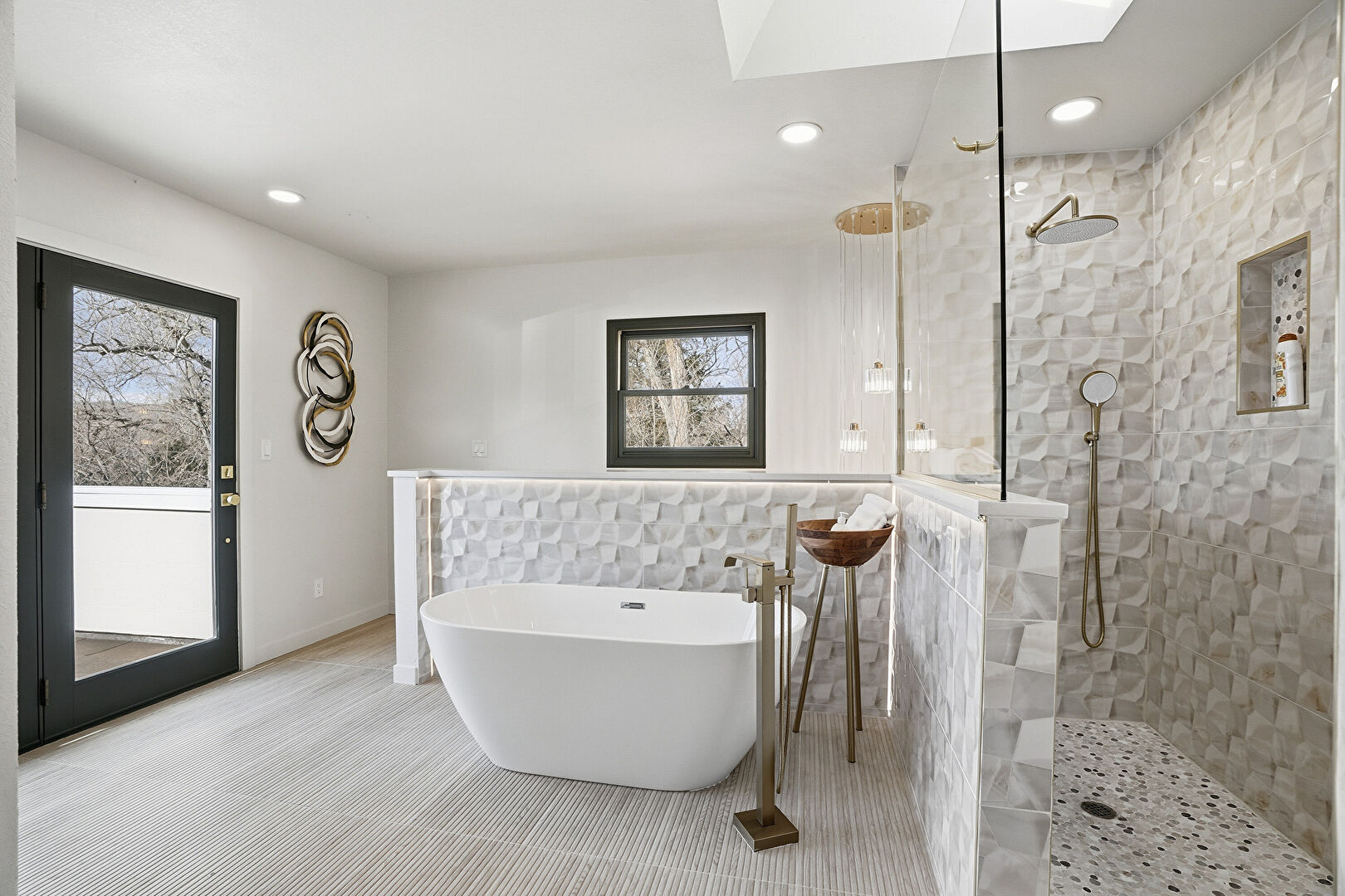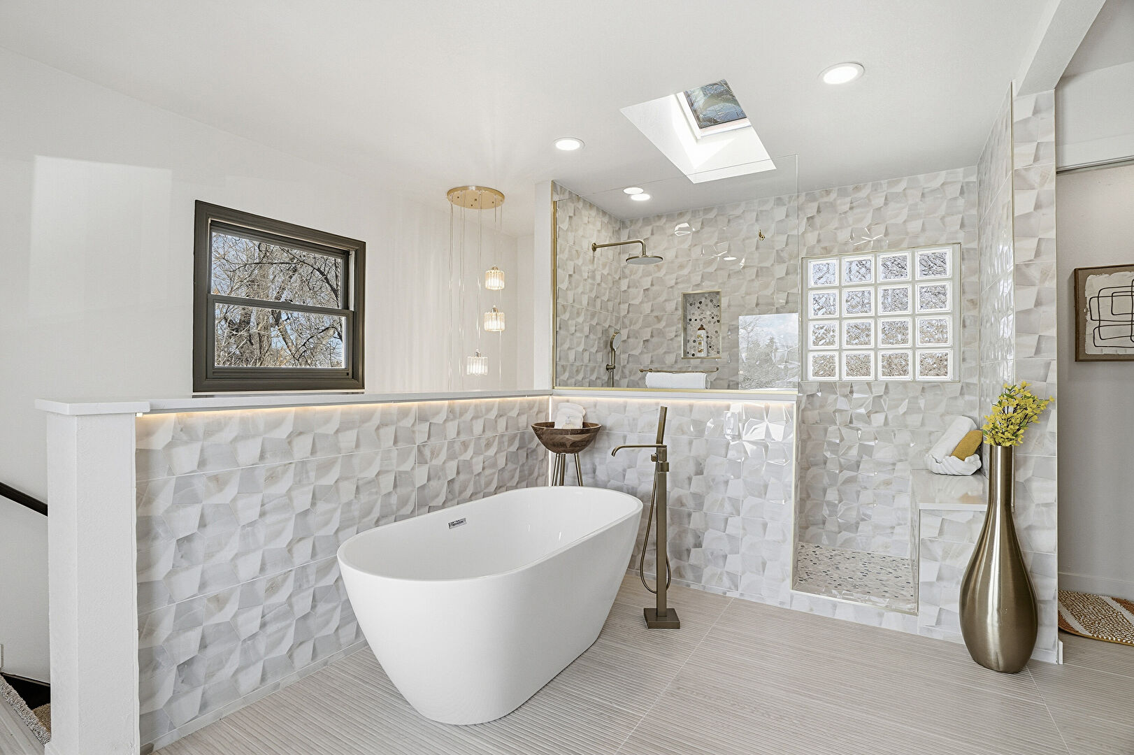 Baseboards Wall, Double Vanity, Drywall, Full Bathroom, Natural Light, Recessed Lighting, Skylight, Tile Floor, Tile Wall, Vanity, Vent, Wainscot Wall, Walk In Closet, Baseboards Wall, Drywall, Natural Light, Recessed Lighting, Skylight, Tile Wall, Wainscot Wall